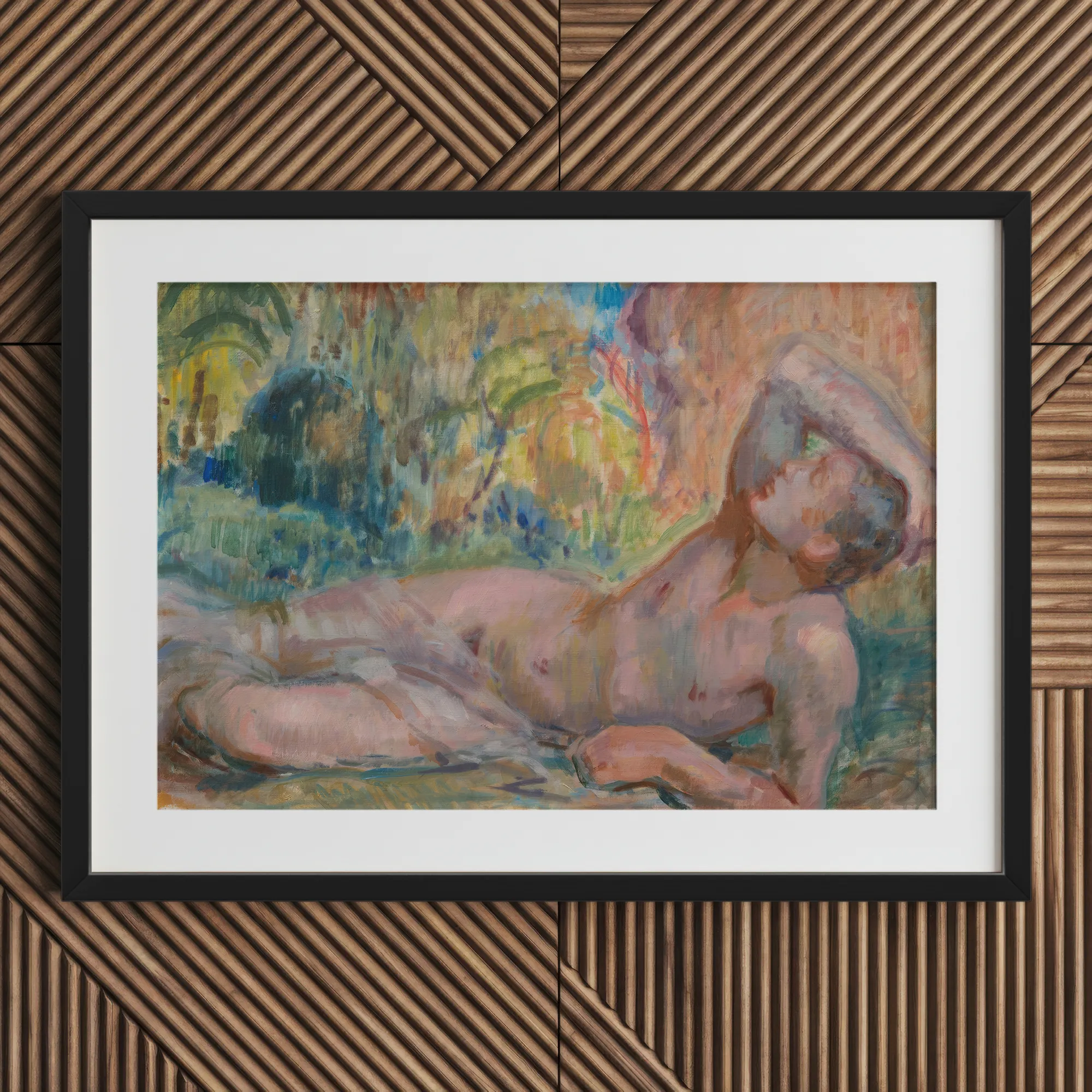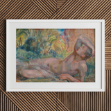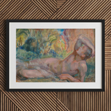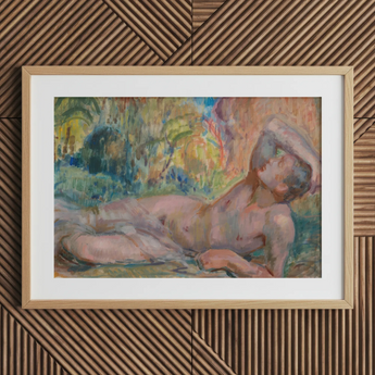 Languide et exposé sous le feuillage agité des bois verdoyants, l'Adonis d'Enckell repose dans les dernières braises du désir mythique. Chair peinte en opalescence, prise entre ruine et rêverie. Sa silhouette rougie d'une lueur sombre. Arc tendrement sur une bande pâle de lin. Évoquant des rites anciens à travers son corps où la beauté ne se fane jamais mais succombe toujours.