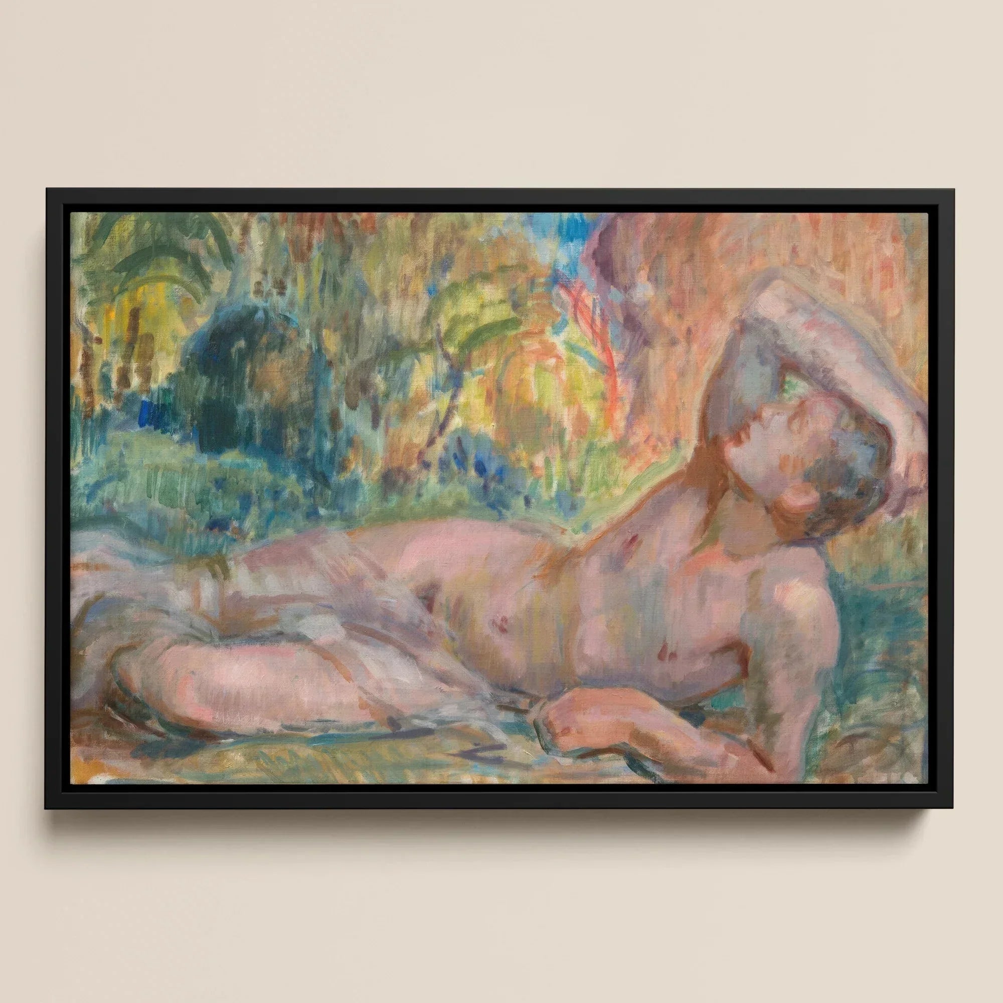 Ici, le pinceau d'Enckell s'enroule autour du silence pâle d'Adonis—non pas une simple relique du mythe ancien mais une ruine incandescente de désir mortel. L'étalement du jeune homme révélant un corps sculpté dans un rose atténué et un azur nuageux. Une douce douleur de couleur frémissant contre le tumulte végétal en ébullition.