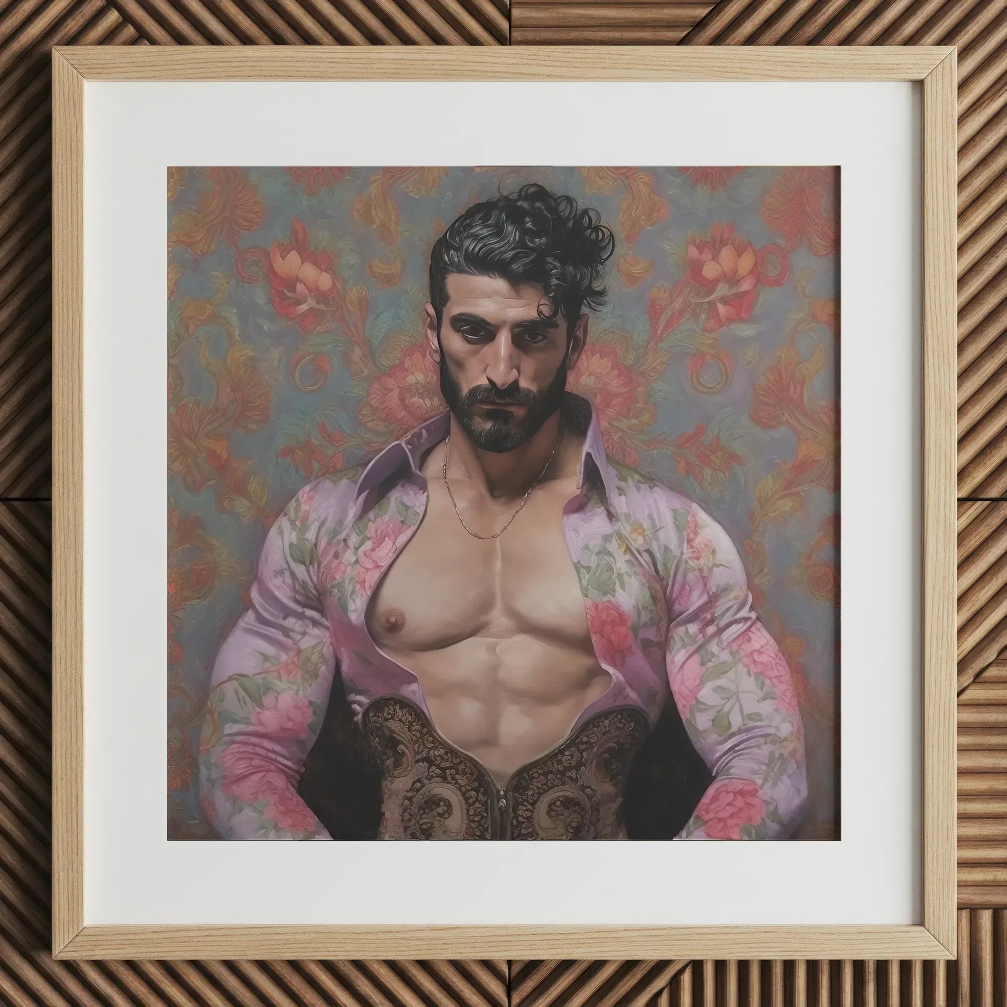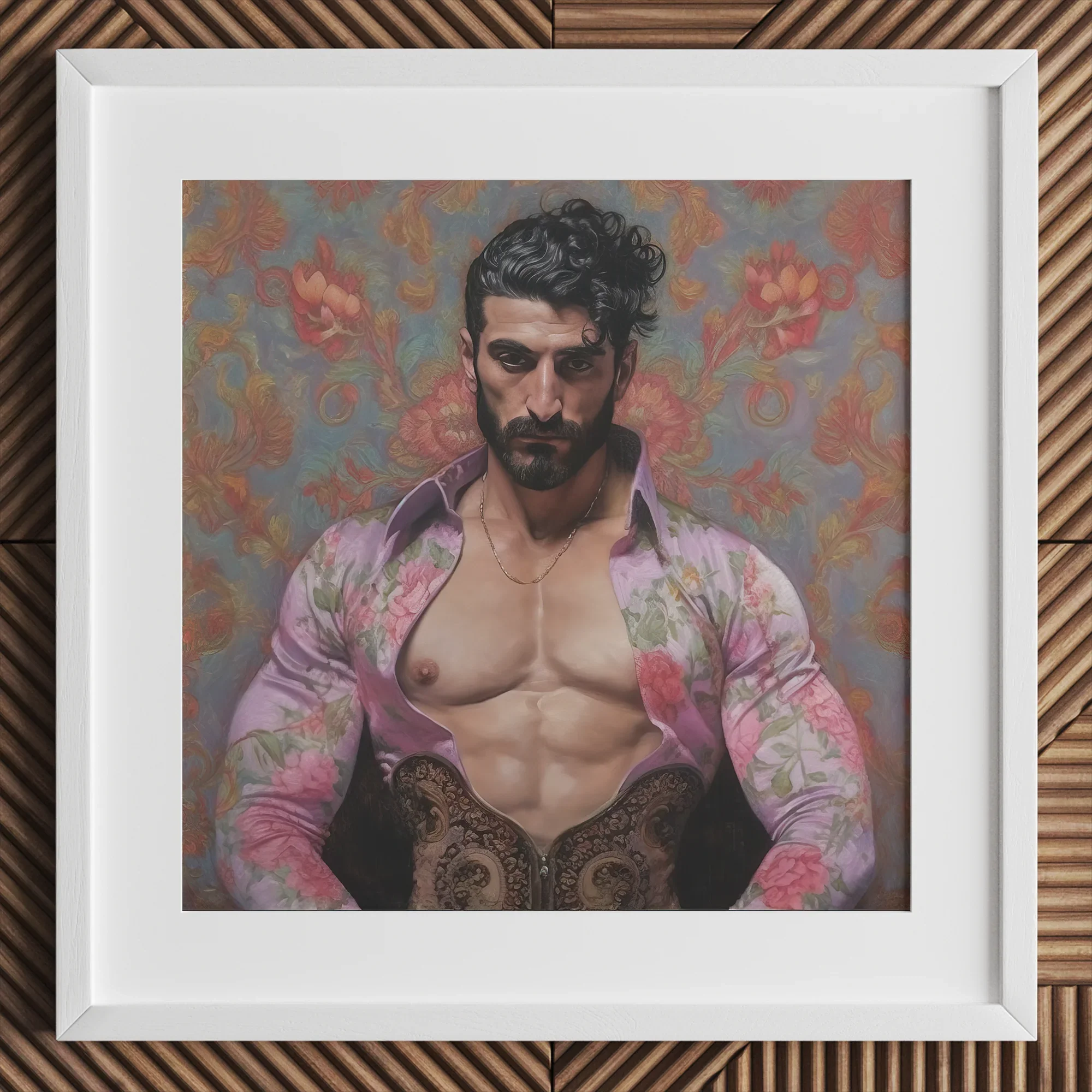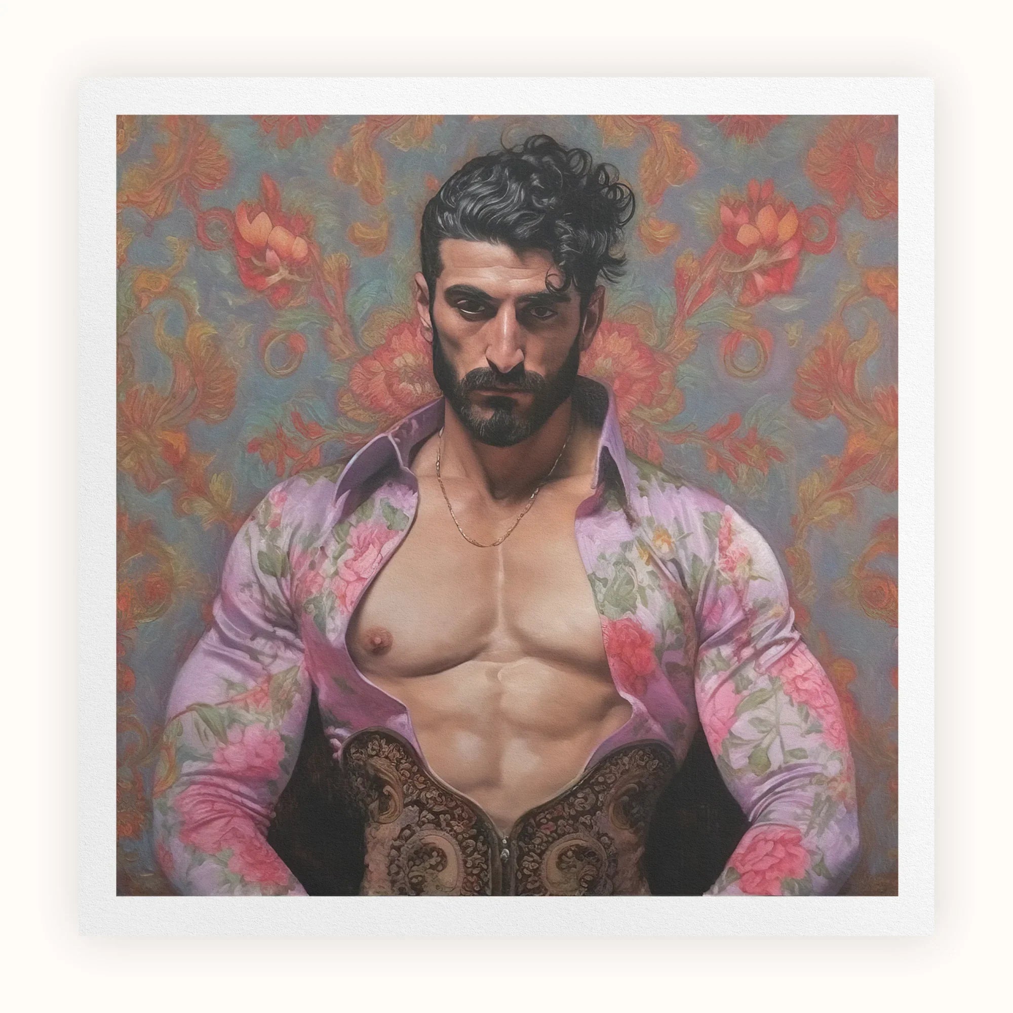 Alonso est un homme d'une beauté robuste avec des cheveux noirs ébouriffés et des yeux perçants. Regardant intensément à travers le cadre, son torse sculpté partiellement exposé sous une chemise florale ouverte aux teintes lavande douces. La juxtaposition des fleurs délicates contre son physique musclé crée une tension captivante entre force et vulnérabilité.