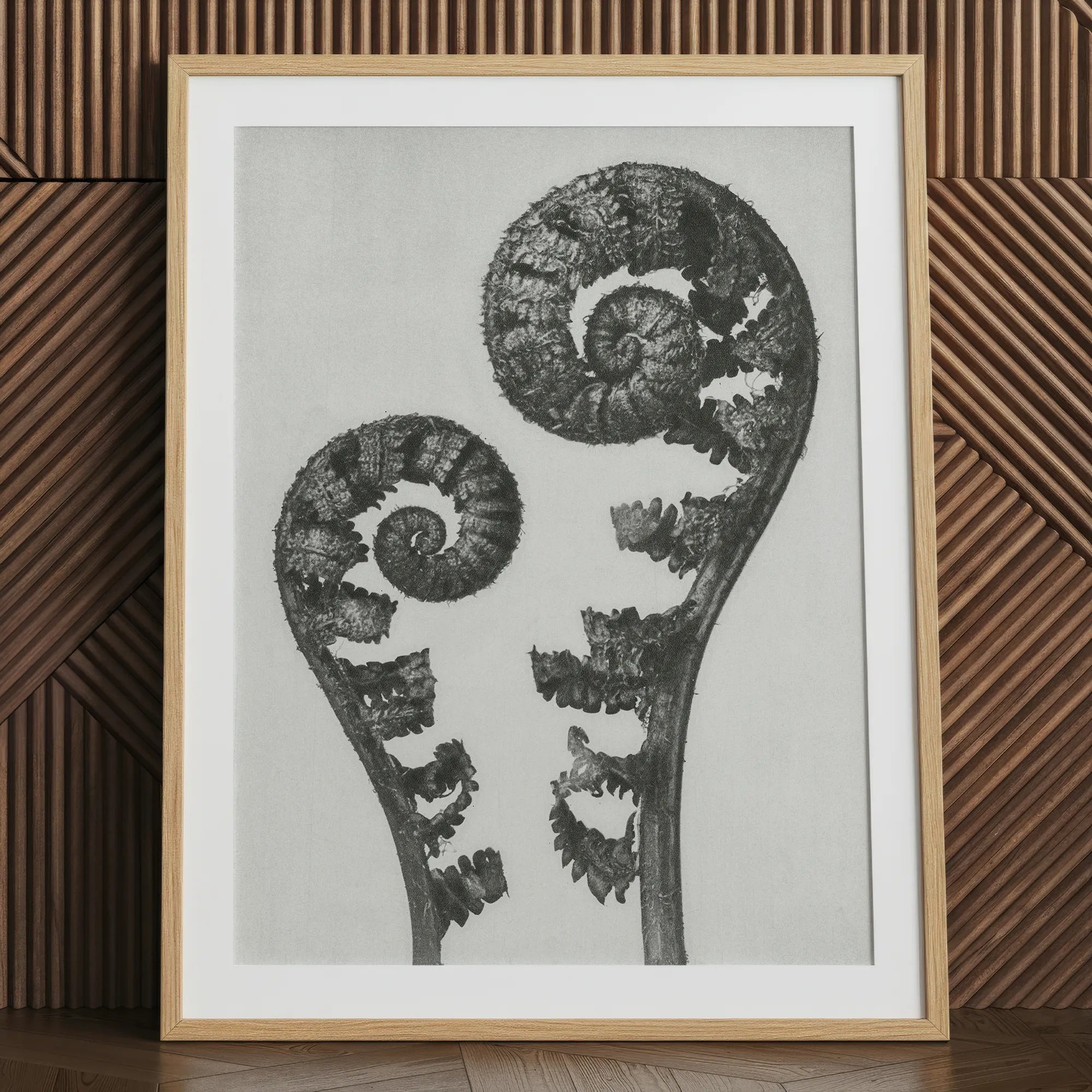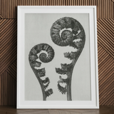 Macro pionnier de Blossfeldt photographie révèle le talent artistique caché de la nature, exposant les structures délicates de la fougère avec une précision scientifique et un flair artistique. Les textures contrastées - des bobines lisses aux bords plumes - créent une interaction captivante de lumière et d'ombre.