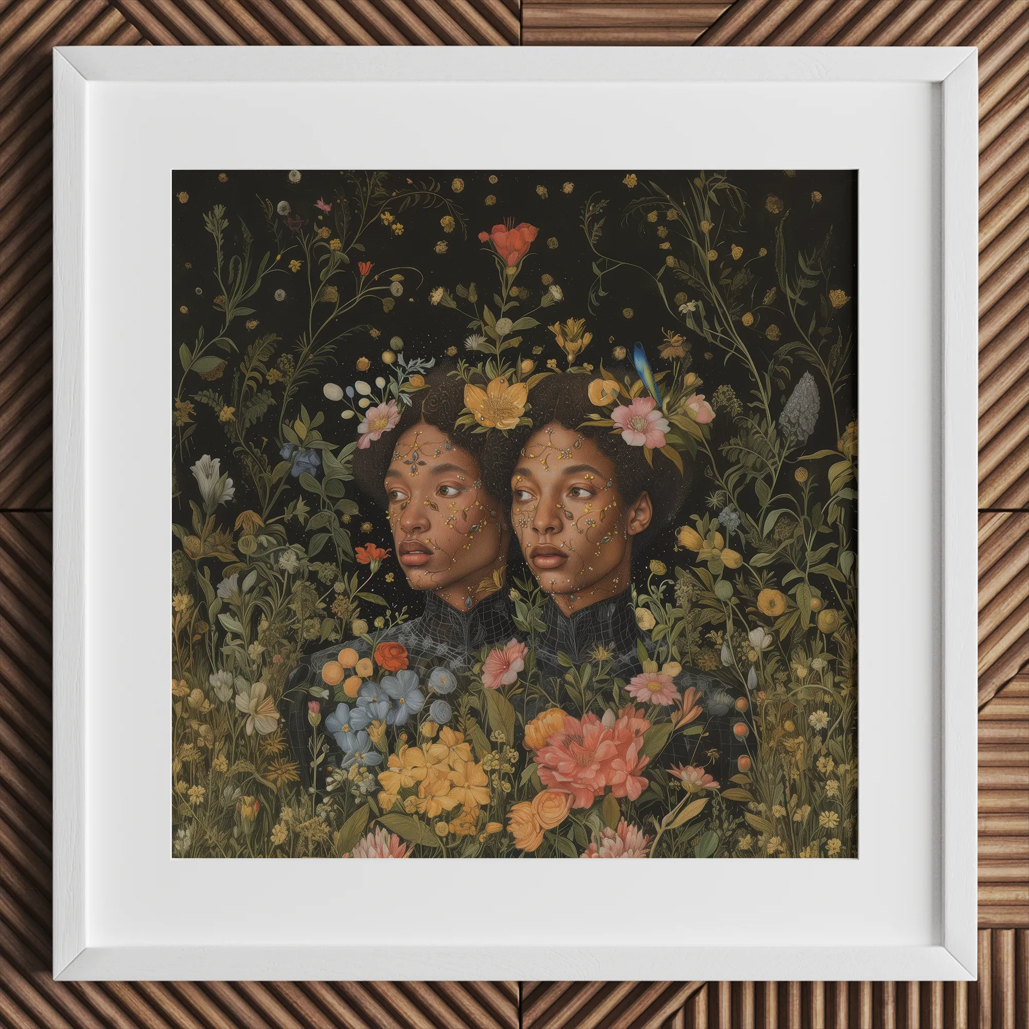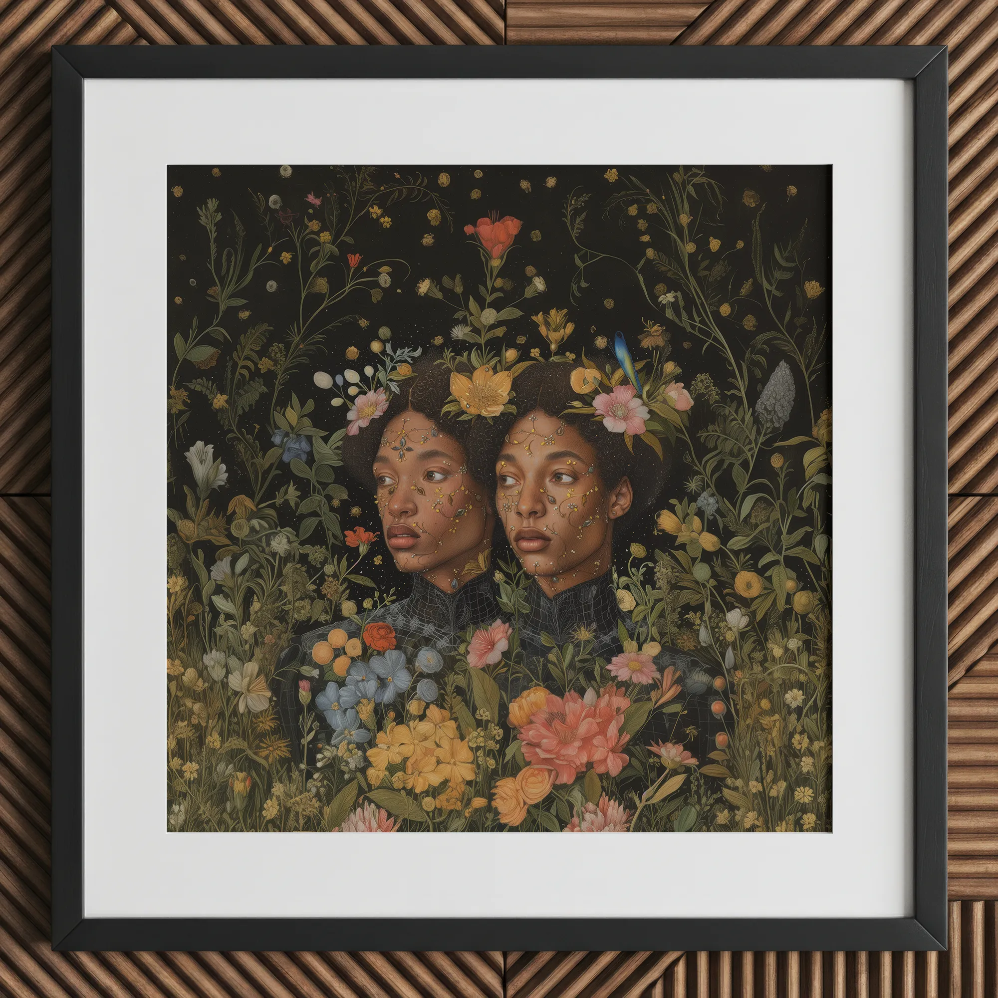 Ceci est plus qu'un portrait—c'est un hymne à la transformation. Des coups de pinceau hyperréalistes de peau sombre brillent contre un abîme de vert profond, tandis que le surréalisme botanique pulse à travers chaque feuille et chaque fleur. Ici, la nature ne décore pas; elle parle, elle revendique, elle couronne. La symétrie de la gémellité plie la réalité, faisant écho à une magie oubliée où l'identité se déploie comme une fleur indomptée.