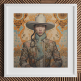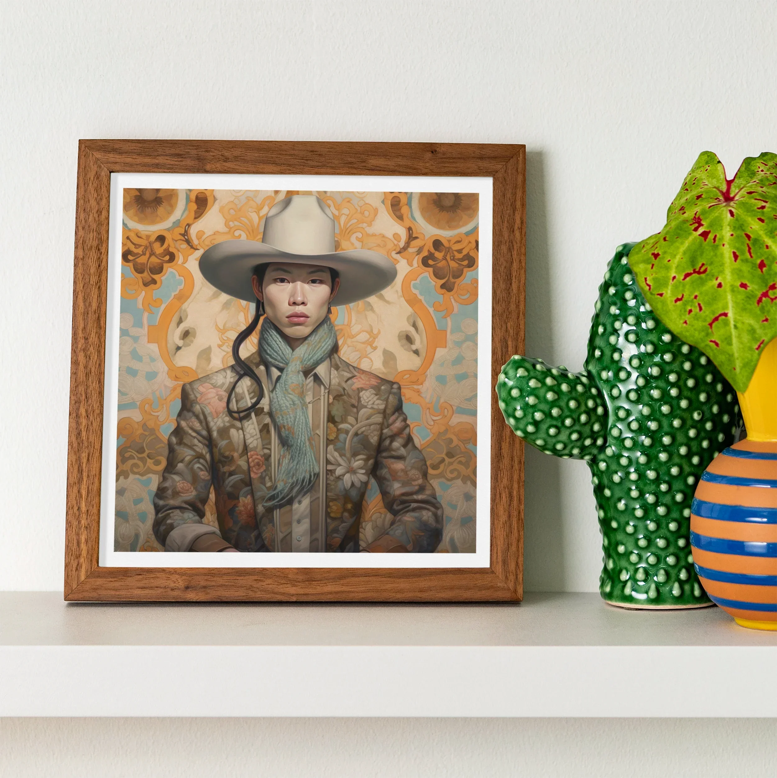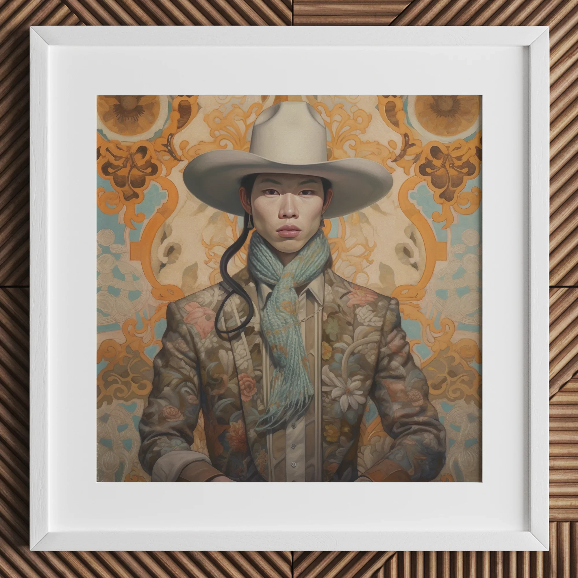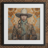 Le Stetson ivoire repose au-dessus de pommettes aussi tranchantes que de la porcelaine de la dynastie Ming, une couronne pour un hors-la-loi qui ne chevauche pas à travers les déserts, mais à travers les couloirs oubliés de l'histoire queer asiatique. Sa veste florale infusée de Tang, épaisse de secrets brodés, le drape dans l'opulence silencieuse de l'exil. Pas un déguisement—jamais cela—mais un héritage, cousu avec la nostalgie de ceux qui sont venus avant : les dandys de Shanghai qui arpentaient le Bund, les stars queer de l'opéra cantonais qui brouillaient les lignes de la beauté, les poètes vêtus de Hanfu qui écrivaient des lettres d'amour à l'encre qui refusait de s'effacer.