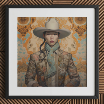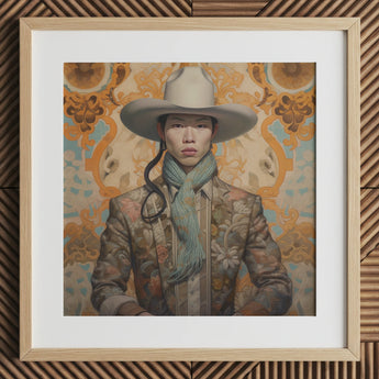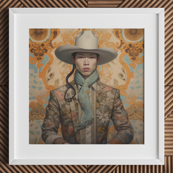Baihu n'a jamais été destiné à être un fantôme, pourtant l'histoire a essayé de le rendre tel. Un cowboy chinois gay, pris entre la soie et le cuir de selle, entre le silence d'un rêve de brocart Chinoiserie et la poussière d'une frontière méconnue. Leur regard peint à l'huile refuse d'être effacé—audacieux, irréductible, un défi et une élégie en un.