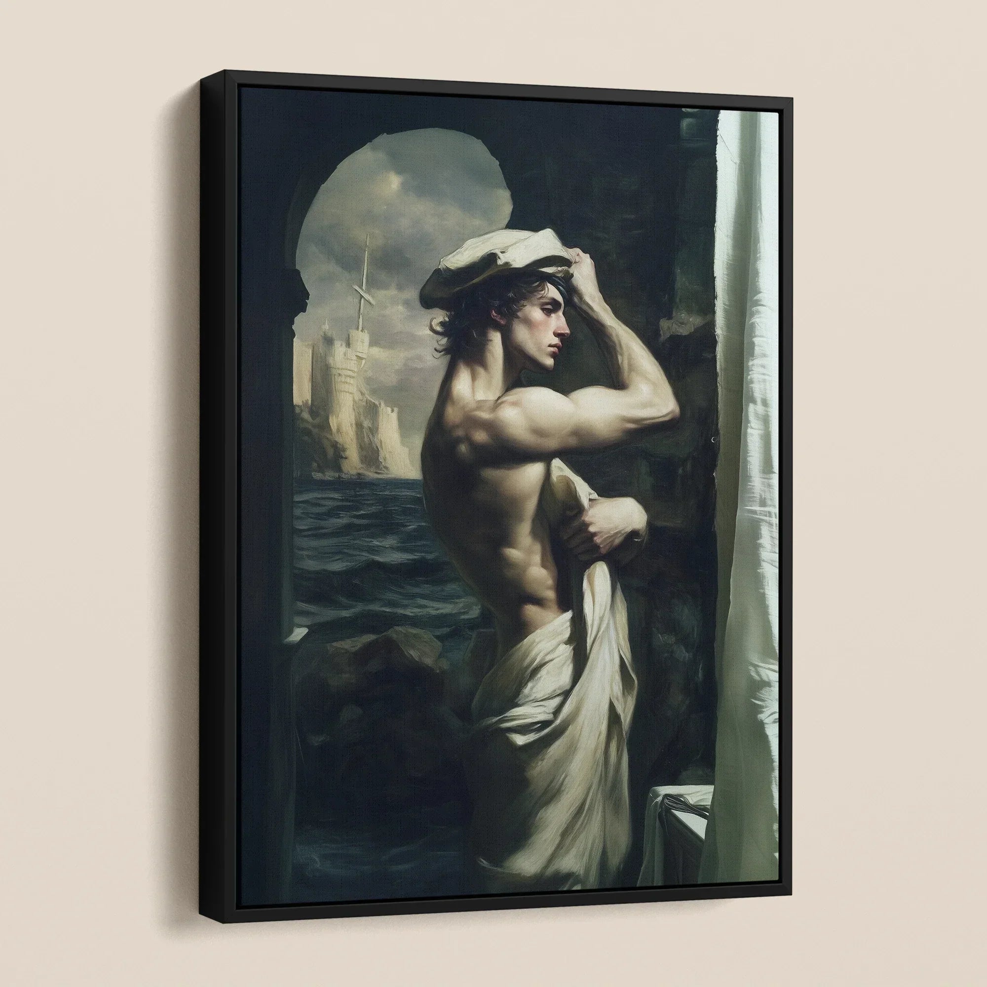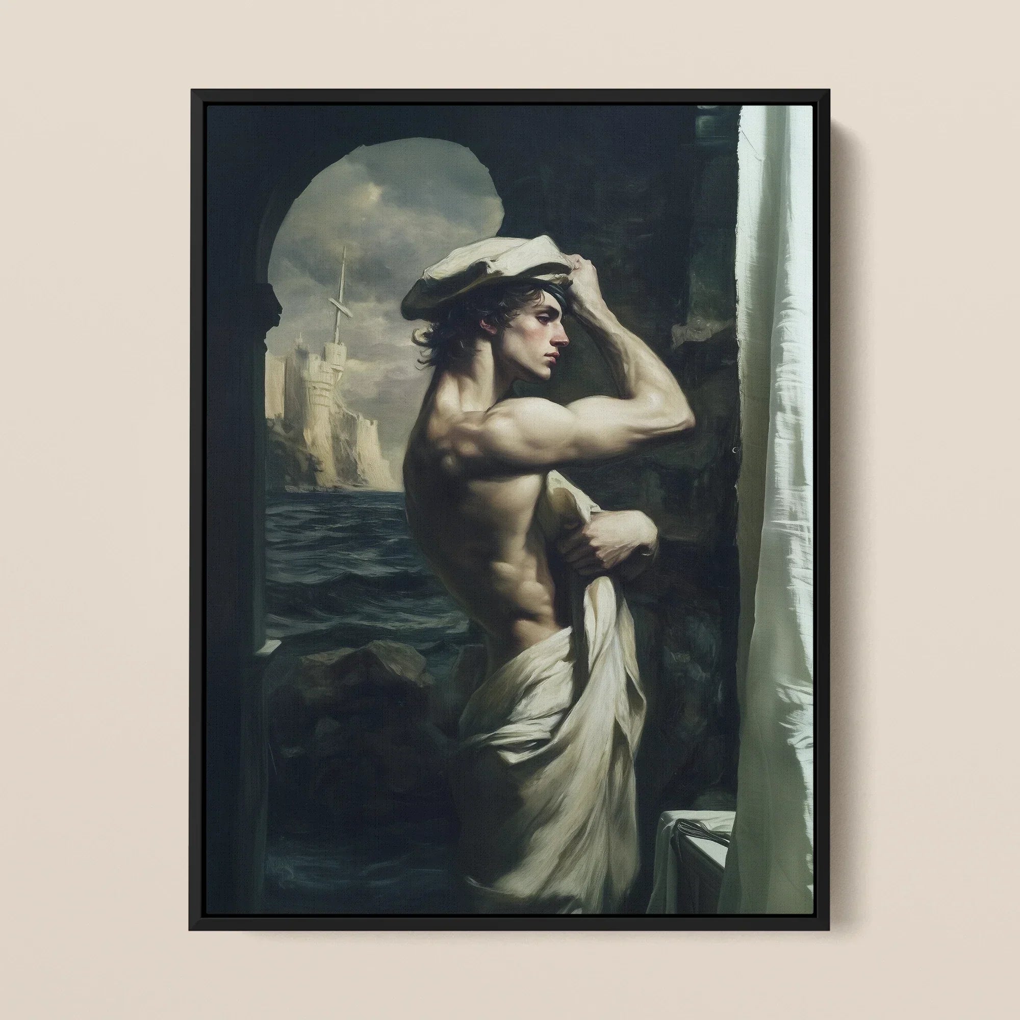 Cette peinture néoclassique homoérotique parle dans des dialectes inavoués du désir, où l'identité queer émerge à travers l'huile et la lumière. Les muscles, tendus comme des haubans, brillent sous l'étreinte du clair-obscur. Son torse nu, une étude de tension et de tendresse, défie la masculinité traditionnelle—un nu masculin érotisé qui défie la toile elle-même. Derrière lui, les eaux battues par la tempête s'écrasent contre la pierre, une métaphore de l'amour, de l'exil, et de la douleur de la découverte de soi.