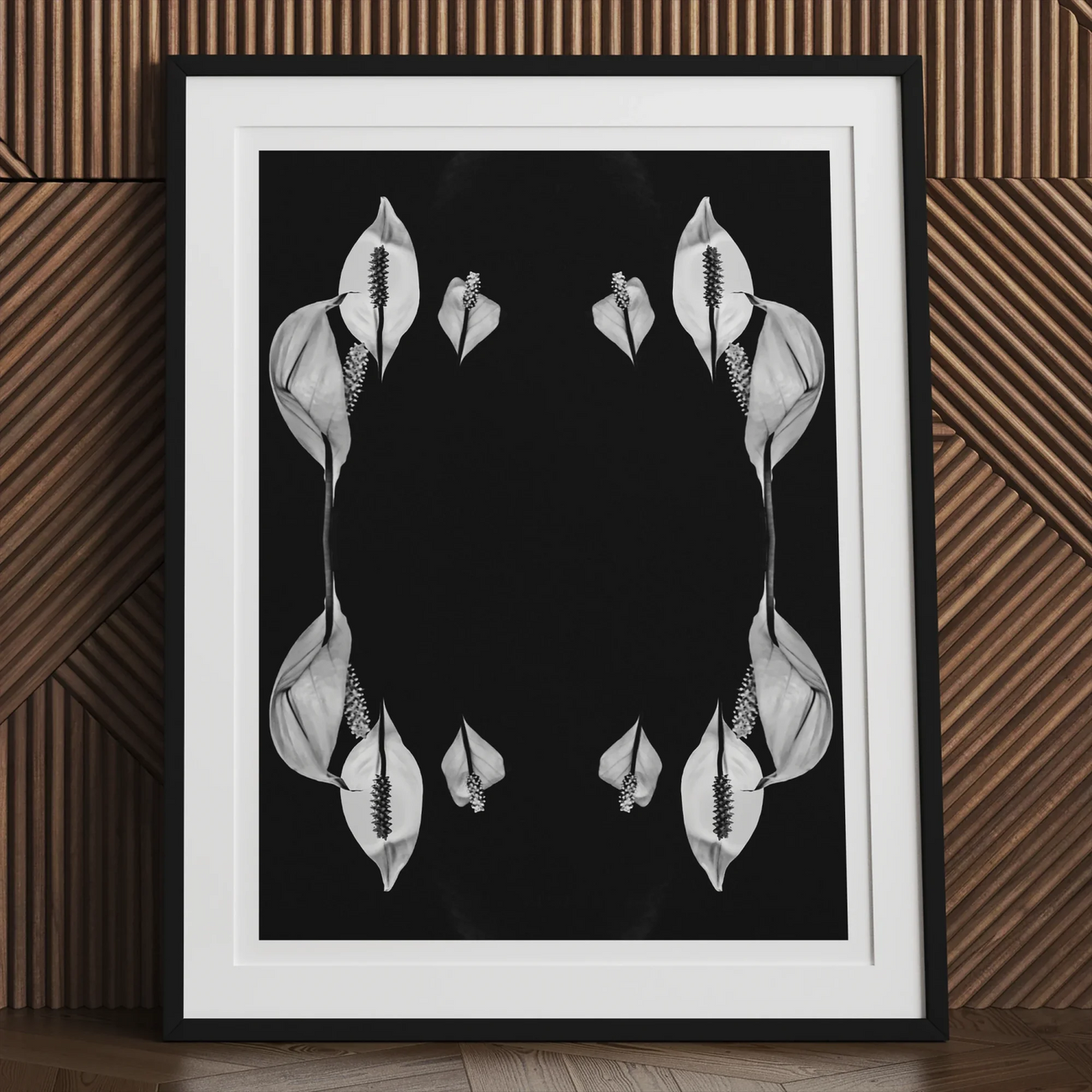 Dans la veine de Karl BlossfeldtLes portraits végétaux pionniers, cette pièce magnifie l'architecture de la paix de Lily, transformant ses étamines et pétales délicats en un mandala symétrique. La technique du chiaroscuro à contraste à contraste isole chaque floraison contre un vide d'encre, prêtant une aura d'un autre monde vers cette plante d'intérieur commune.