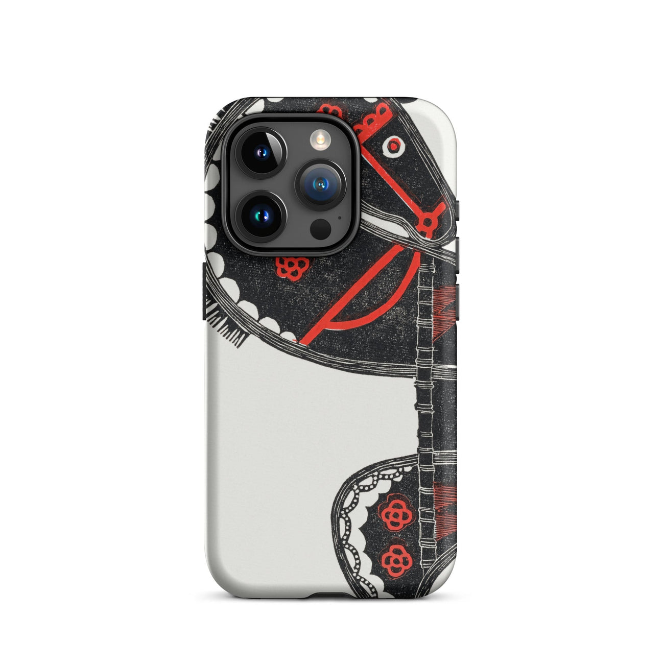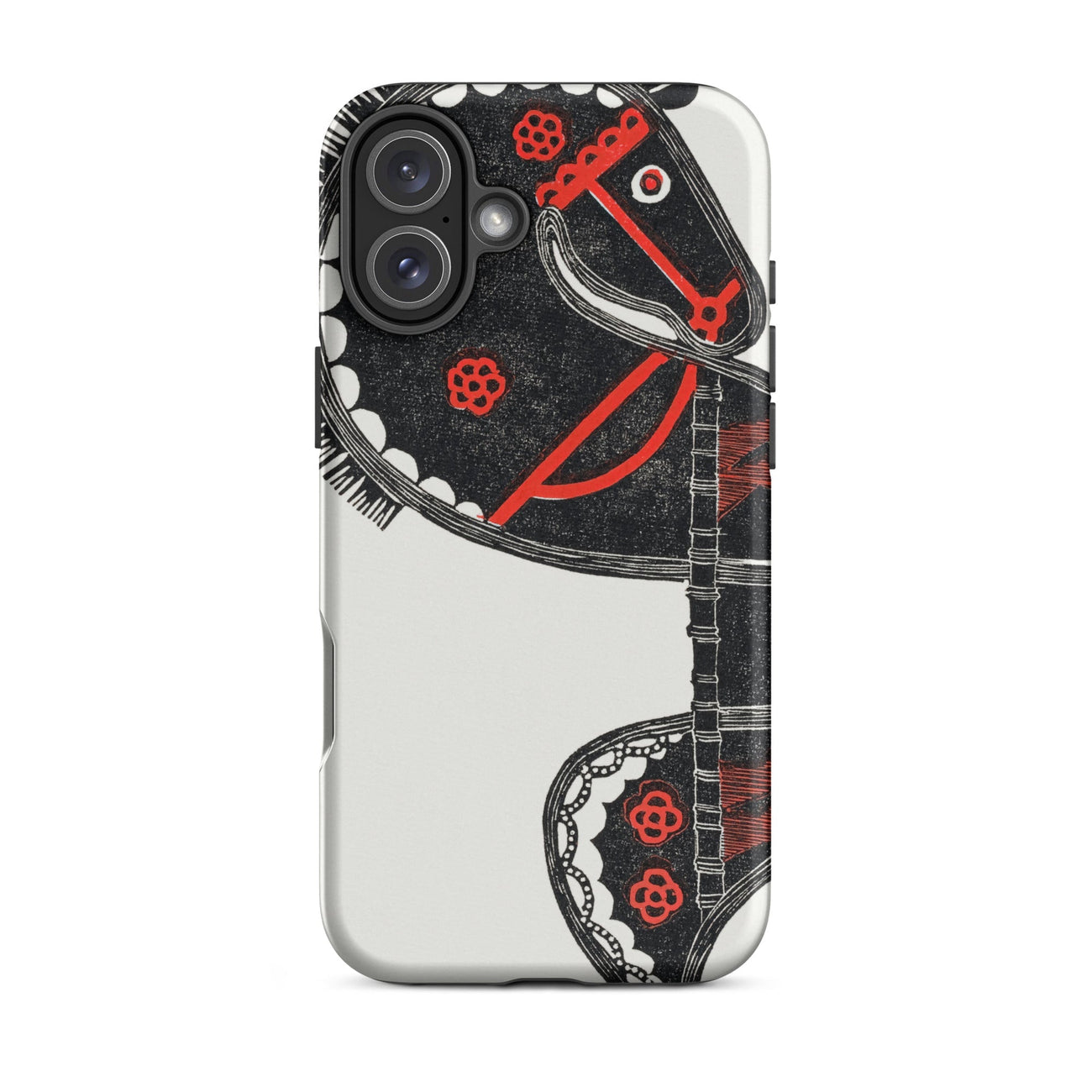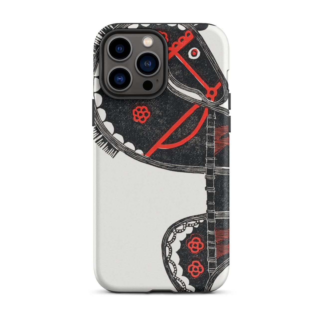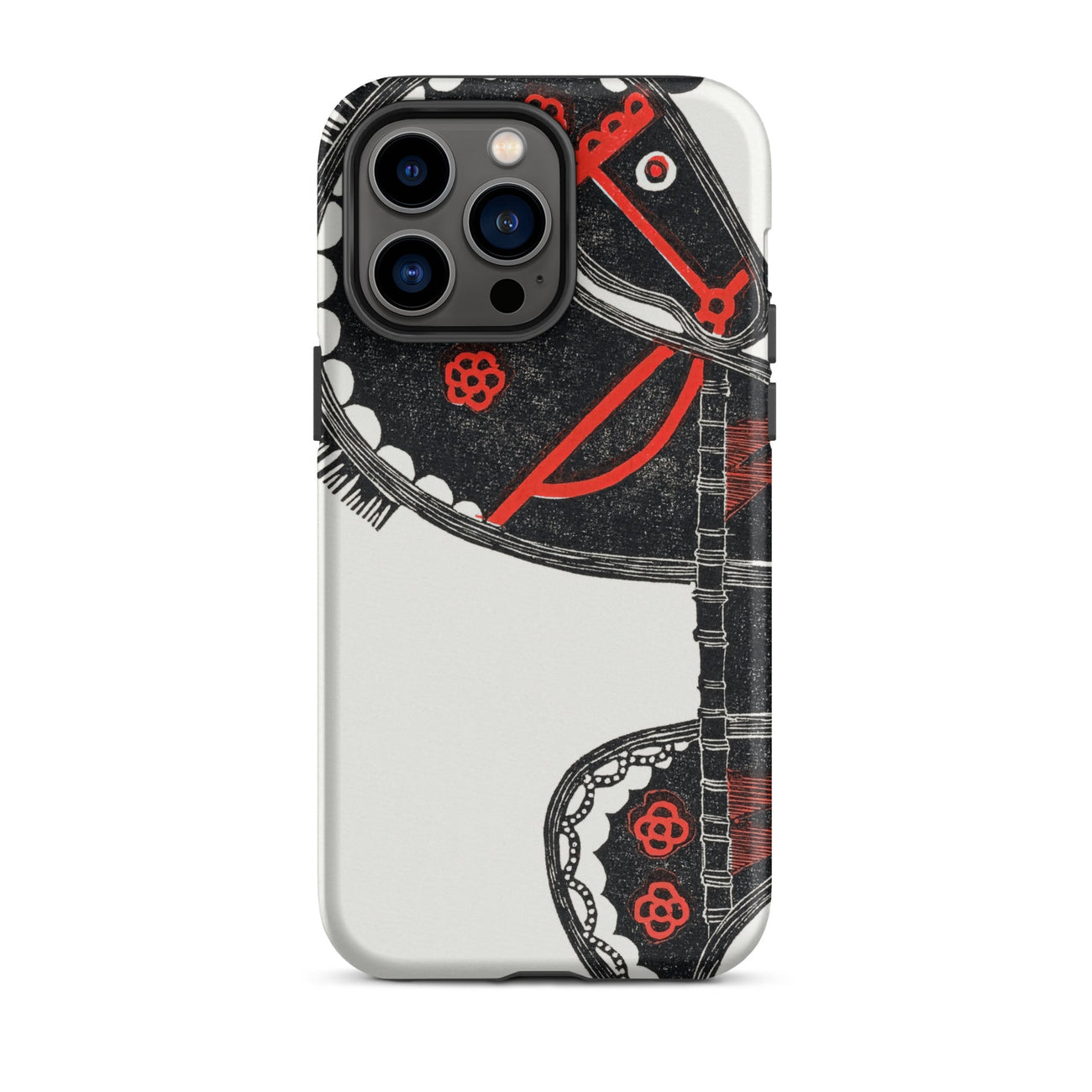 Cette coque protectrice transforme votre appareil en une toile de rébellion culturelle, où un cheval cérémonial danse sur un blanc éclatant, sa forme sculptée en lignes noires d'encre et ornée d'accents rouge vif.