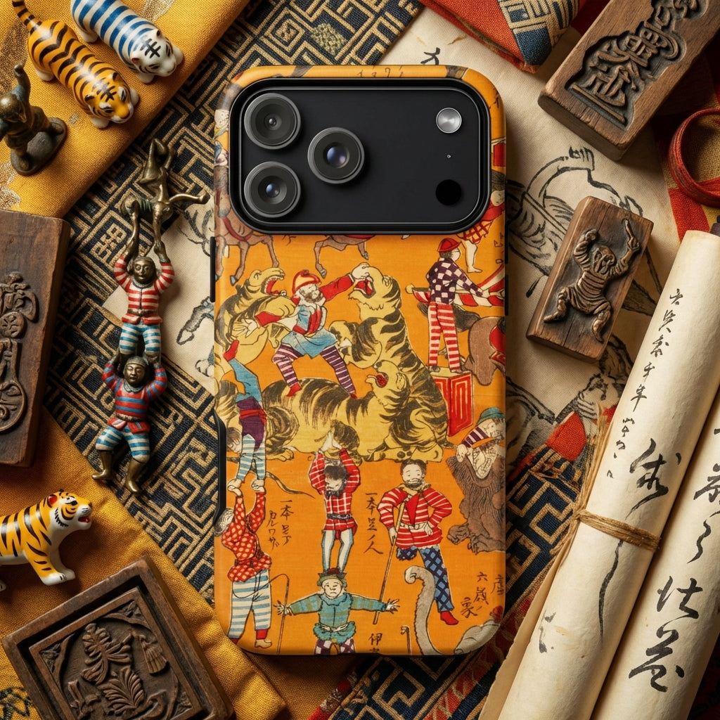 Libérez un spectacle de poche avec ce cirque Daikyokubam iPhone Cas, vous transportant aux délices vertigineux du Japon en 1871. Cette merveille ukiyo-e capture le Meiji La fascination de l'ère pour les cirques occidentaux, rendant une frénésie kaléidoscopique d'interprètes sur une toile baignée de soleil.