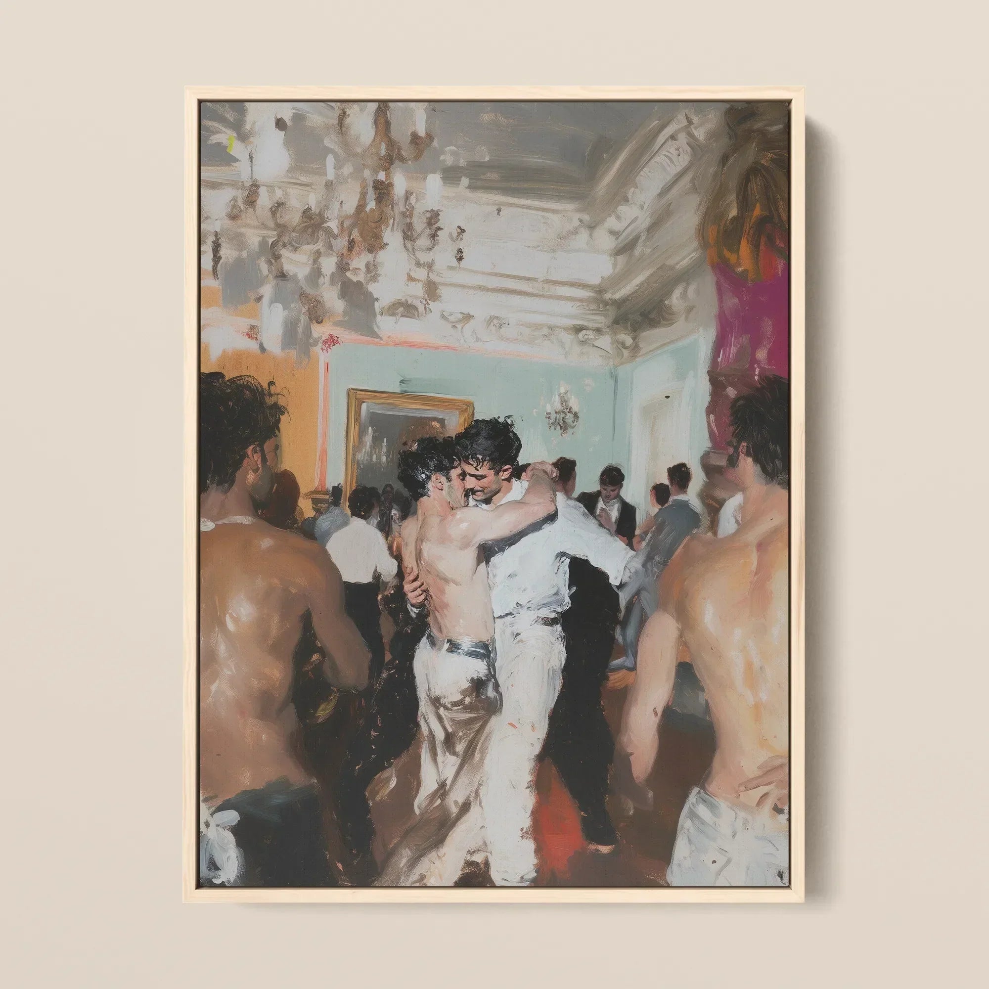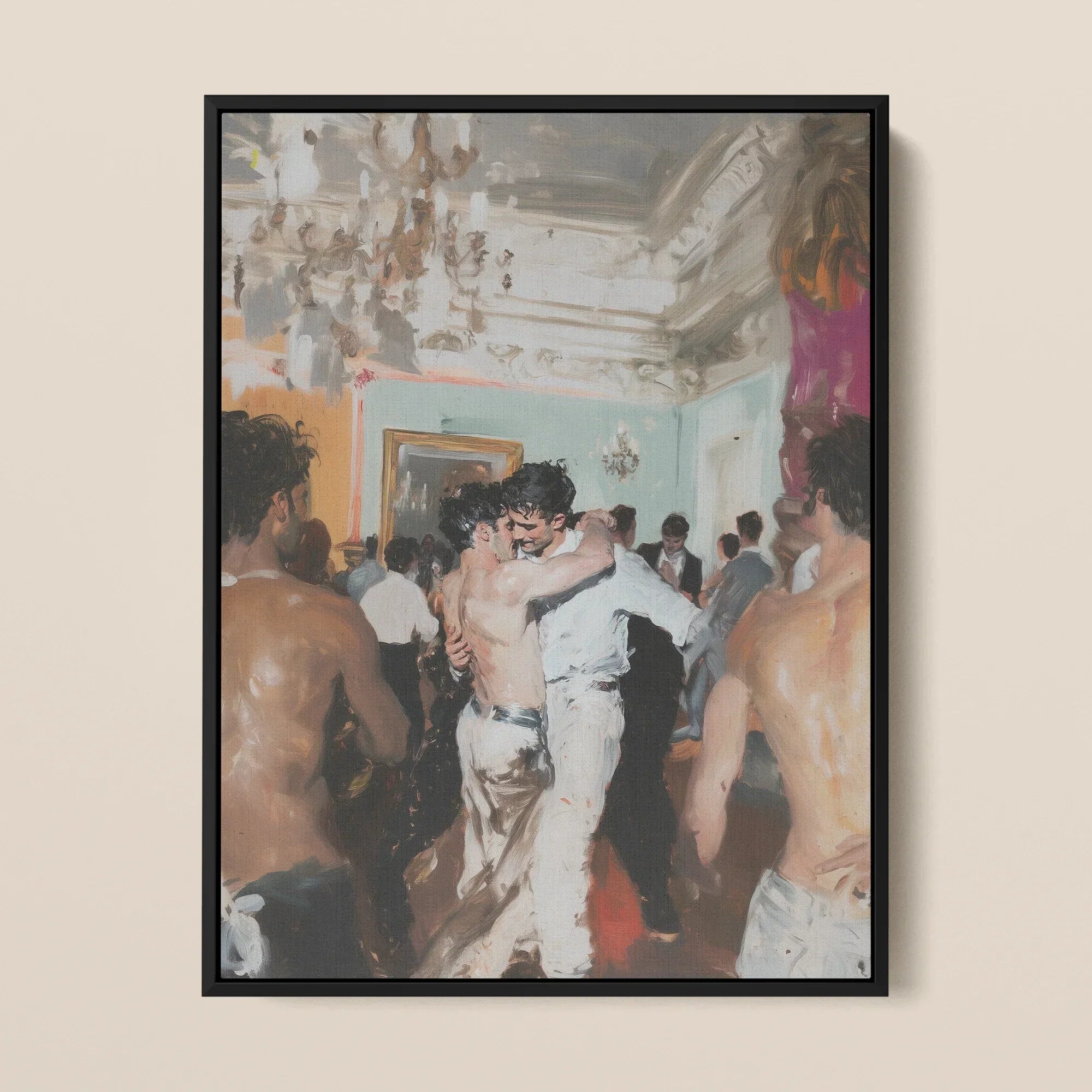 Ce n'est pas du romantisme. C'est ce que le romantisme n'a pas réussi à imaginer : un portrait érotique queer qui se mutine contre le goût tout en le séduisant. Vulgaire ? Seulement si le désir est vulgaire. Vieille richesse ? Seulement les os de la pièce. Gays ? Plus que ça—ils sont des dieux d'un nouveau mythe. Peints dans la rébellion, encadrés dans l'abandon imprudent.