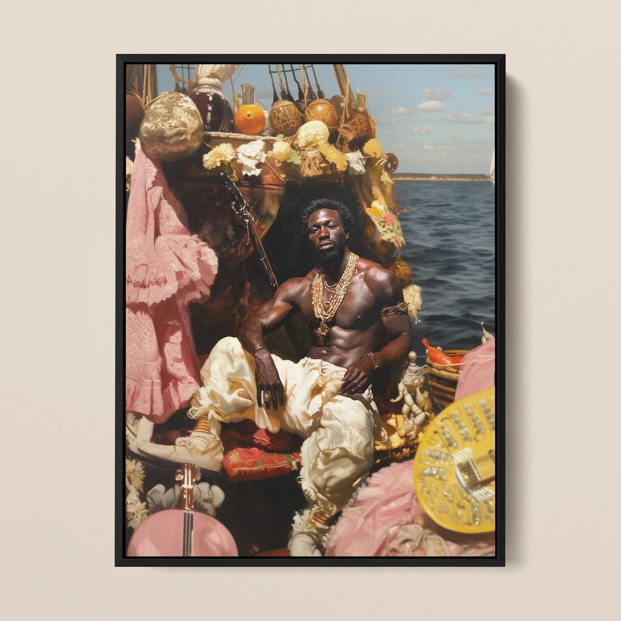 Le navire n'est pas un vaisseau de conquête, ni ne transporte de richesses volées. Au lieu de cela, il regorge de reliques d'un monde qui a autrefois cherché à l'oublier—des luths ornés, des tissus brodés, tous illuminés sous le soleil comme des offrandes sur un autel. Un héritage queer et royal récupéré. L'opulence nautique drapant chaque surface—la grandeur maritime réimaginée à travers une lentille afro-futuriste. L'horizon s'étendant derrière lui, infini comme son histoire, son étendue bleue murmurant des voyages à travers la résistance gay dans l'histoire maritime, des empires construits non pas par la violence mais par la beauté elle-même.