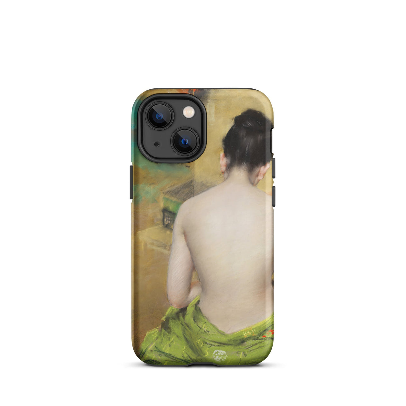 Enveloppez-vous dans l'attrait sensuel de la maîtrise audacieuse des pastels de Chase avec cette coque iPhone. Régalez vos yeux avec la peau lumineuse du modèle, une symphonie de tons chair qui scintillent sur un fond doré. La composition audacieuse de Chase vous plonge dans une proximité intime avec le dos nu du sujet, un clin d'œil provocateur aux estampes ukiyo-e d'Utamaro.
