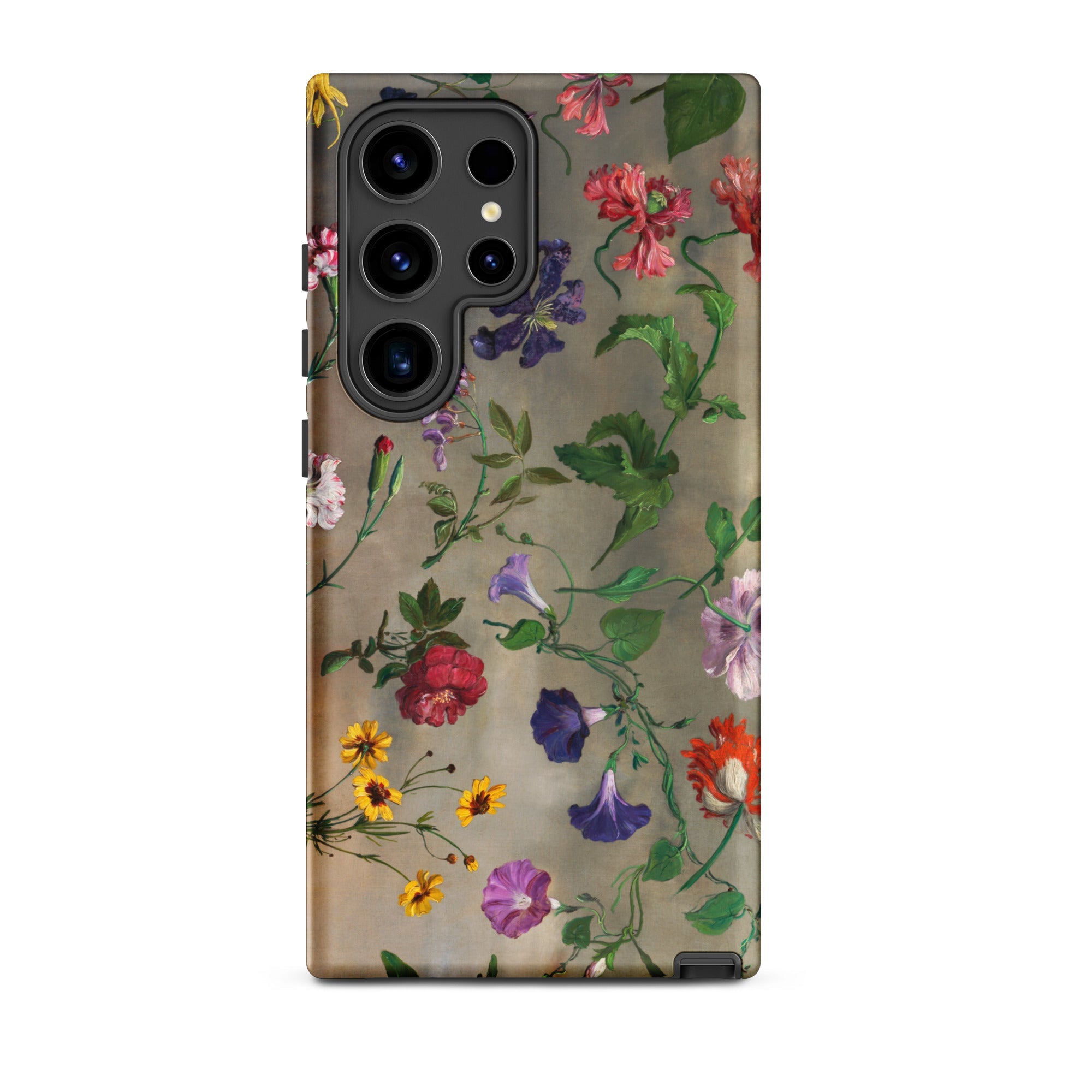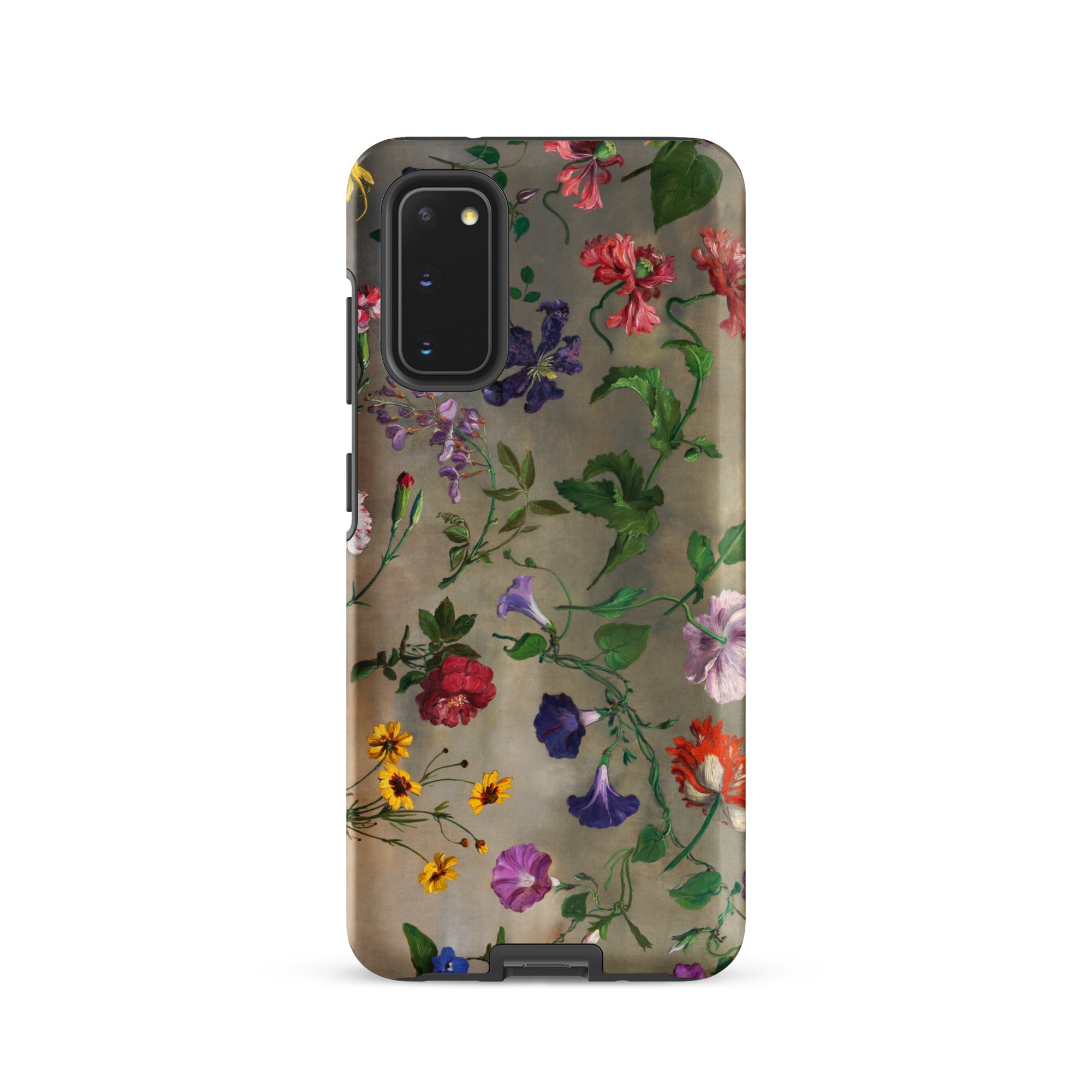 La précision botanique de Jacques-Laurent Agasse transforme chaque pétale en une étude de peintre—chaque veine, ombre et variation chromatique vibrant d'un art du XIXe siècle. Cette coque Samsung capture le charme d'archive de l'huile sur toile, mêlant naturalisme et romance ornementale. Les rouges se fondent dans les violets, les verts grimpent en arabesques agitées, un jardin libéré de la terre.