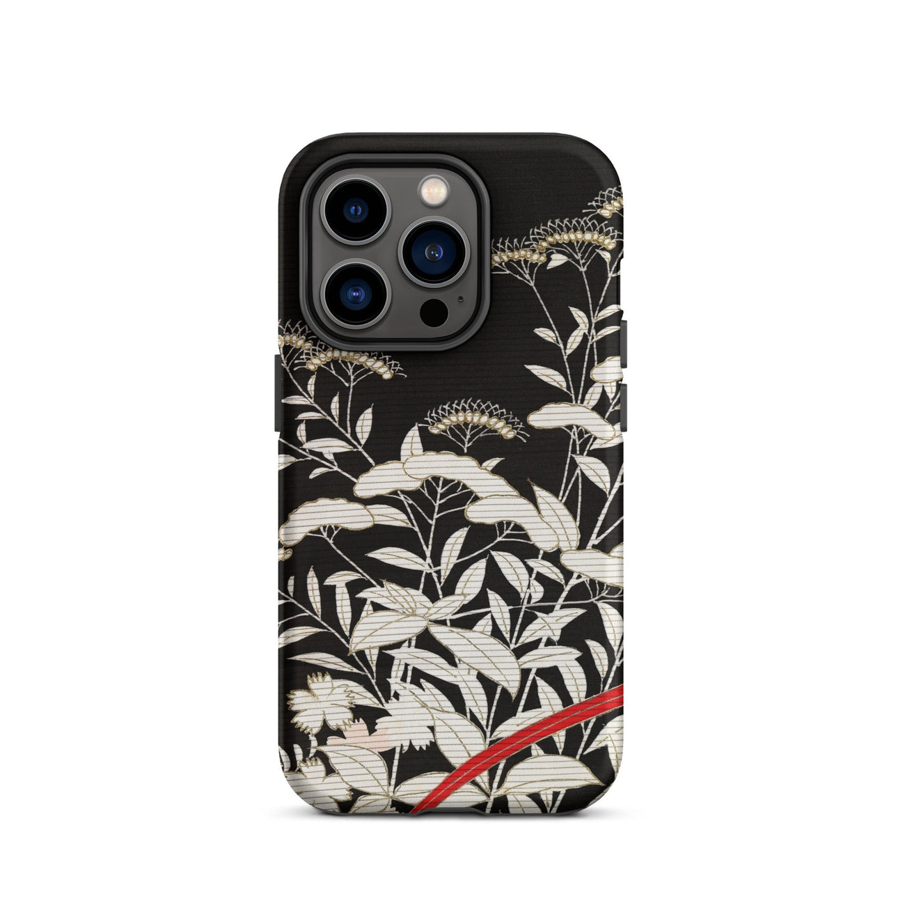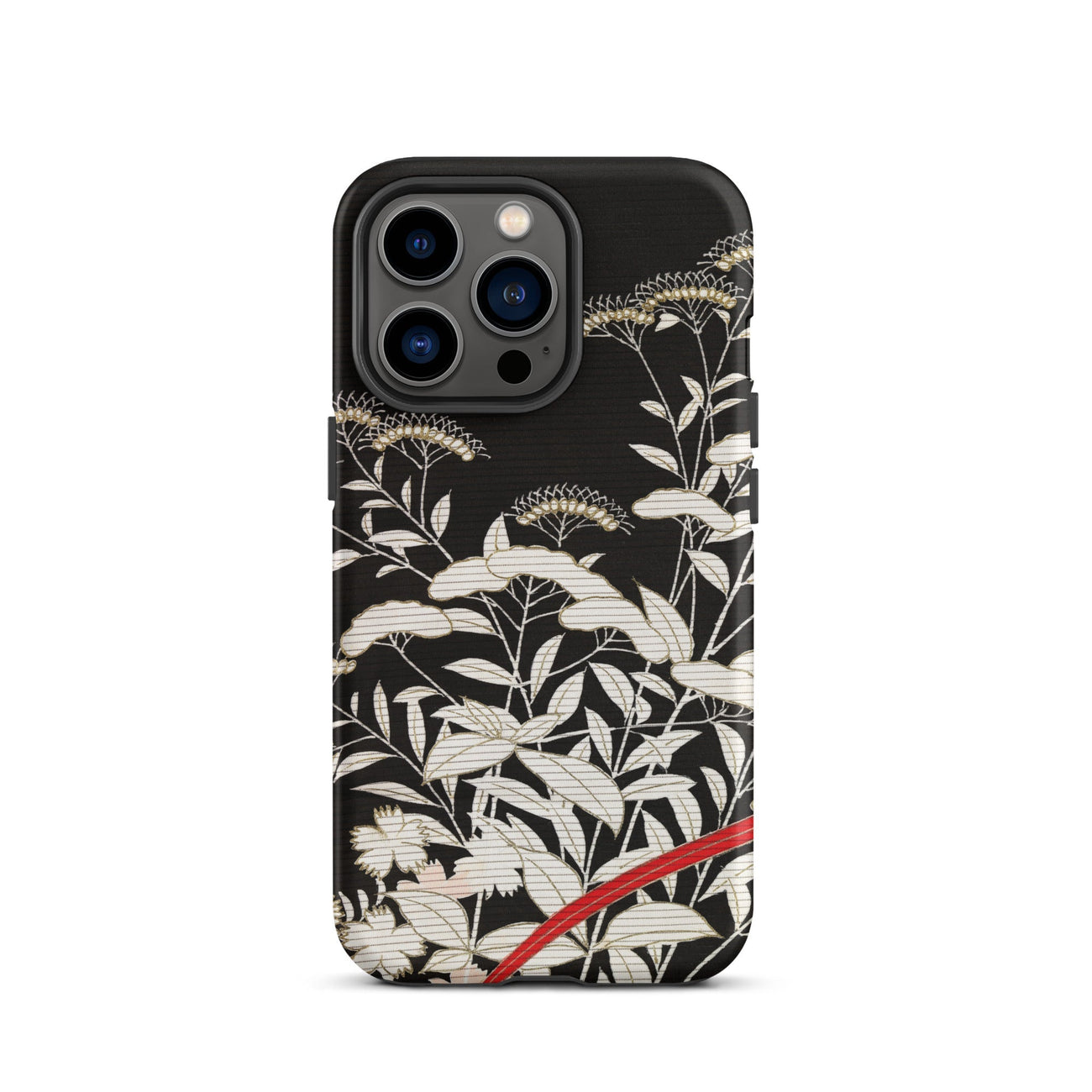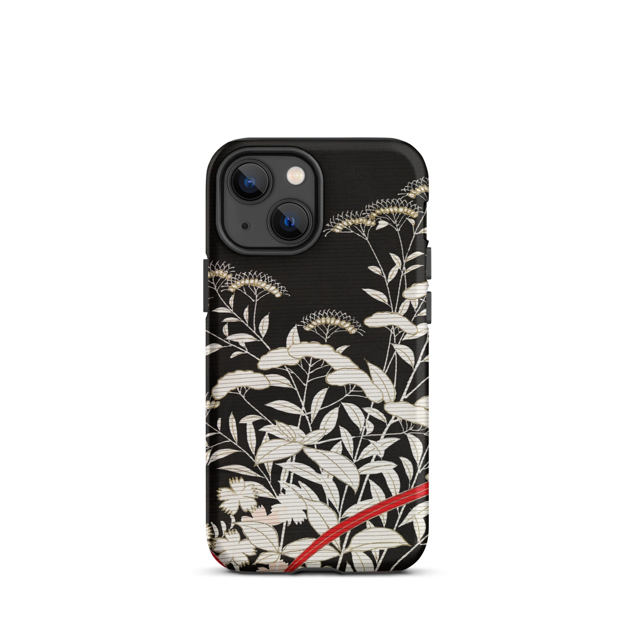 Un silence de soie de minuit, un jardin pressé dans le temps—cette coque d'iPhone se déploie comme un fragment d'un kuro-tomesode, où l'élégance du kimono le plus formel du Japon rencontre le murmure discret du dernier souffle de l'automne. Des chrysanthèmes ivoire, leurs pétales bordés d'ombre, s'élèvent comme des fantômes de l'obscurité, leurs tiges enlacées de miscanthus, d'ominaeshi et de lierre—chaque feuille un syllabe chuchotée dans un poème ancien. Un arc écarlate traverse la composition, l'écho de l'aile d'un faisan, une trace de mouvement éphémère sous l'immobilité de la teinture yuzen peinte.