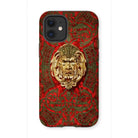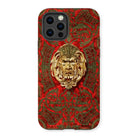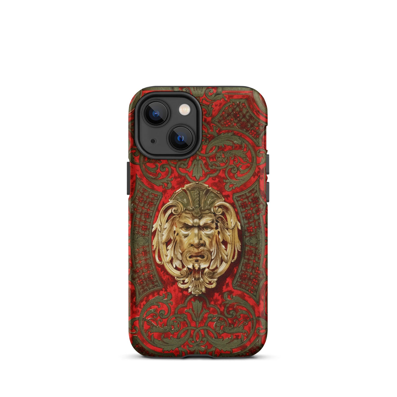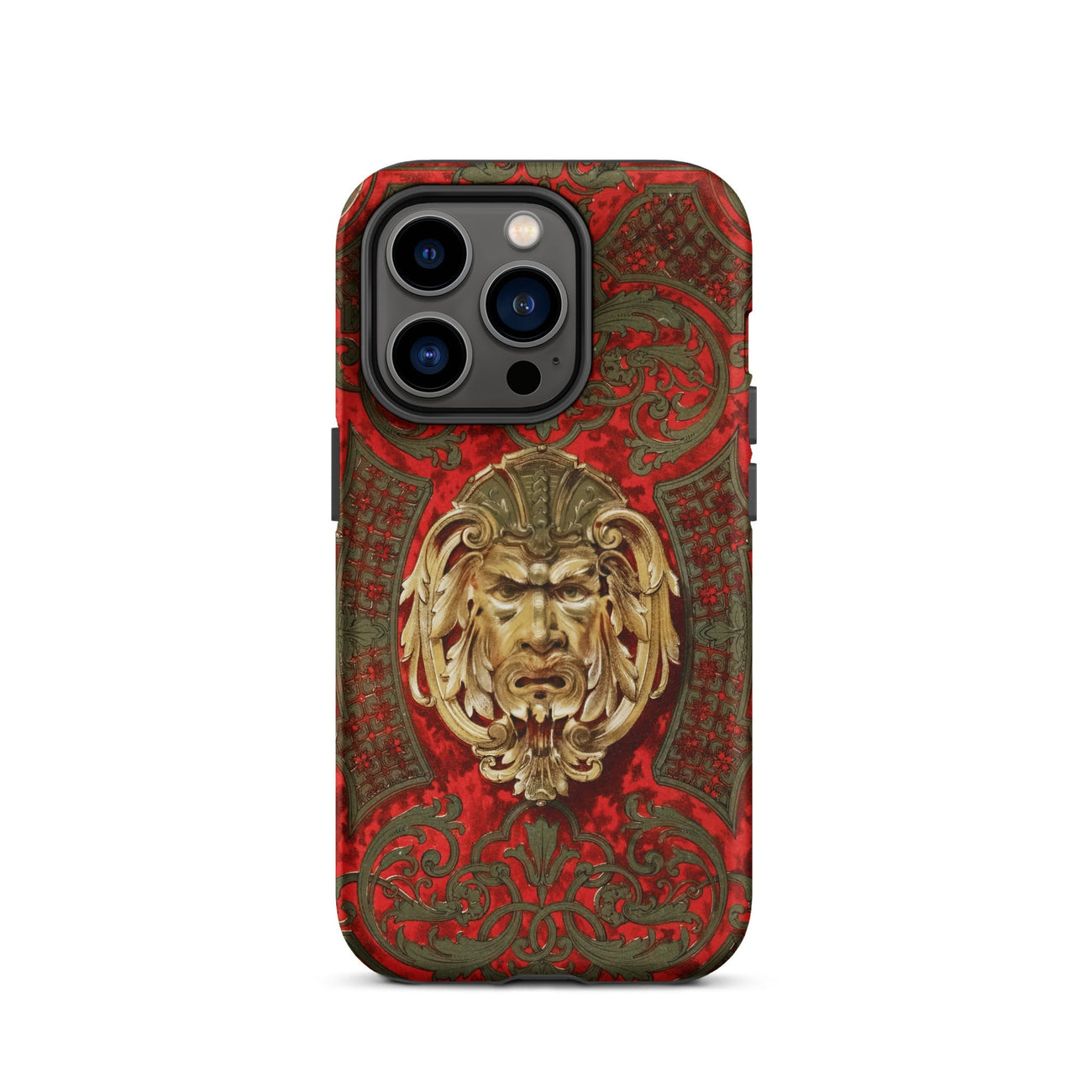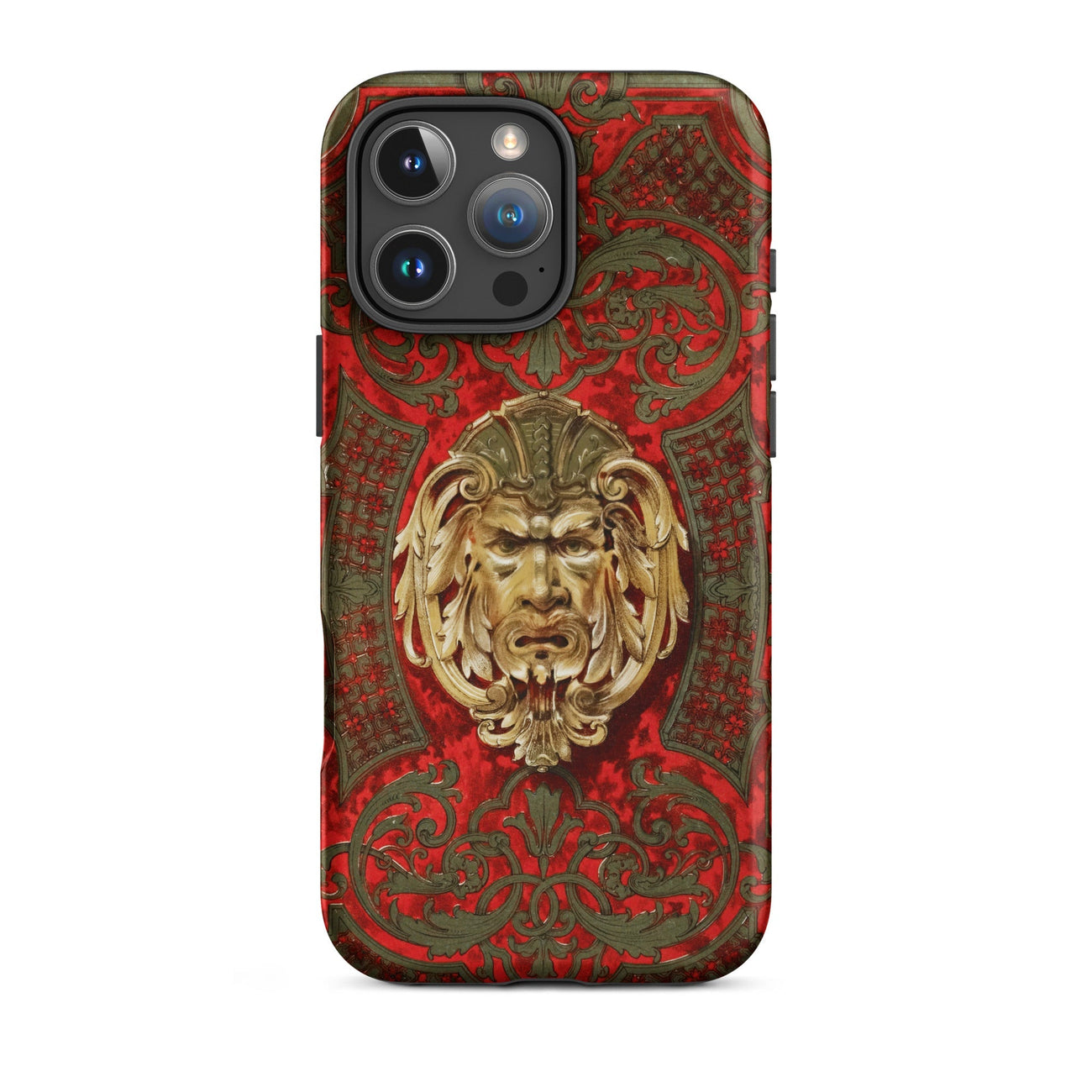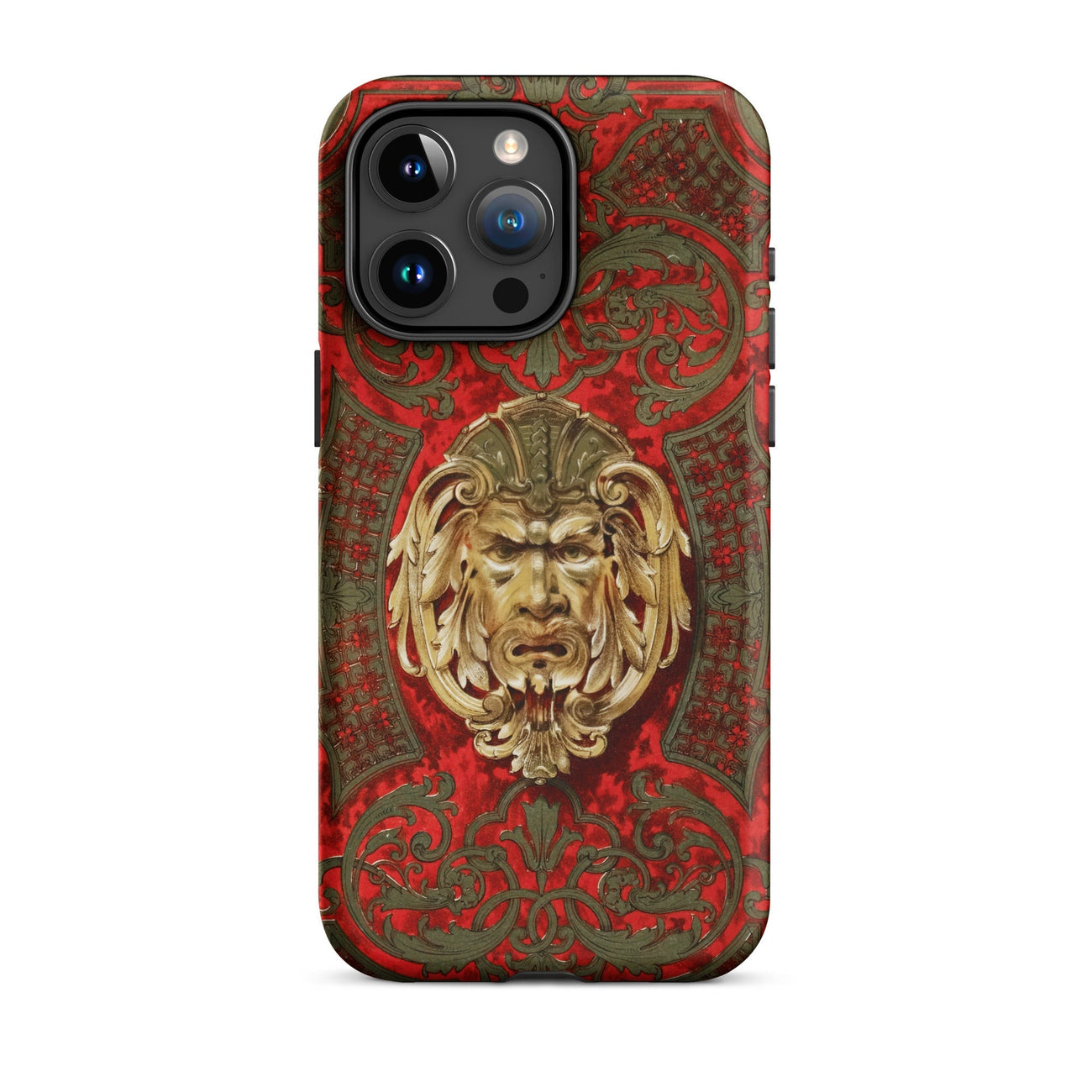 Le visage féroce d'un lion doré regarde vers l'extérieur, défiant les spectateurs avec son intensité royale. Les feuilles d'acanthe tourbillonnantes et le treillis géométrique montrent le summum de l'artisanat de la Révolution industrielle rendu en détail sur votre appareil. L'expertise architecturale de Wyatt insuffle la vie à cette merveille de Boulle, transformant votre iPhone en une pièce de musée miniature.