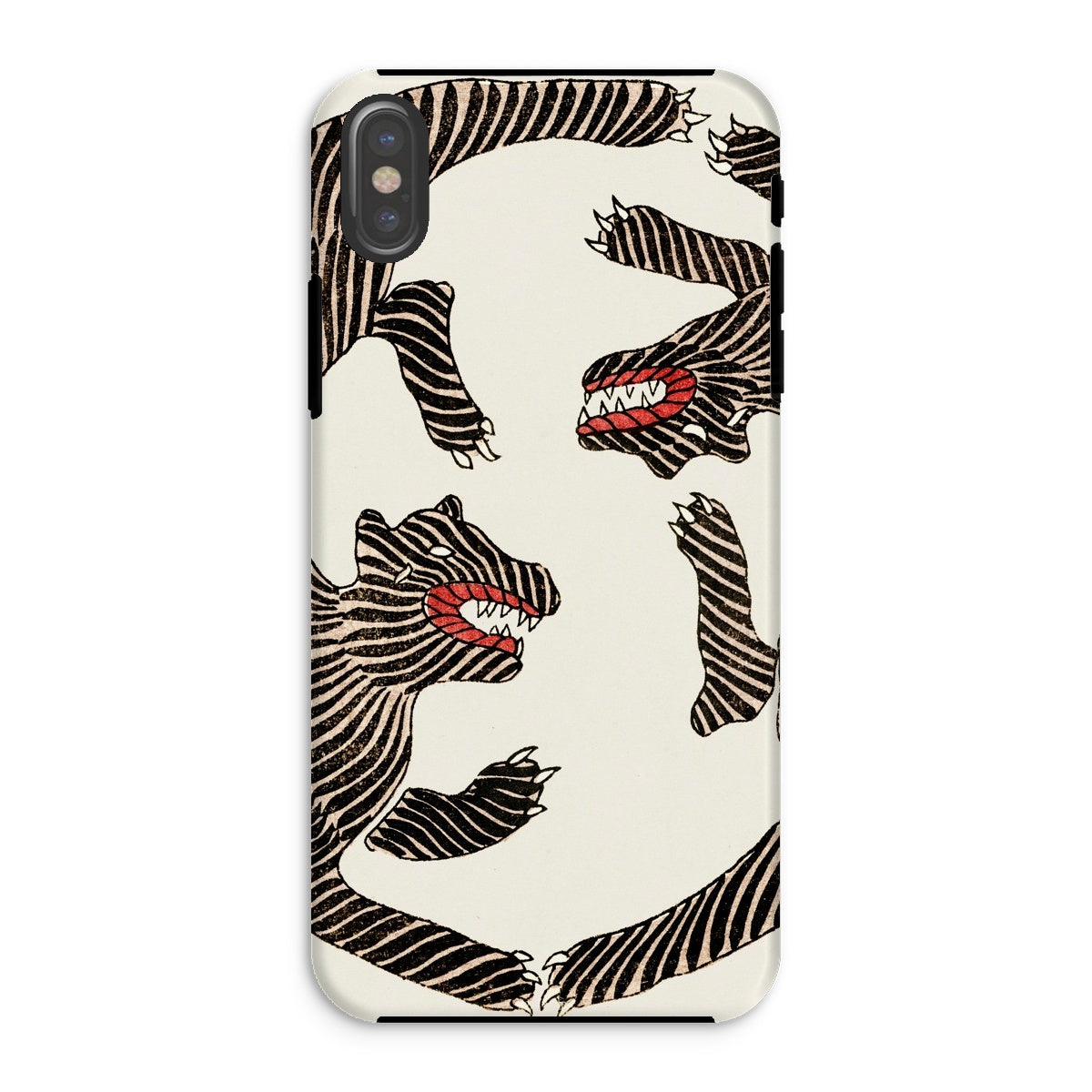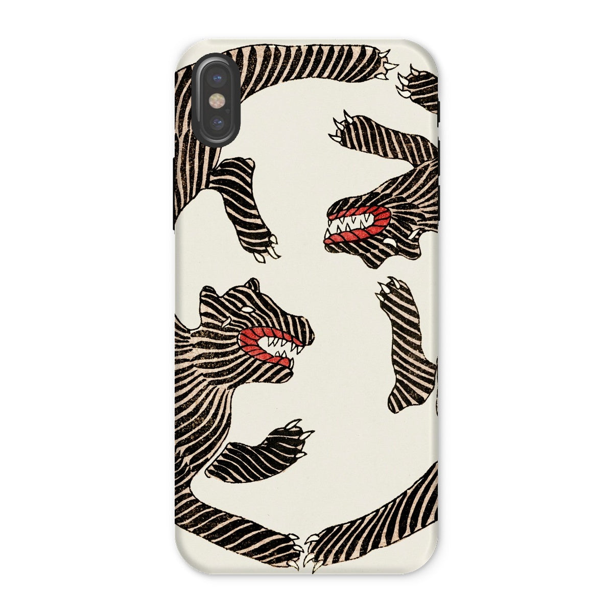 Les motifs de type zèbre se transforment en félins grondants, leurs gignilison cramoisistes de crocs à rasoir. Les rayures noires ondulent sur une toile de fond crémeuse, chaque ligne gravée avec la précision du traditionnel ukiyo-e artisanat. Le contraste frappant évoque à la fois le danger et l'élégance, un paradoxe visuel aussi élégant que sauvage.