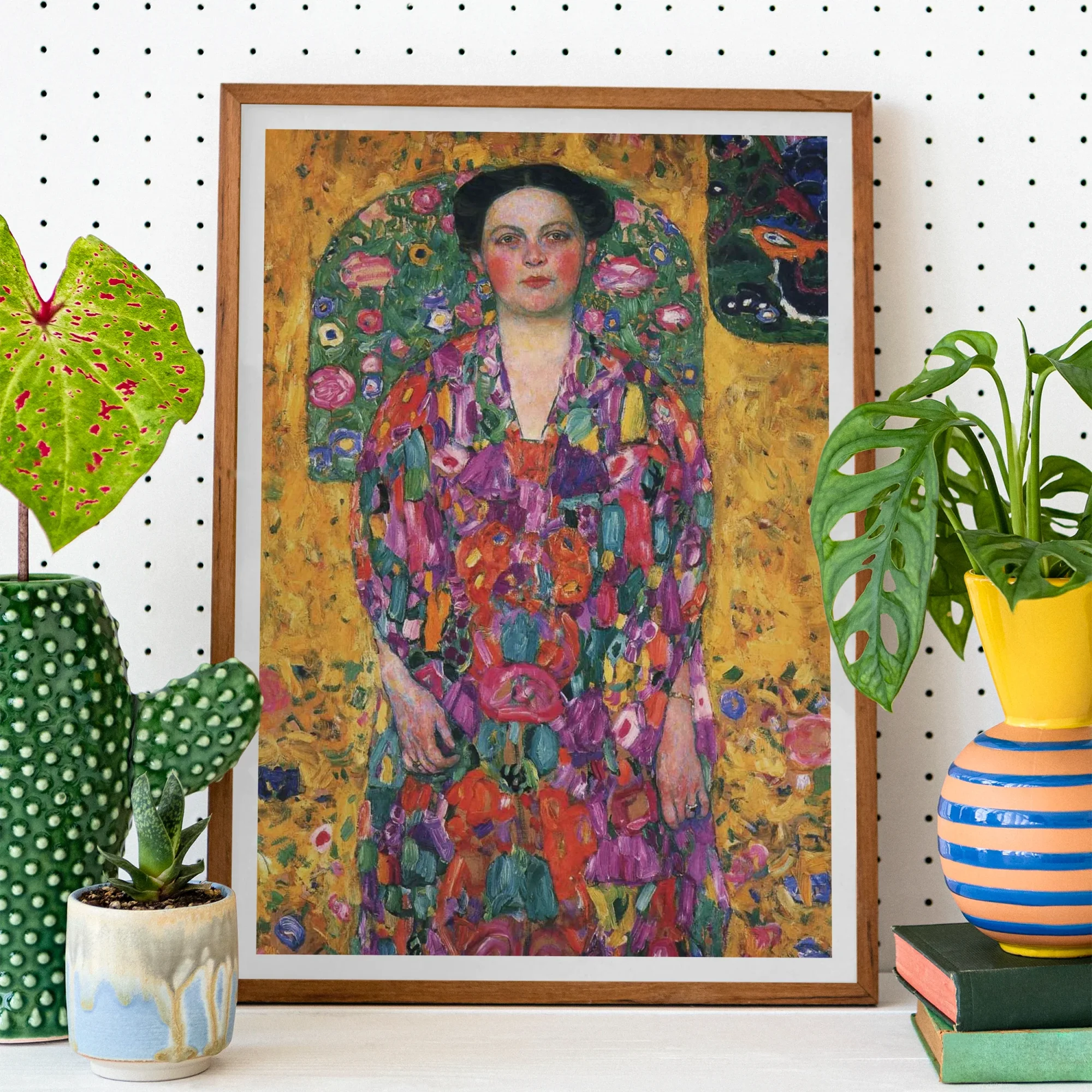 Vous serez envoûté par cette captivante impression artistique du tableau de Klimt "Portrait d'Eugenia Primavesi." Une symphonie de splendeur symboliste, où des teintes vibrantes semblent rayonner sur la toile. Le regard énigmatique de Primavesi perce à travers une fantasmagorie florale, sa tenue étant une tapisserie kaléidoscopique de fleurs aux tons de bijoux.