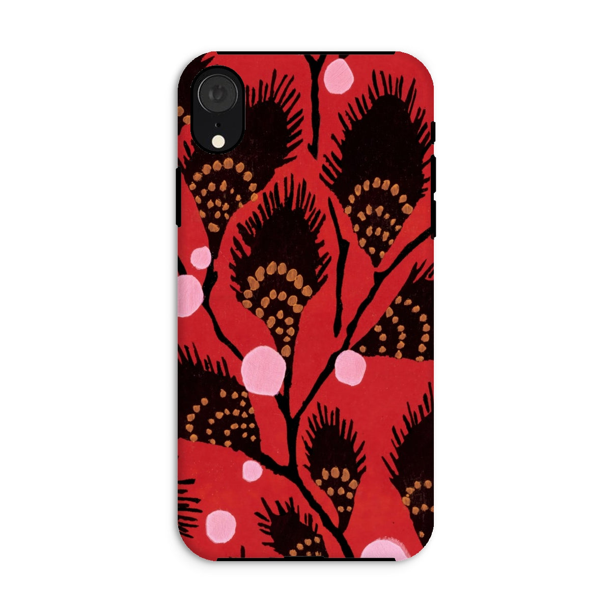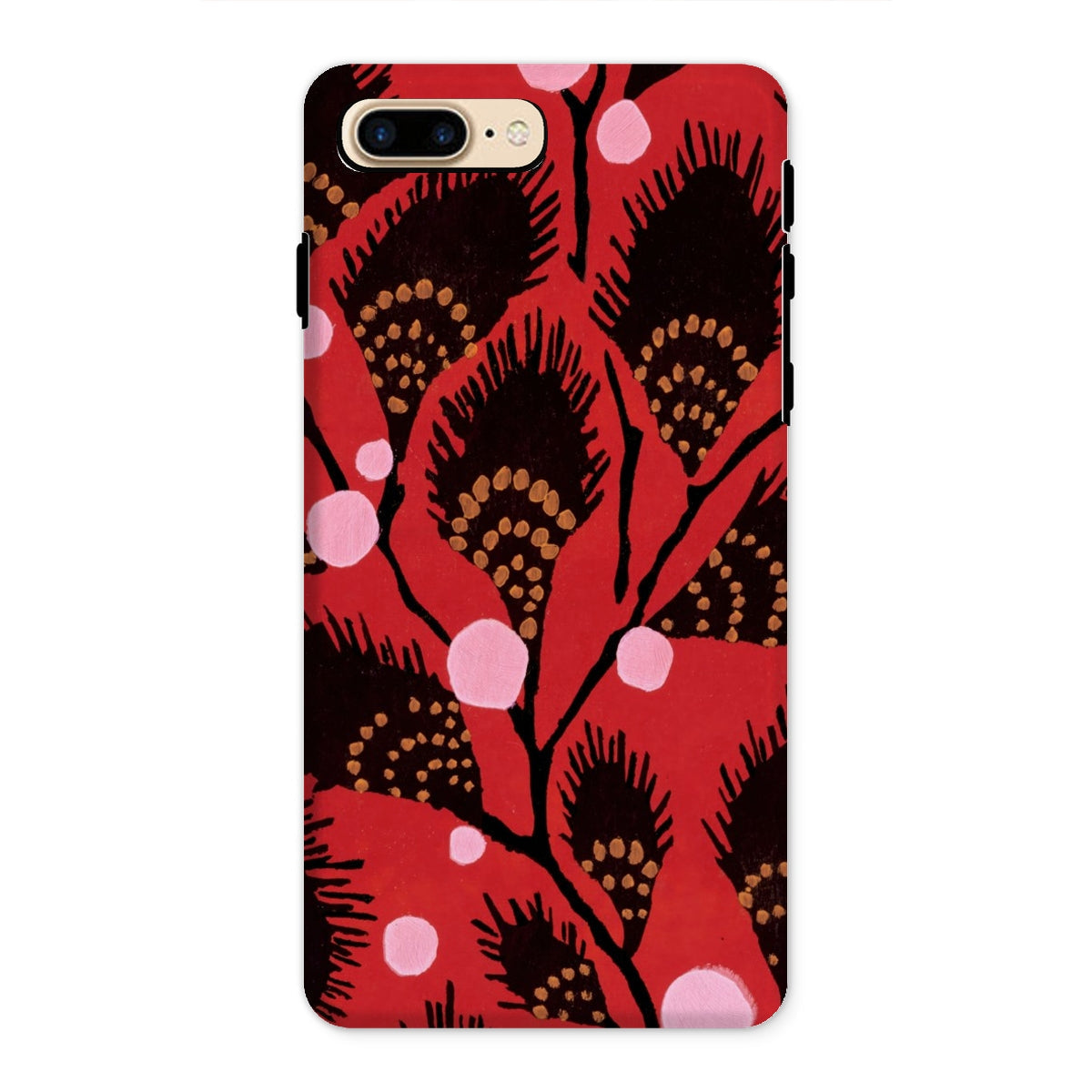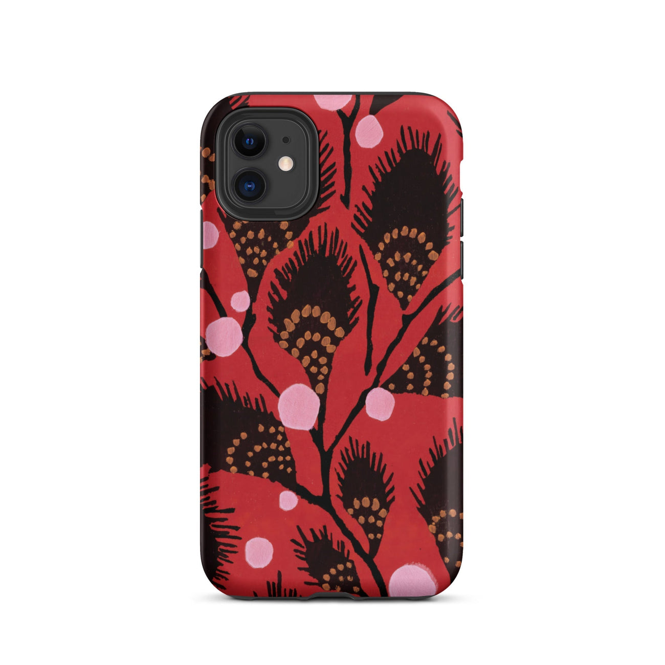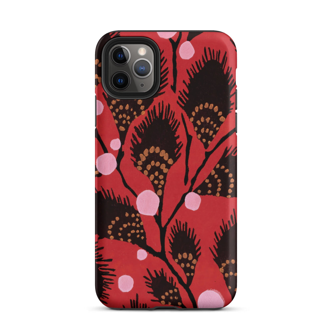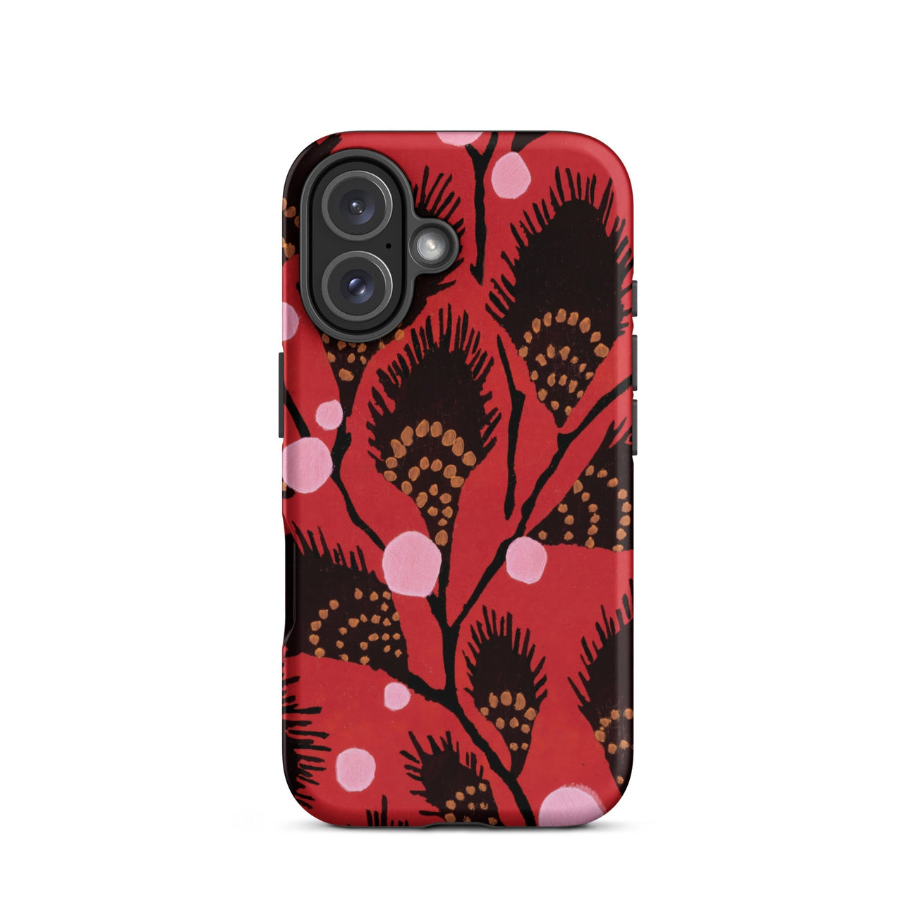 Une fièvre de cramoisi et d'ombre, une danse de la nature indomptée—cet étui iPhone est un portail vers l'opulence de l'ère botanique Art Déco. Le design pochoir du paon noir vibre comme un rythme ancien, avec ses frondes noir velours et ses grappes de graines saupoudrées d'or. Chaque trait rappelle la grandeur des motifs textiles français des années 1920. Des sphères rose pâle dérivent comme des échos chuchotés, perçant le contraste audacieux des silhouettes botaniques profondes.