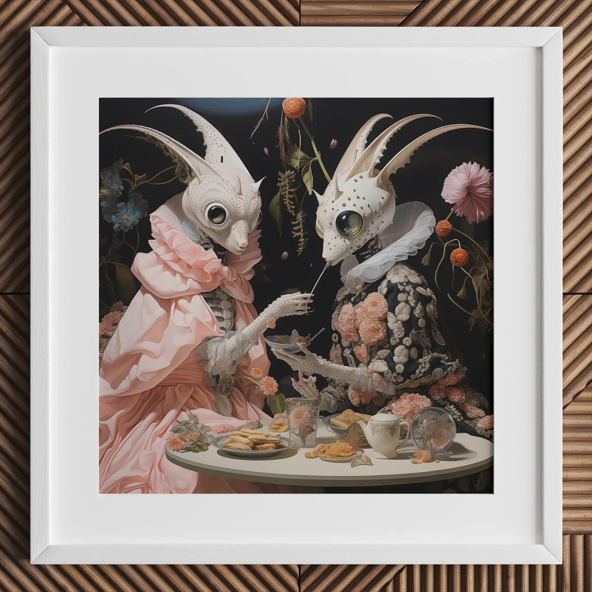 Voici une fête fantasmagorique pour vos sens. Deux êtres extraterrestres, resplendissants dans des parures de Renaissance, se livrent à un surréaliste Tea Party qui défie la réalité. Lowbrow rencontre le sublime dans ce rêve de fièvre queer d'une impression.