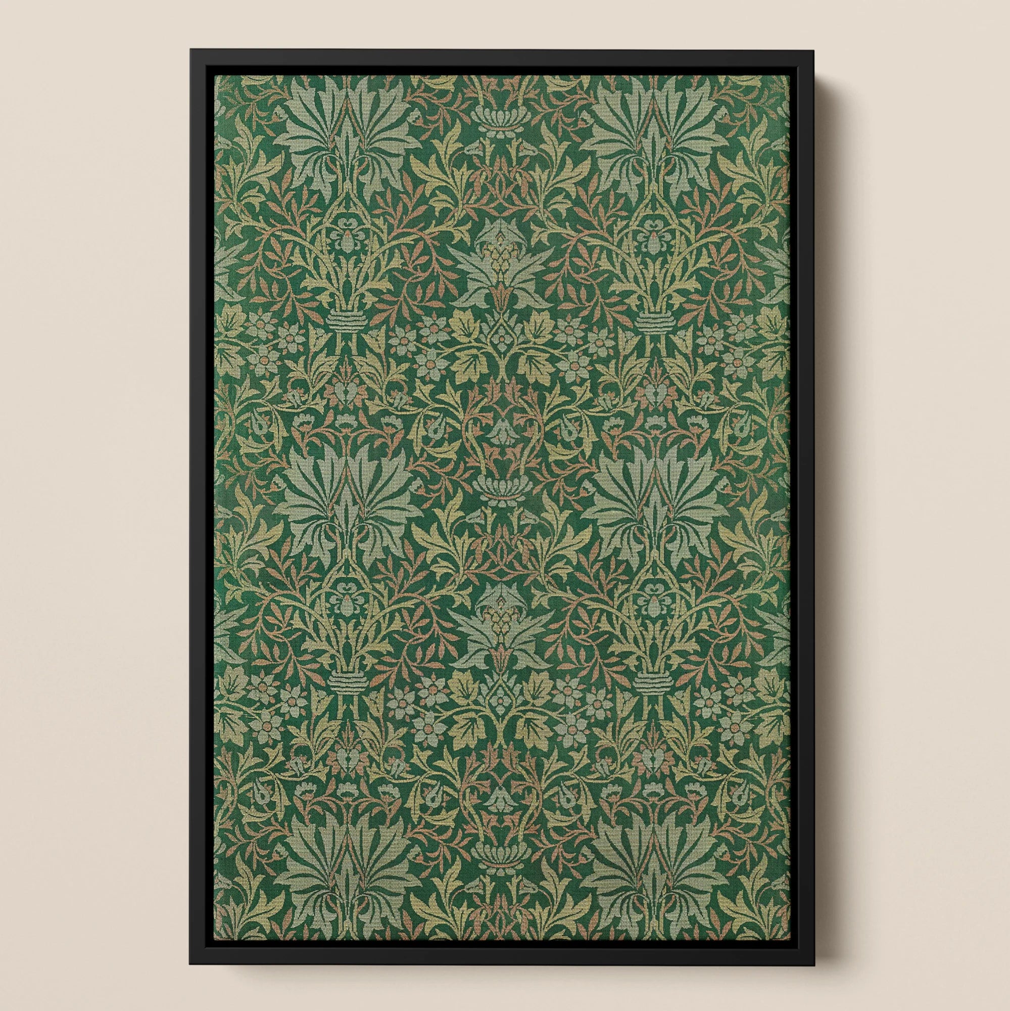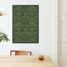 La tapisserie verdoyante, enfermée dans un cadre noir élégant, présente une chorégraphie complexe de feuillage doré sur un fond émeraude. La maîtrise révolutionnaire de Morris en création de motifs se déploie devant vous, chaque vrille et fleur témoignant de son rejet de la stérilité industrielle.