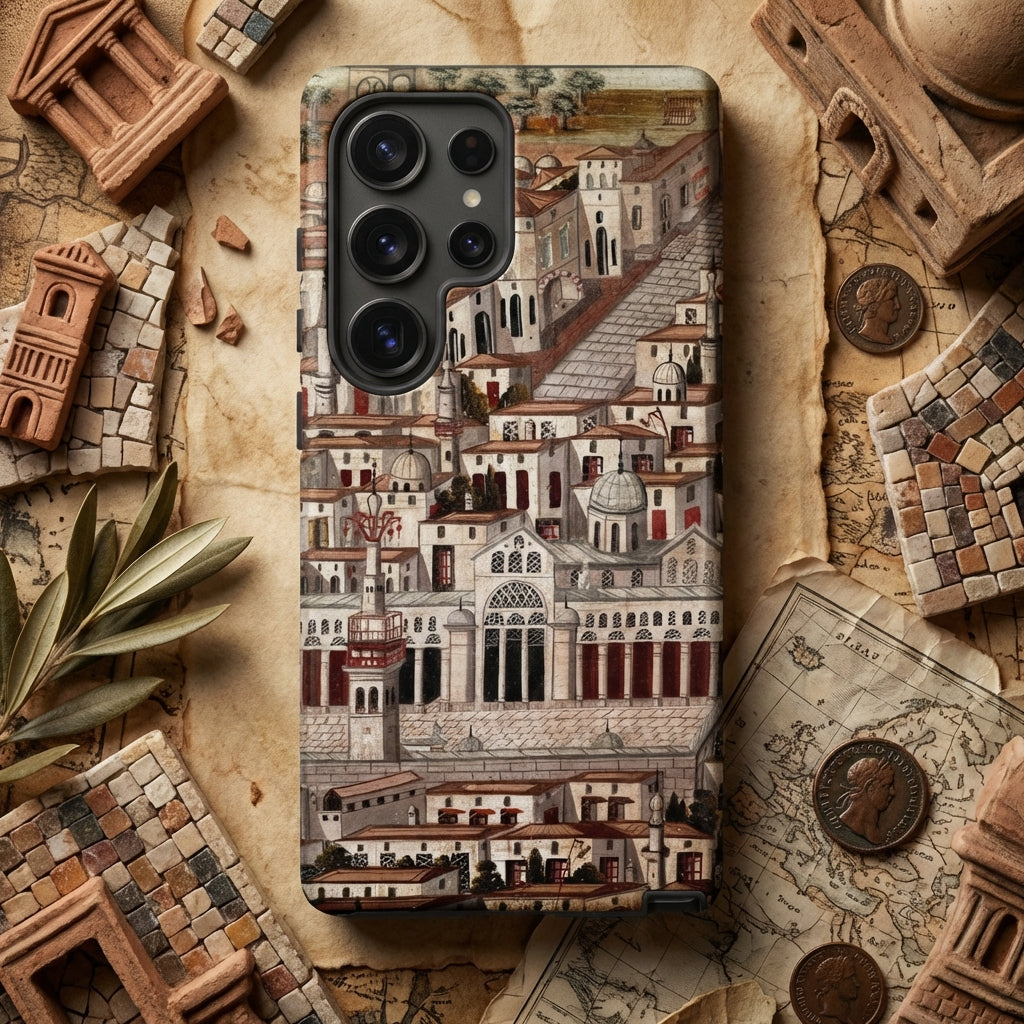 Un labyrinthe de dômes, d'arcs et de passages en pierre converge sur cet étui Samsung. Dépeignant la Grande Mosquée de Damas avec un détail exquis. Des minarets en hausse et des toits en dôme évoquent la grandeur du califat omeyyade, tandis que les mosaïques byzantines et les inscriptions coufiques scintillent à travers ses cours imaginées.