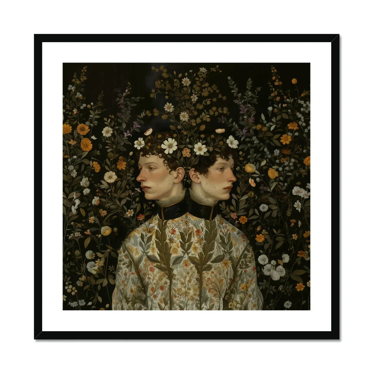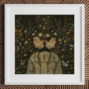 Plantez-vous dans un monde où les impressions d'art floral fleurissent avec une splendeur néo-Renaissance. Vous contemplez Harold & Claude, un portrait classique contemporain qui murmure de la Renaissance néerlandaise. Des visages jumeaux, androgynes et posés, émergent d'une tapisserie de botanicals atténués, leurs tons terreux faisant écho à la palette florale chaude qui les entoure.