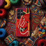 Chaque contour—éclat jaune, trait violet, arc émeraude—suit les couches découpées à la main de la broderie traditionnelle Mola, née dans les îles San Blas du Panama. Cette coque Samsung protectrice transporte ce langage textile séculaire dans le présent électrique, son motif vibrant d'esprit animal cérémoniel, de canopée de jungle côtière et de vitalité de masque de festival.