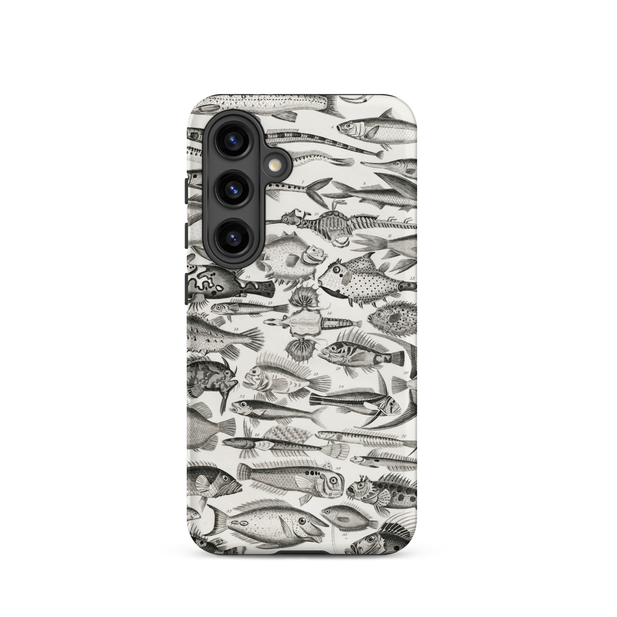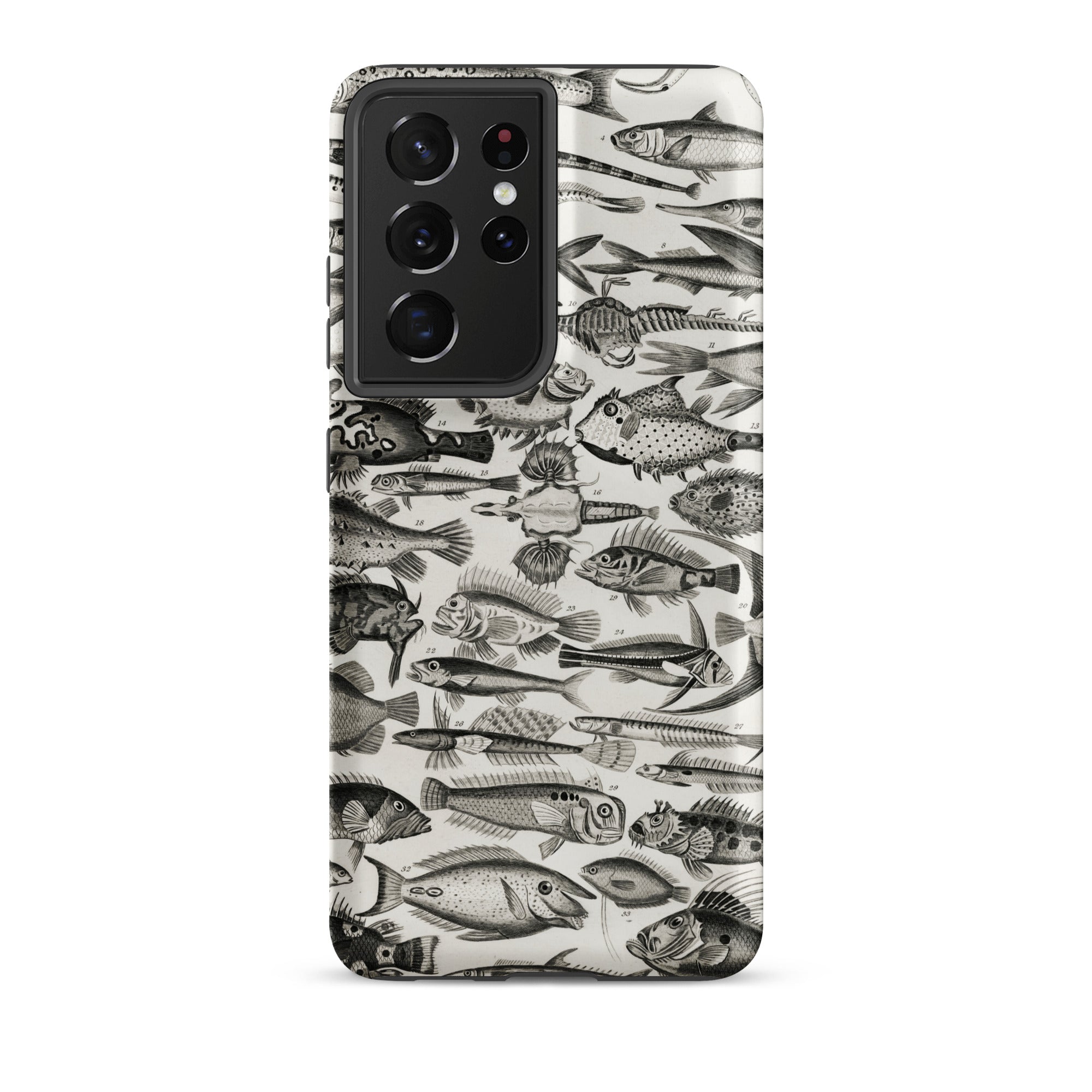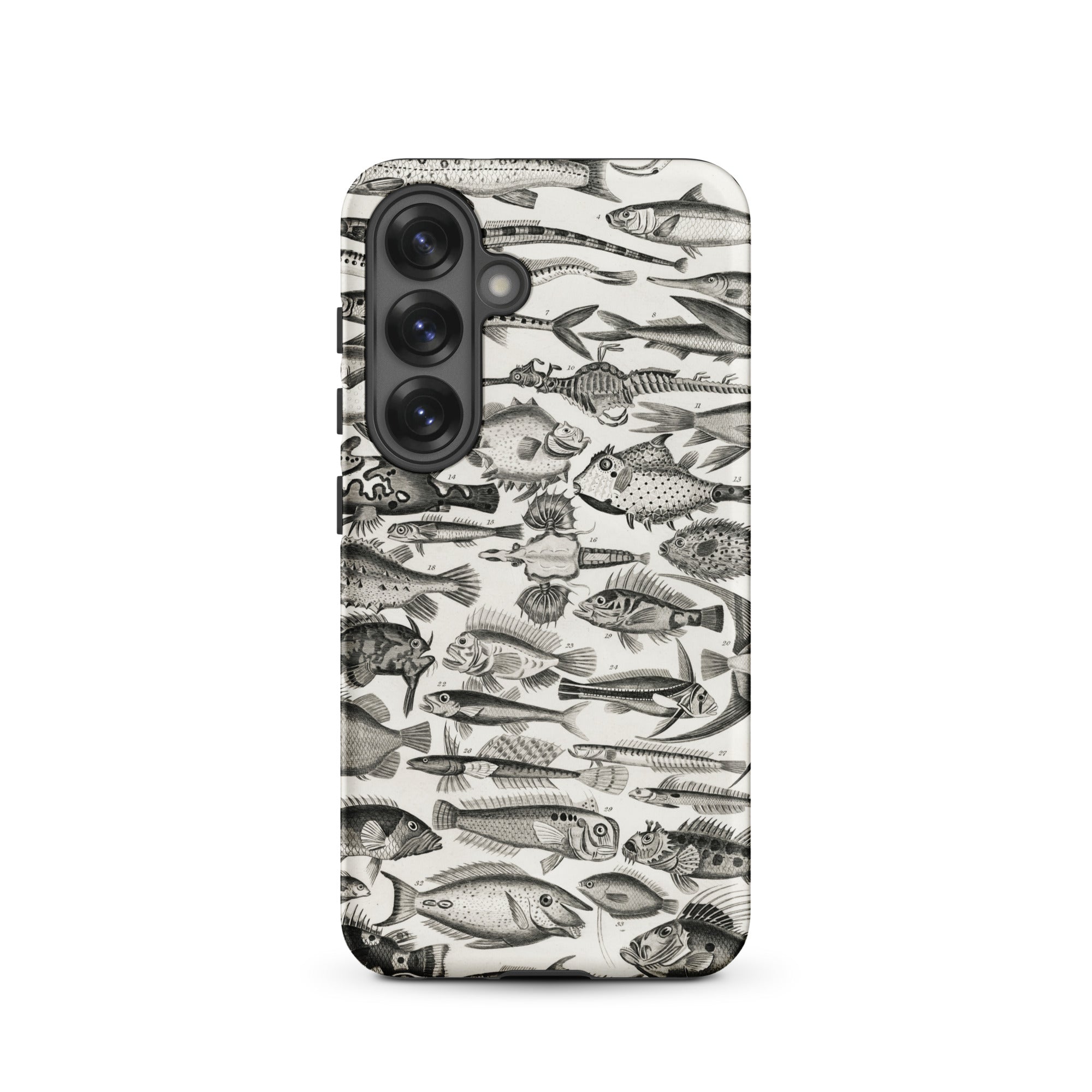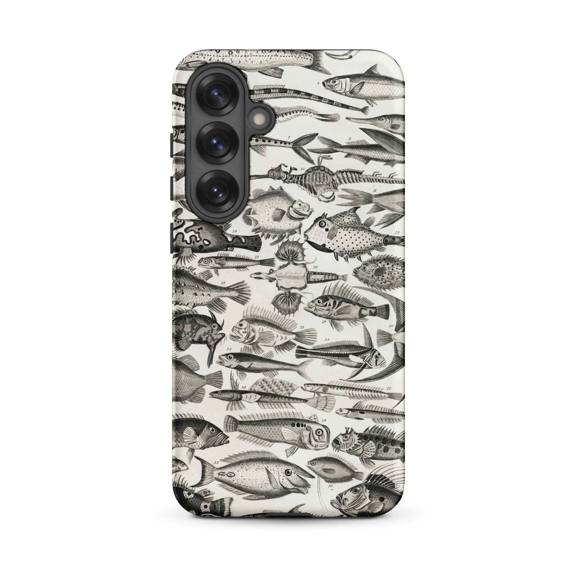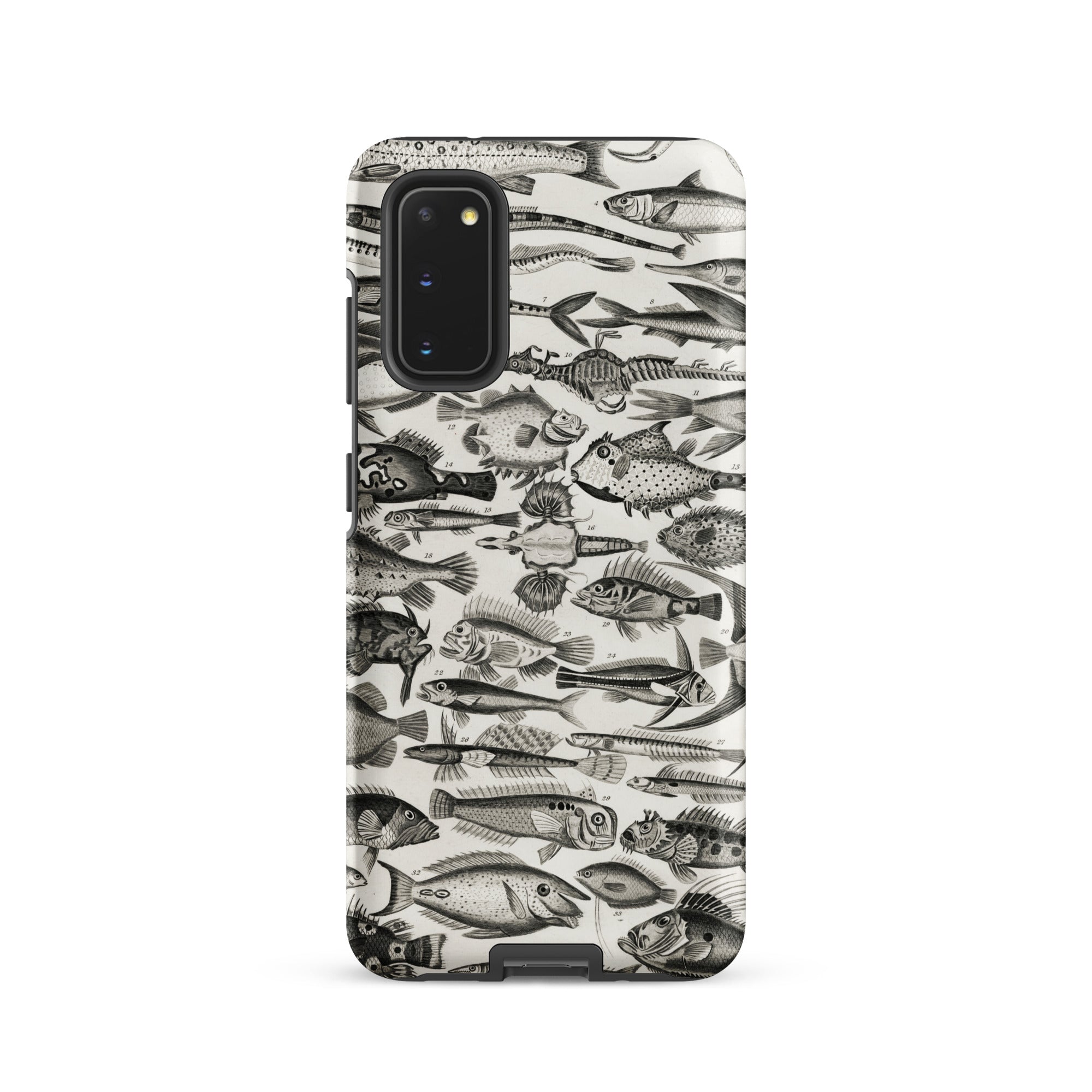 Un cabinet de curiosités pour votre poche—cette coque Samsung nage avec l'étrange et le spectaculaire. Inspirée par les illustrations ichthyologiques du XVIIIe siècle d'Oliver Goldsmith, elle assemble une marée de gravures de poissons complexes en monochrome hypnotique.