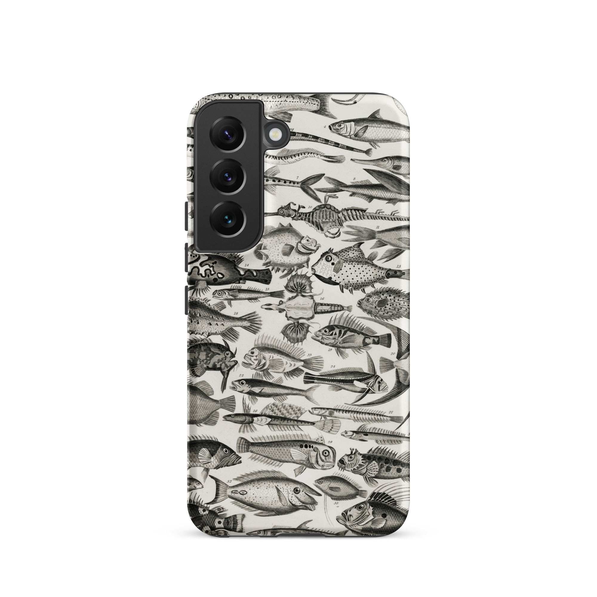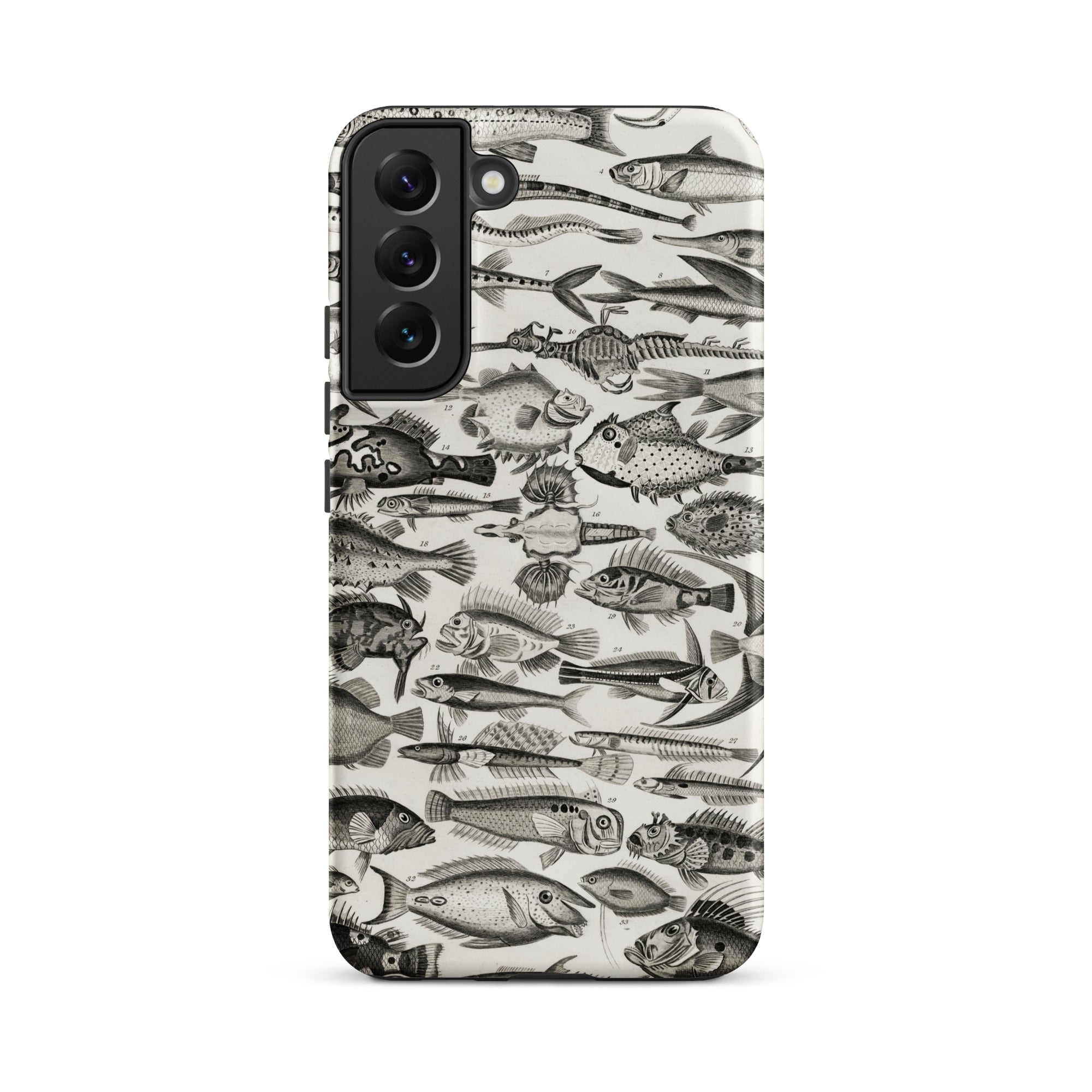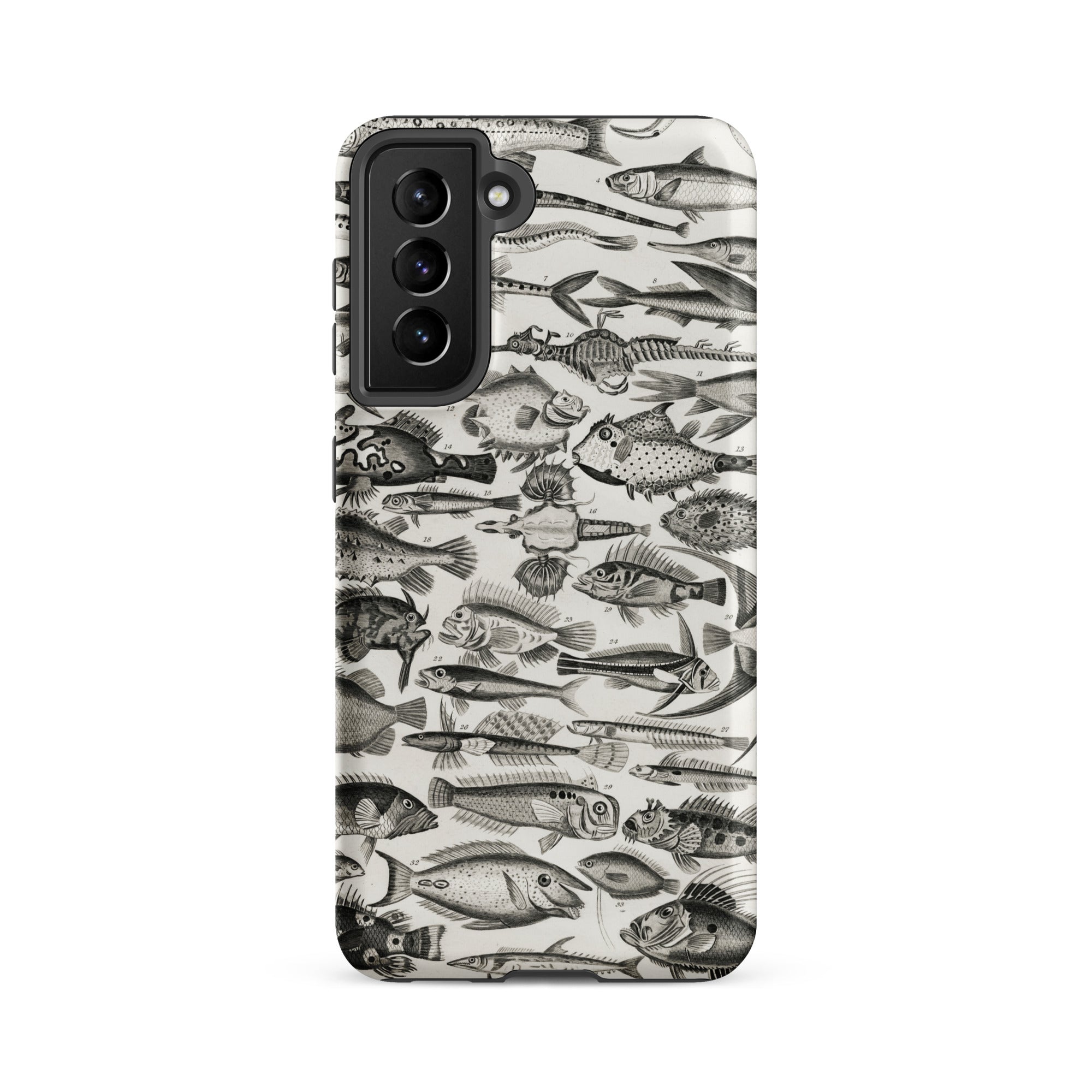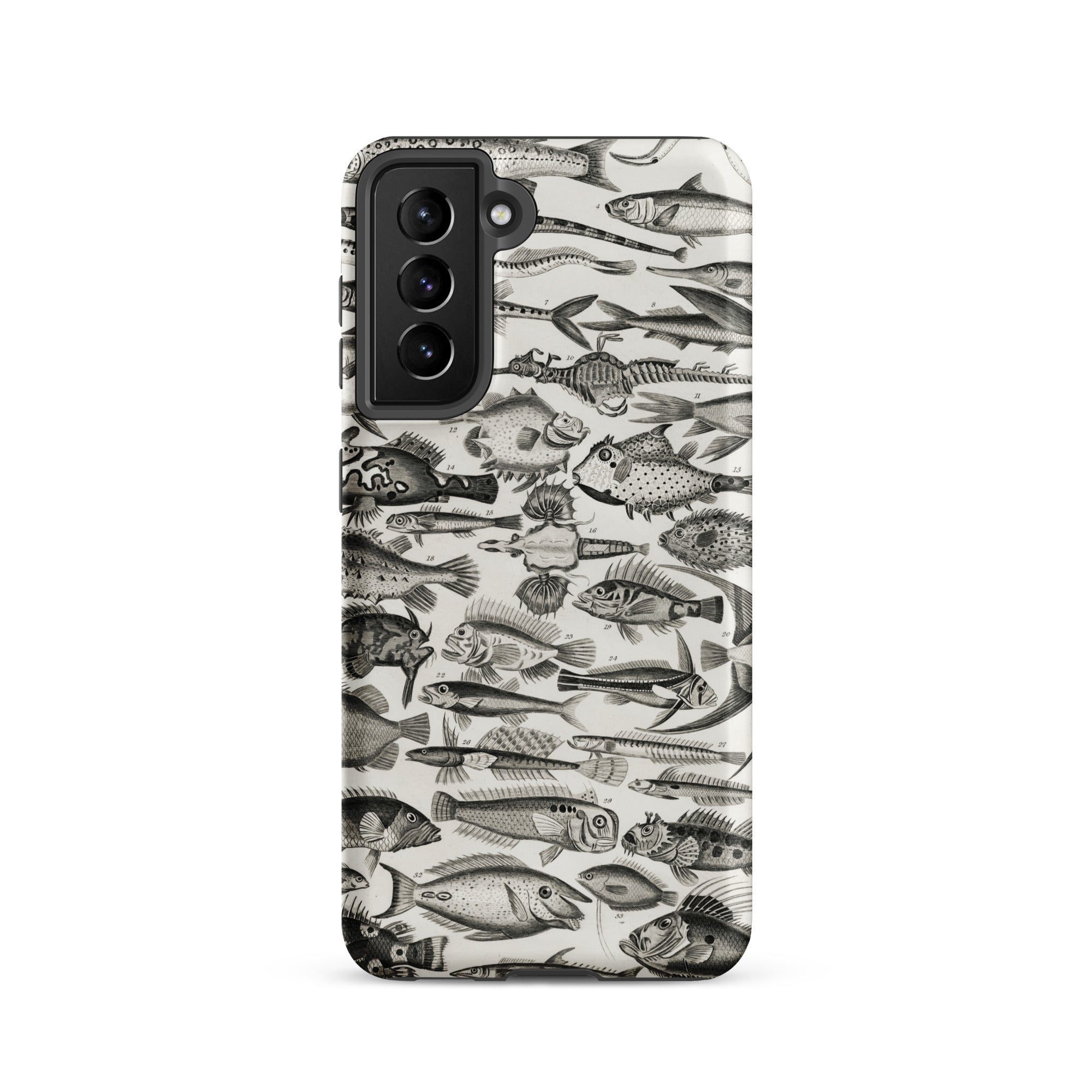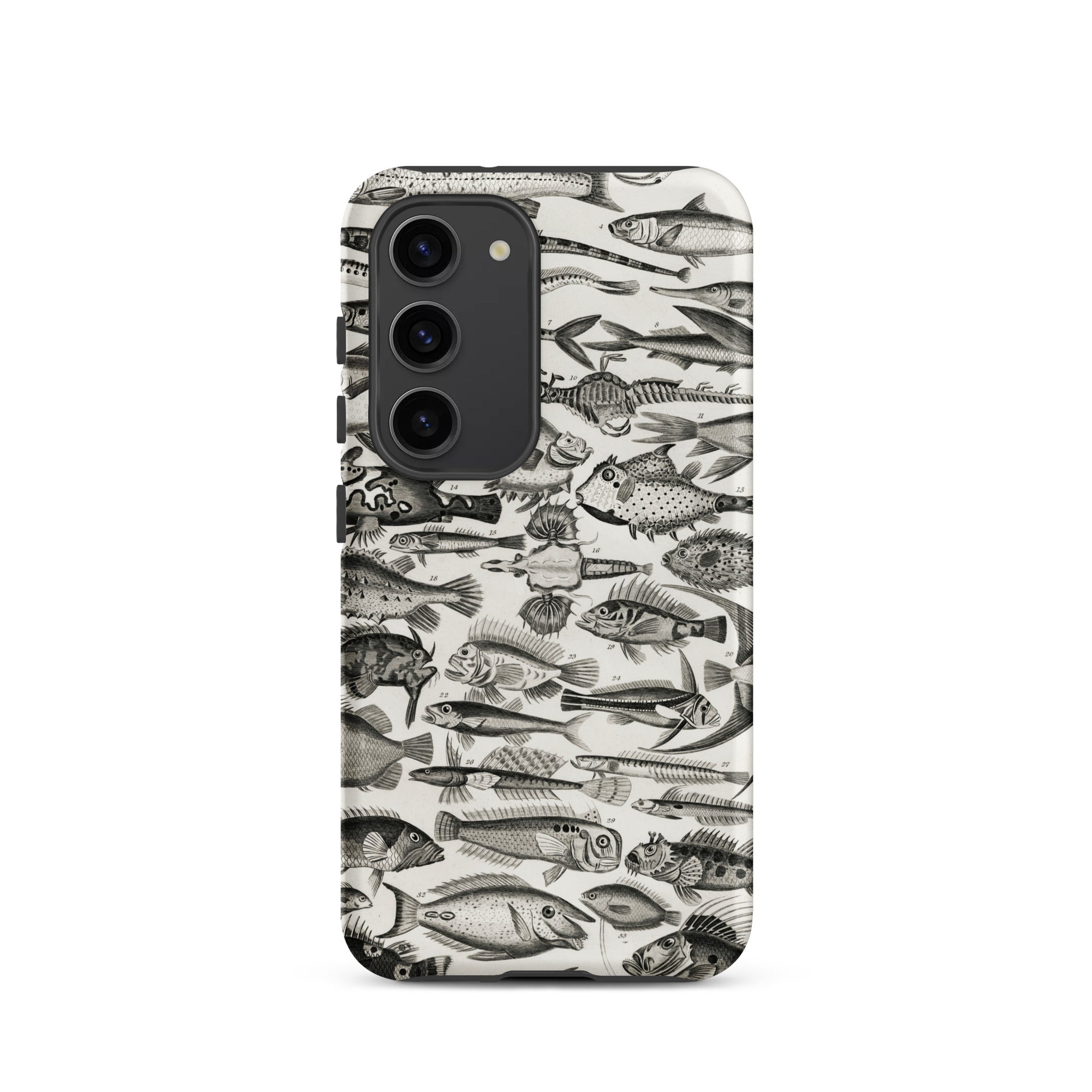 Un cabinet de curiosités pour votre poche—cette coque Samsung nage avec l'étrange et le spectaculaire. Inspirée par les illustrations ichthyologiques du XVIIIe siècle d'Oliver Goldsmith, elle assemble une marée de gravures de poissons complexes en monochrome hypnotique.