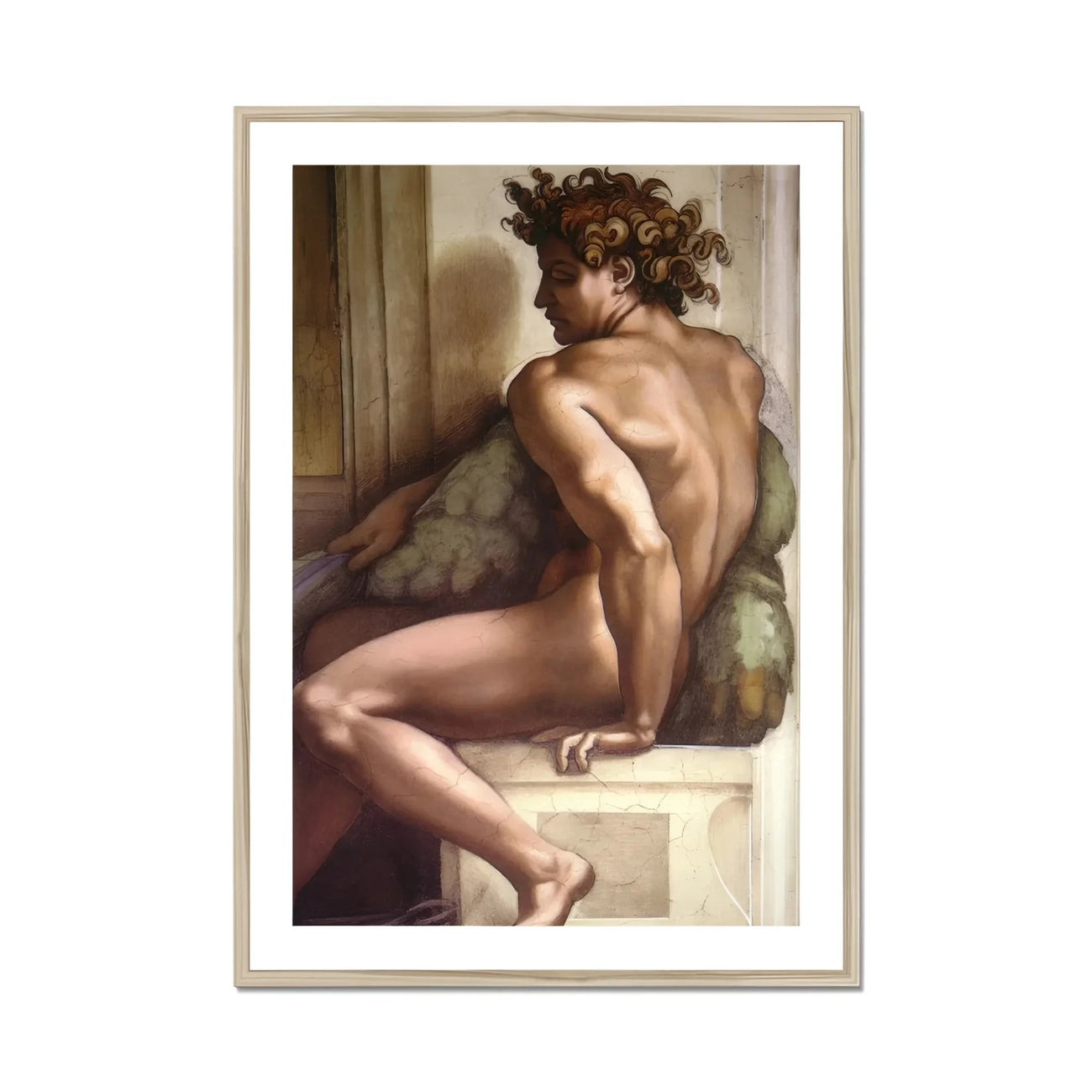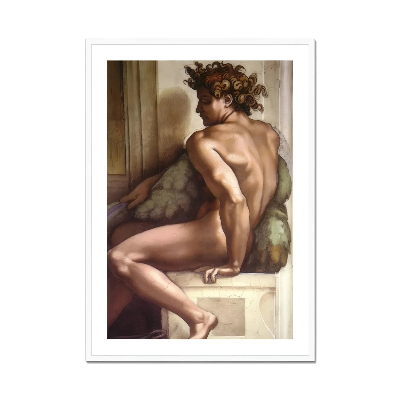 Il est assis enroulé comme un point d'interrogation païen sculpté dans le tonnerre caramélisé, tordu en arrière dans l'acte de se souvenir de quelque chose que le mythe refuse d'oublier. Cet ignudo — ni Adam, ni ange, ni mortel, ni divin — se courbe en lui-même comme un poème sans syntaxe.