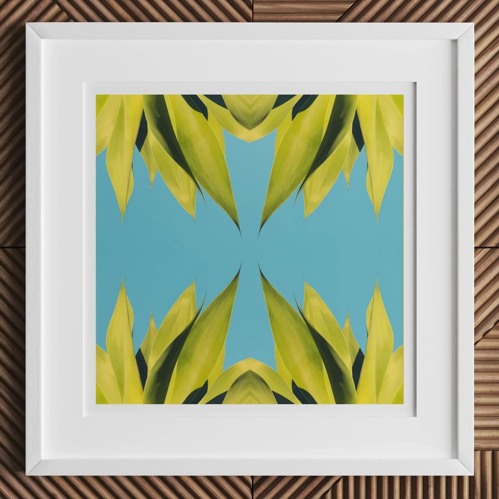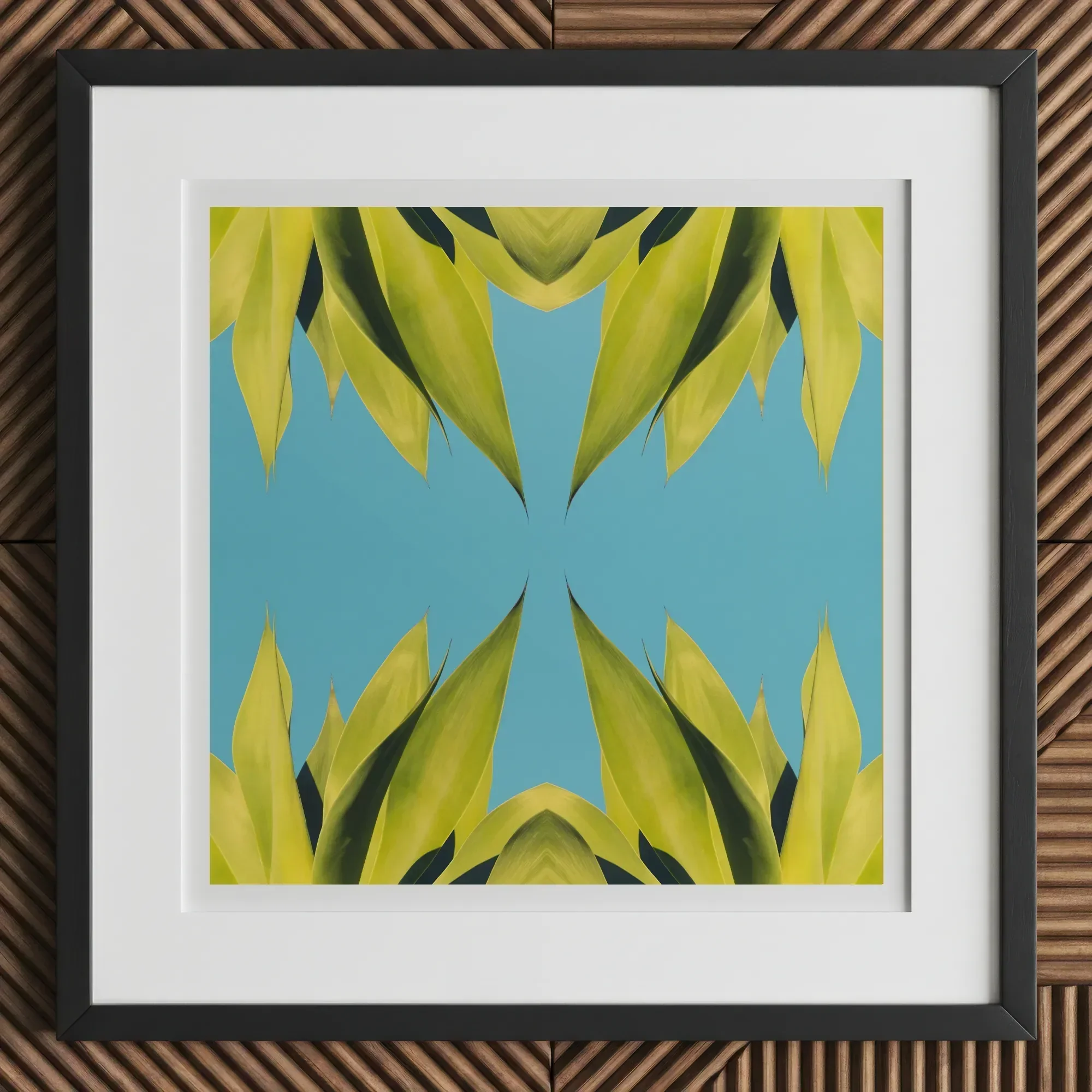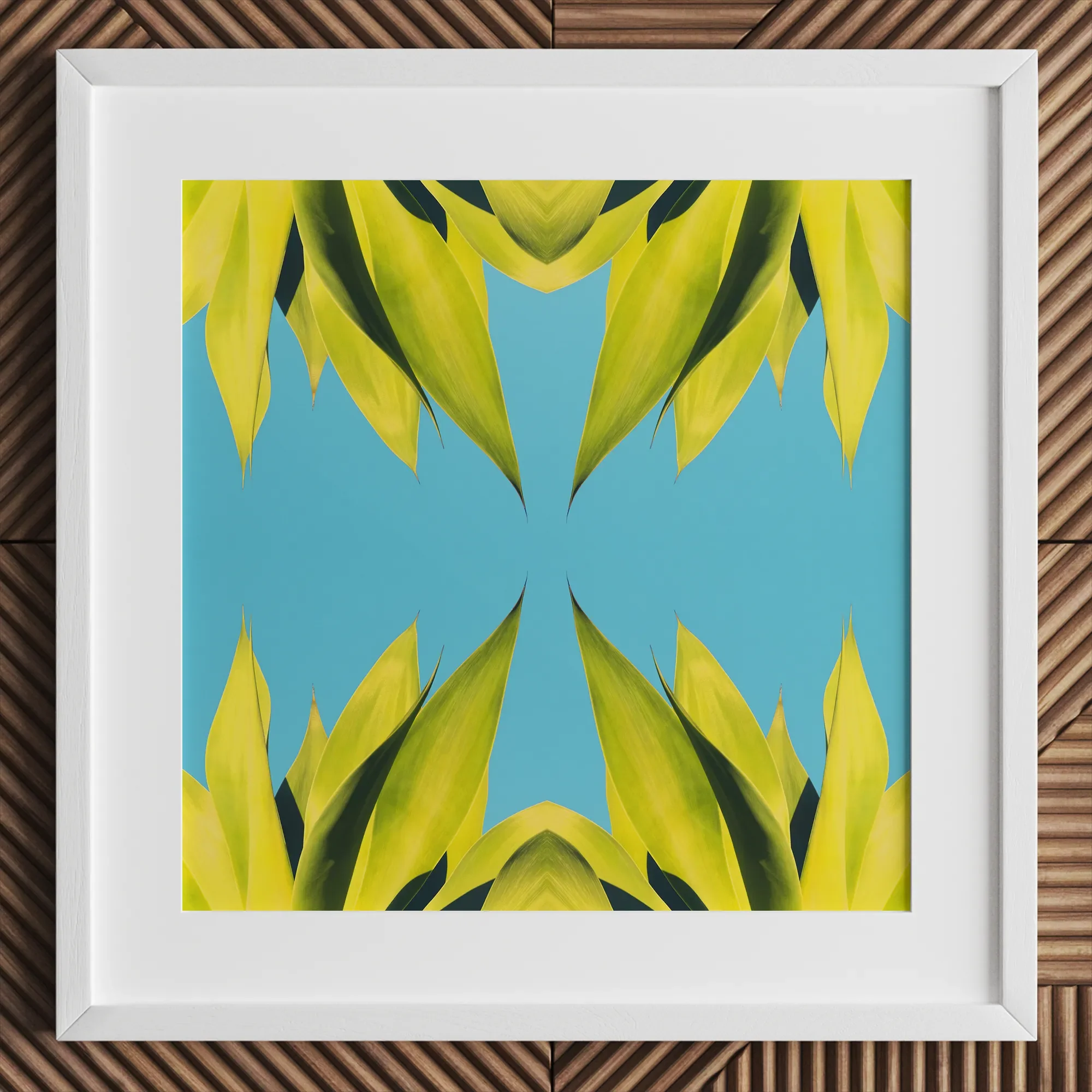 Dévoiler un royaume où la botanique rencontre l'illusion d'optique avec cette photographie succulente avant-garde imprimé art. Les frondes de chartreuse, capturées en haute définition, se déploient en parfaite symétrie contre une étendue céruléenne, fabriquant un paradoxe visuel qui remet en question la perception.