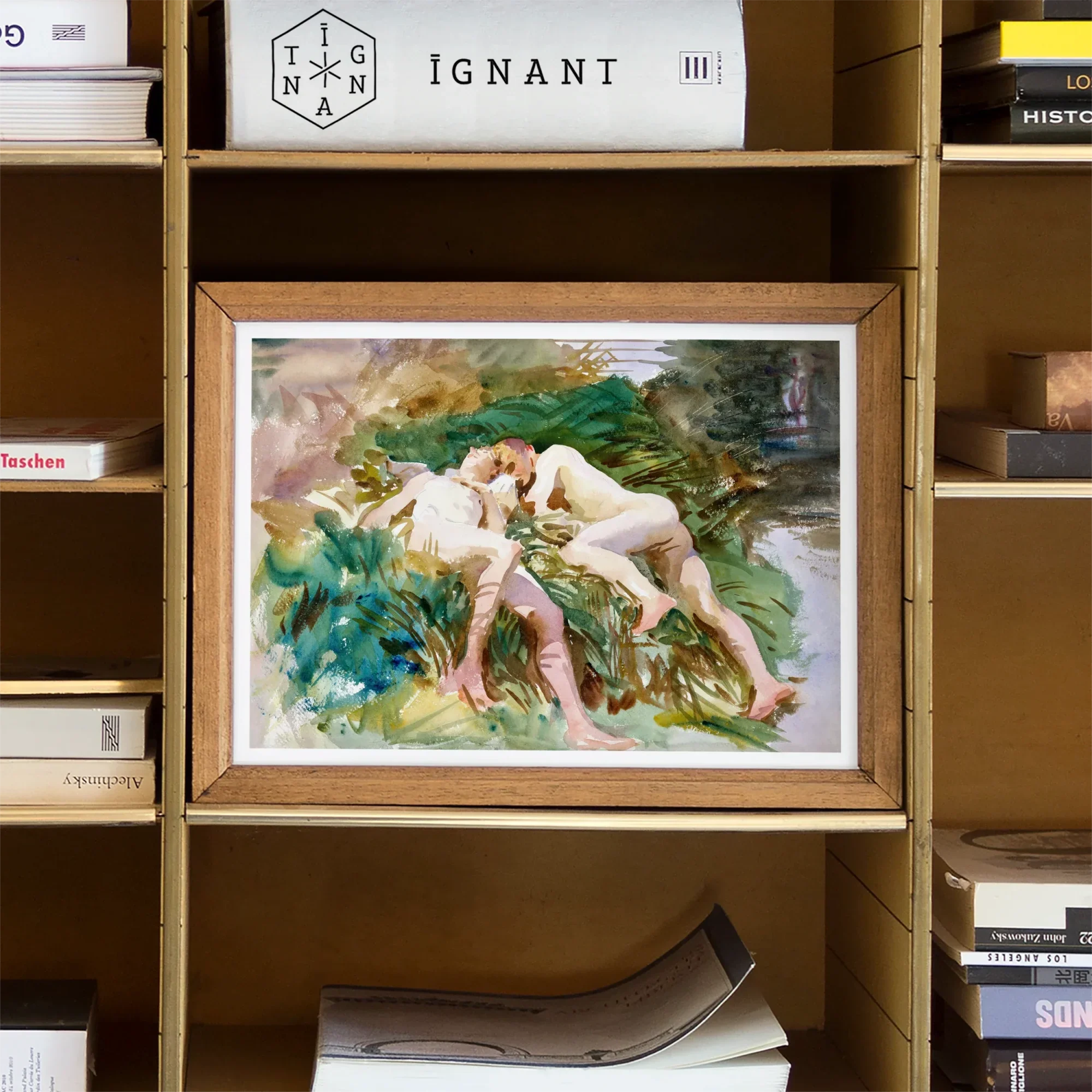 Dans cette scène, deux figures nues sont étendues langoureusement sur l'herbe luxuriante, leurs corps reflétant le doux jeu de la lumière du soleil filtrée à travers le feuillage environnant. Le coup de pinceau habile de Sargent et l'utilisation délicate des couleurs donnent vie à la scène, chaque brin d'herbe et chaque ondulation de l'eau étant méticuleusement rendus. Les postures détendues et les expressions paisibles des soldats contrastent fortement avec le chaos de la bataille, soulignant un rare moment de tranquillité et de vulnérabilité.