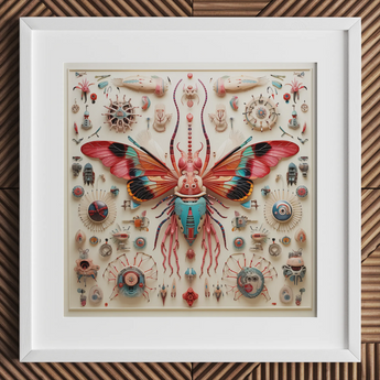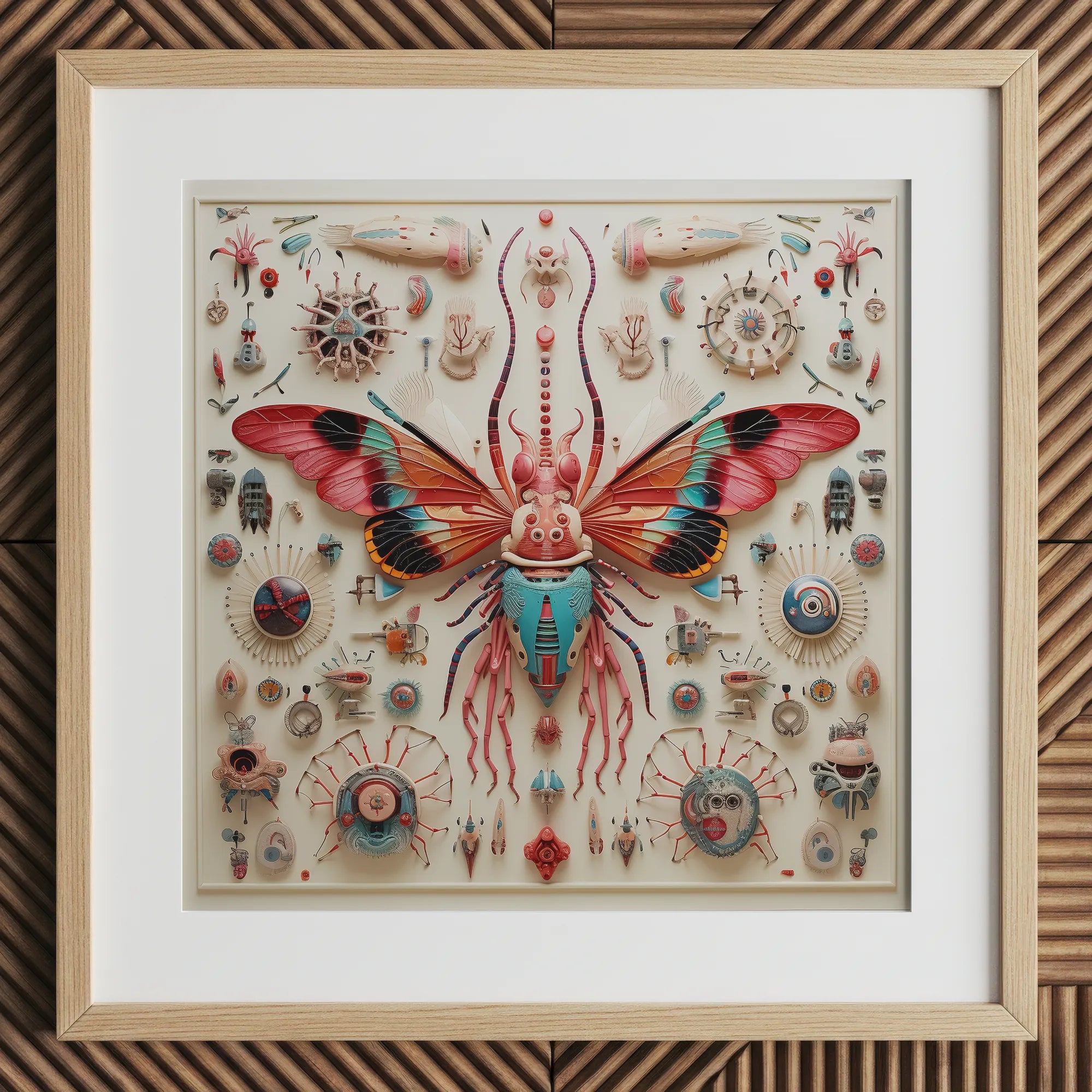 La figure centrale, avec ses ailes cramoisies vibrantes et son exosquelette aigue-marine, évoque à la fois la grandeur des plus exotiques de la Terre papillons et l'essence d'un autre monde de la vie exoplanétaire. Les spécimens disposés symétriquement - des orbes de forme oculaire aux appendices tentaculés - créent une symphonie visuelle qui fait écho à l'illustration scientifique tout en défiant la biologie connue.