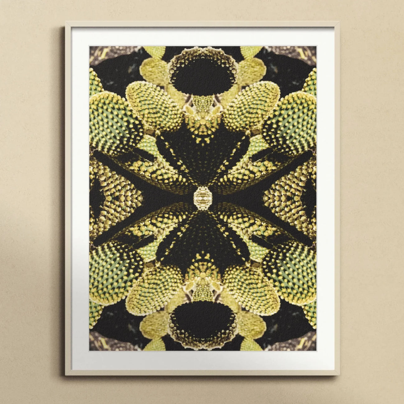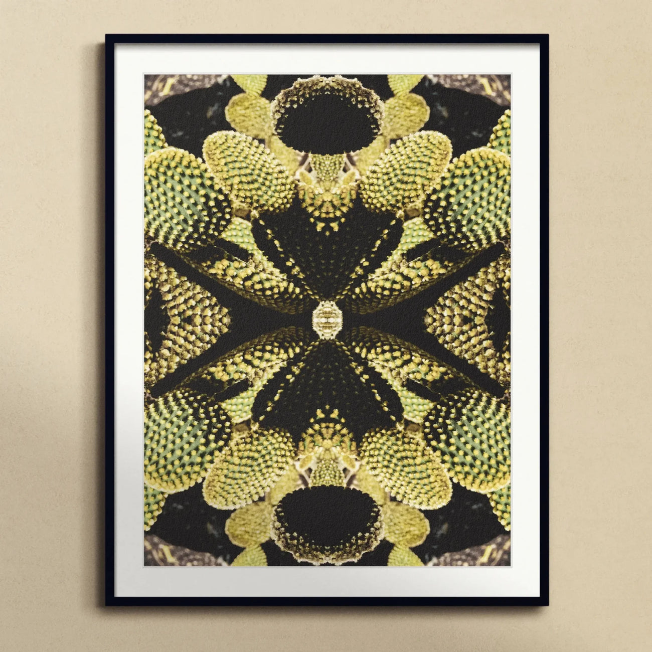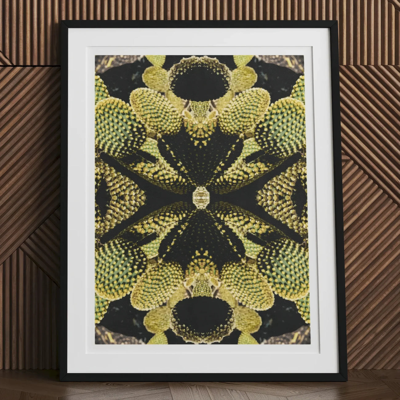 Préparez-vous à un Xeriscape Odyssey en tant que "Life on Mars" vous transporte dans un univers où les cactus règnent en maître. Cela fascinant imprimé art Morphe les succulentes banales en mandalas hypnotiques, faisant écho à la géométrie sacrée trouvée dans la flore la plus résiliente de la nature. Vous regardez dans un kaléidoscope de fractales infusés à la chlorophylle, où chaque saillie épineuse semble danser au bord de la réalité.