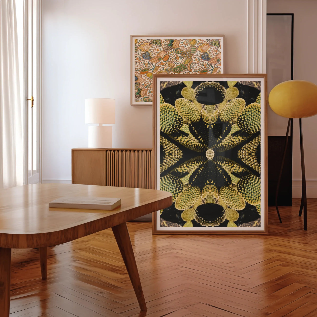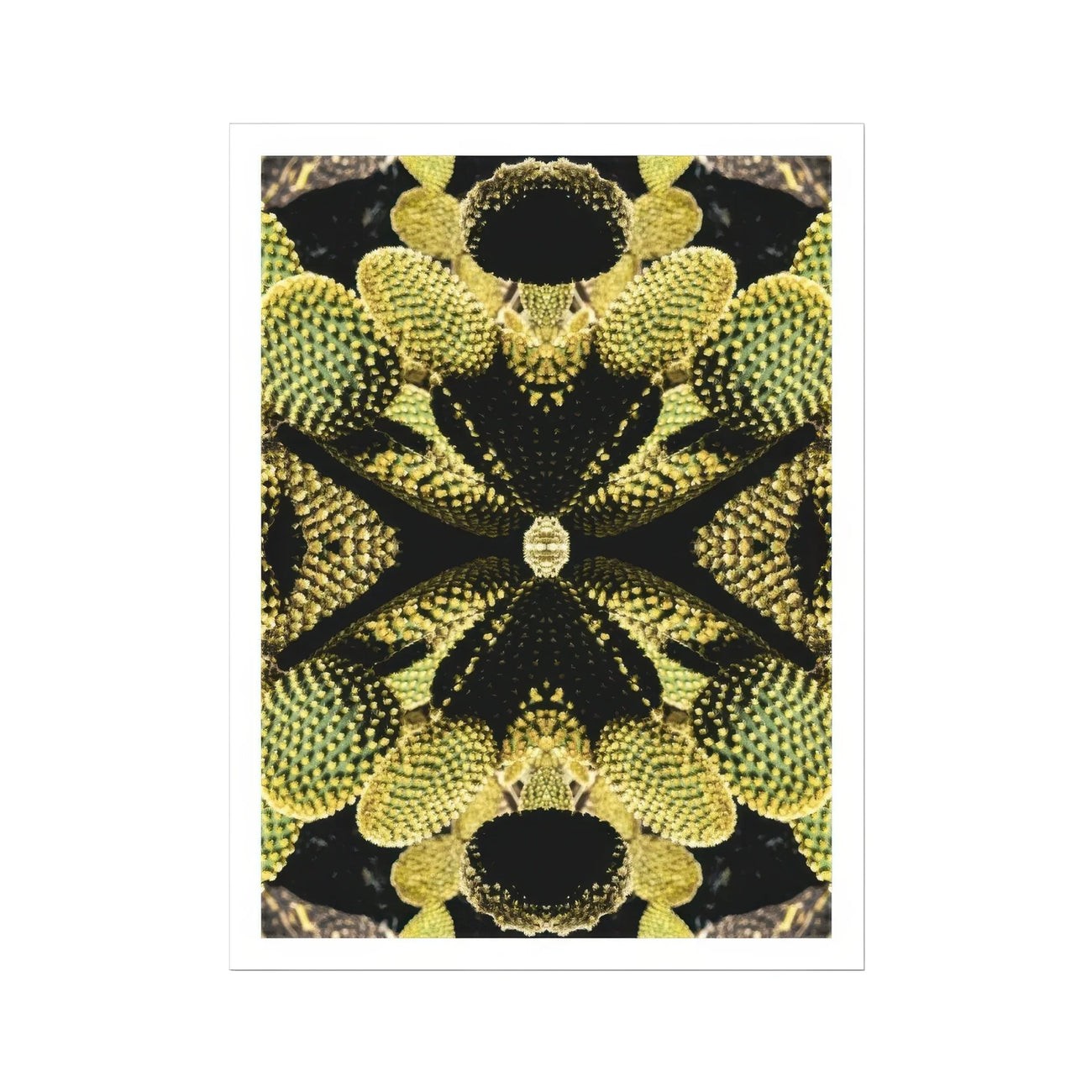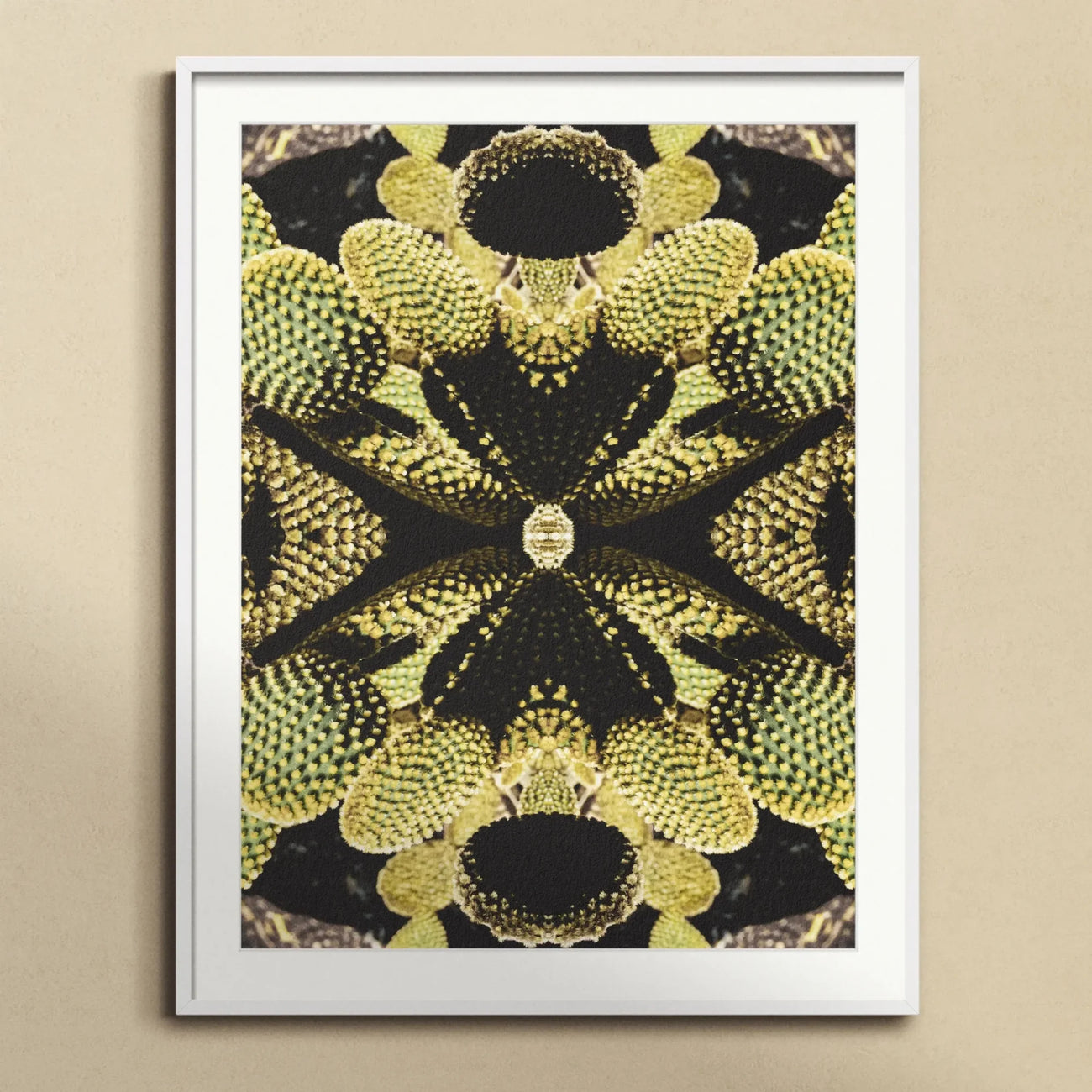 Préparez-vous à un Xeriscape Odyssey en tant que "Life on Mars" vous transporte dans un univers où les cactus règnent en maître. Cela fascinant imprimé art Morphe les succulentes banales en mandalas hypnotiques, faisant écho à la géométrie sacrée trouvée dans la flore la plus résiliente de la nature. Vous regardez dans un kaléidoscope de fractales infusés à la chlorophylle, où chaque saillie épineuse semble danser au bord de la réalité.