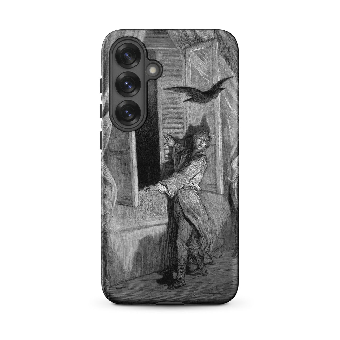 Cette coque Samsung capture le chef-d'œuvre de Doré pour Le Corbeau de Poe, une image imprégnée de l'imagination gothique de la fin du XIXe siècle. Le jeune homme titube depuis le volet ouvert, le visage éclairé par la panique, alors que l'oiseau noir traverse le seuil.