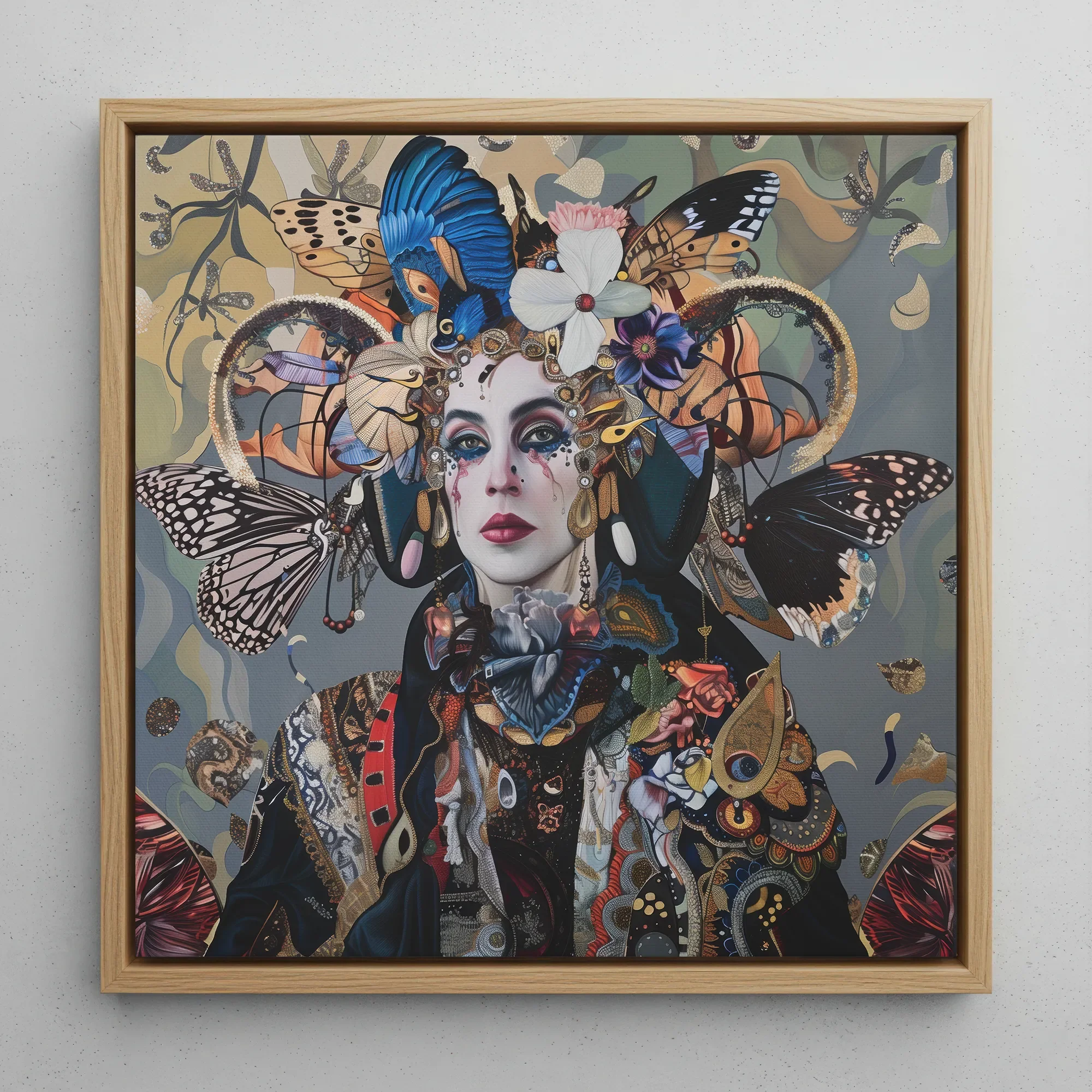Une danse sur le précipice—où la merveille rencontre l'inconnu. Le Fou se tient paré d'une couronne de papillons, chaque aile un murmure de transformation, chaque motif une carte vers des lieux inexplorés. Son regard est ouvert, sans peur, traçant les bords de la possibilité.
