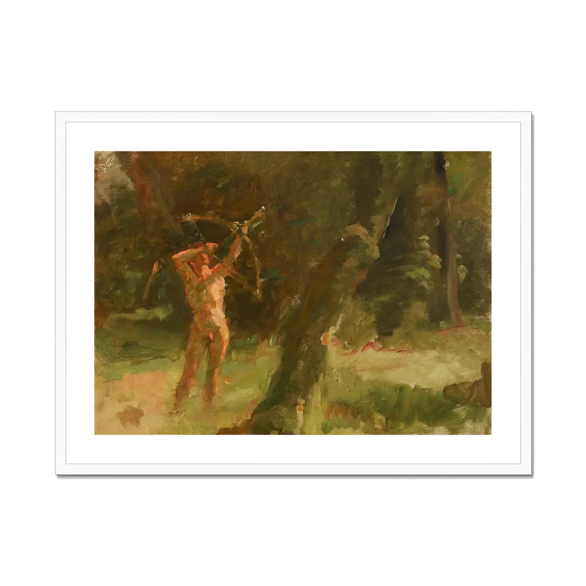 Sous le silence ombré de la forêt mythique de Jægersborg, une silhouette masculine solitaire trace son arc dans l'air velouté—nu, rougi par le soleil, tendu, flèche en plein tremblement. Ce n'est pas un homme : c'est la tension érotisée, un Apollon danois incarné sous le pinceau fiévreux de Paulsen.