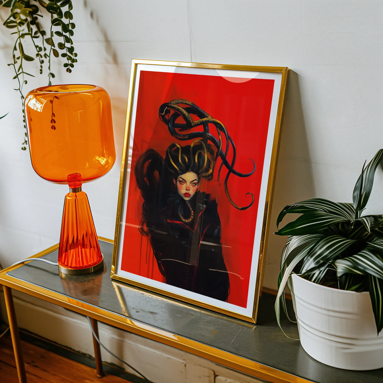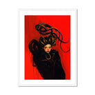Ses robes de robe en corbeau cascades comme la nuit liquide, absorbant chaque scintillement de lumière qui ose la toucher. Et s'élevant de sa couronne, les vrilles d'une ancienne créature - des arcs serpentins en spirale incroyablement au-dessus de sa tête. Chaque vrille écailleuse avec le pouvoir de taquiner et de détruire, de plaisir et de poison - tous ses symboles de puissance et de transformation curling et torsion en mépris de la raison.