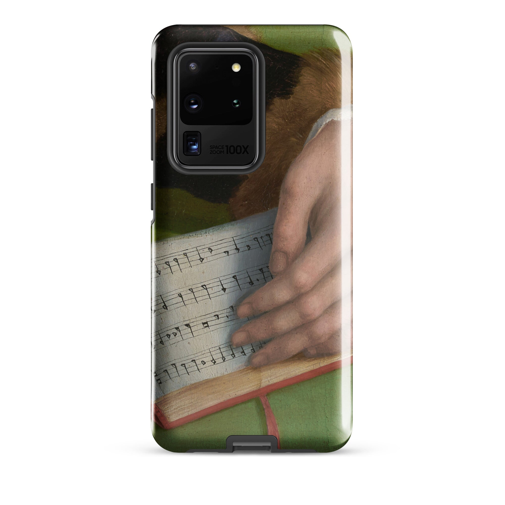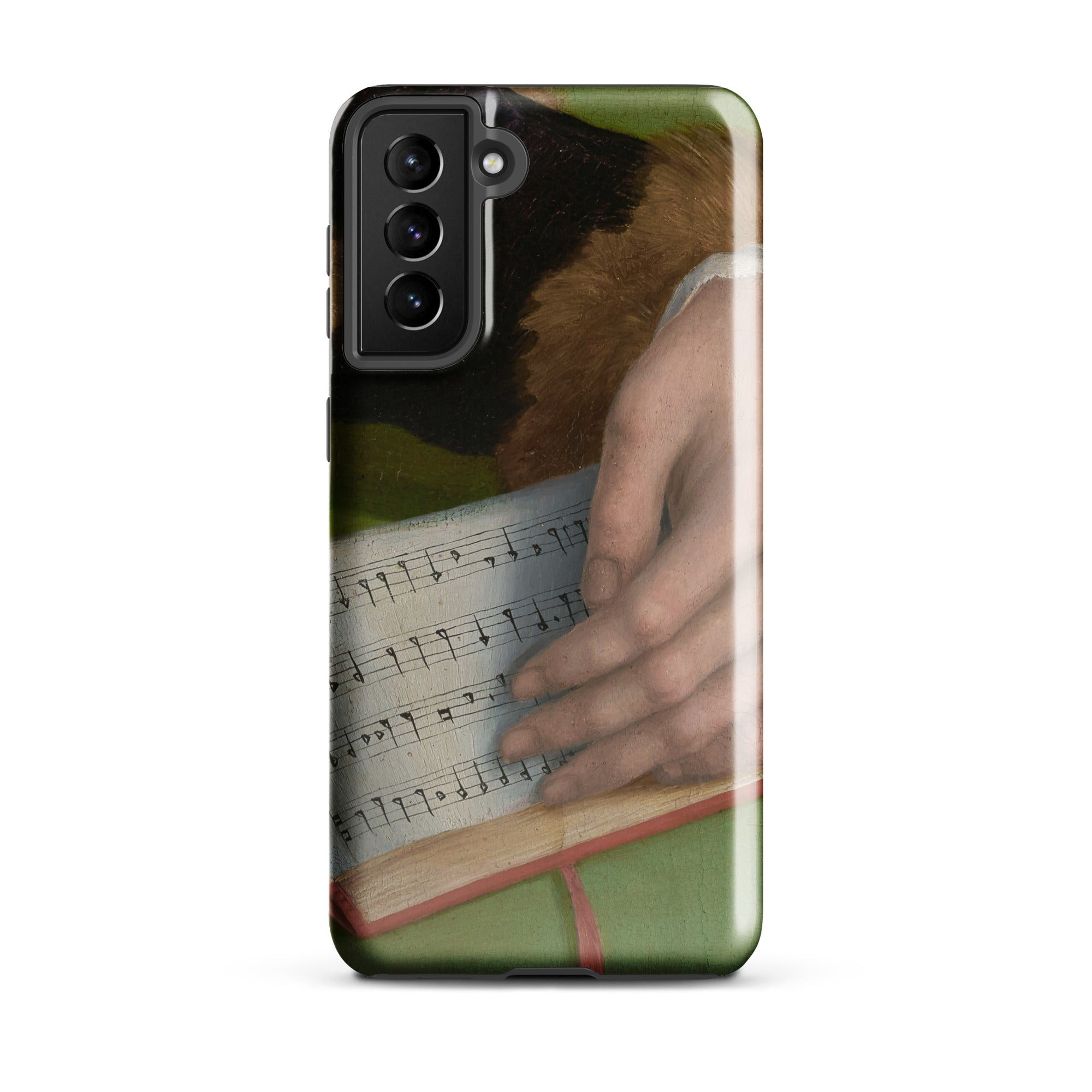 Cette coque Samsung préserve un moment suspendu. Doigt en suspens entre la pensée et le son. Transformant un fragment de portrait florentin en un talisman pour l'harmonie, le tempo et la grâce mesurée. Protectrice mais artistique, elle transporte des chansons de luth, des échos de madrigaux et le doux bruissement des pages tournées partout où le téléphone voyage.