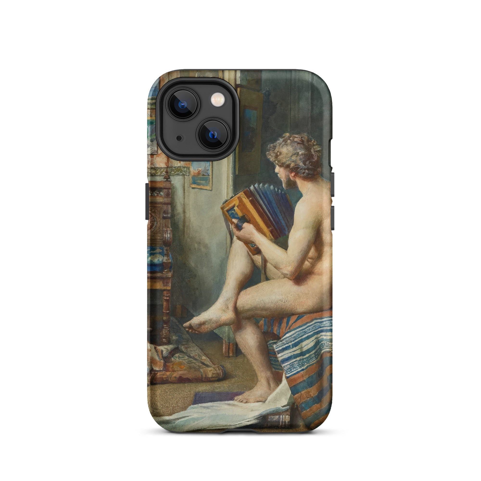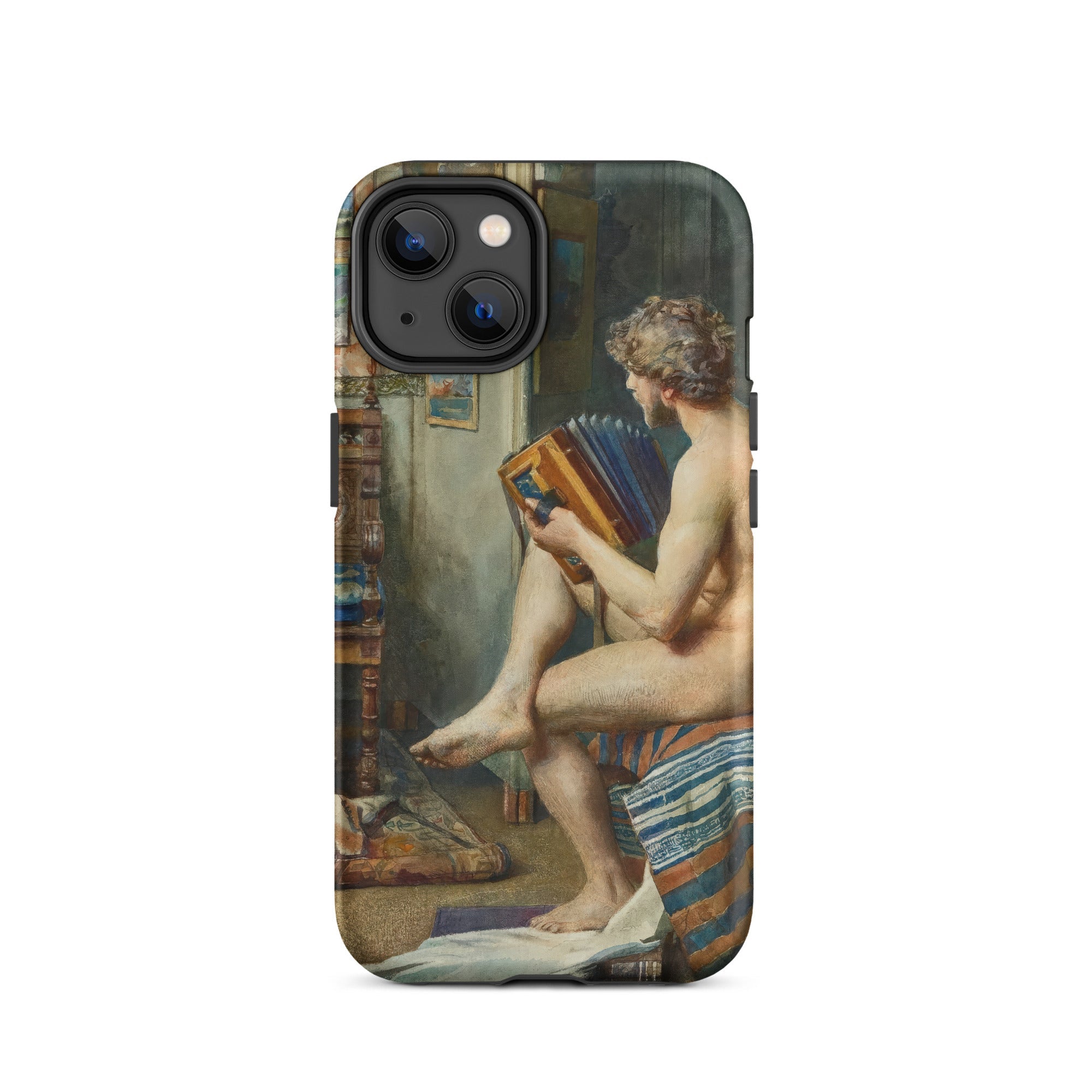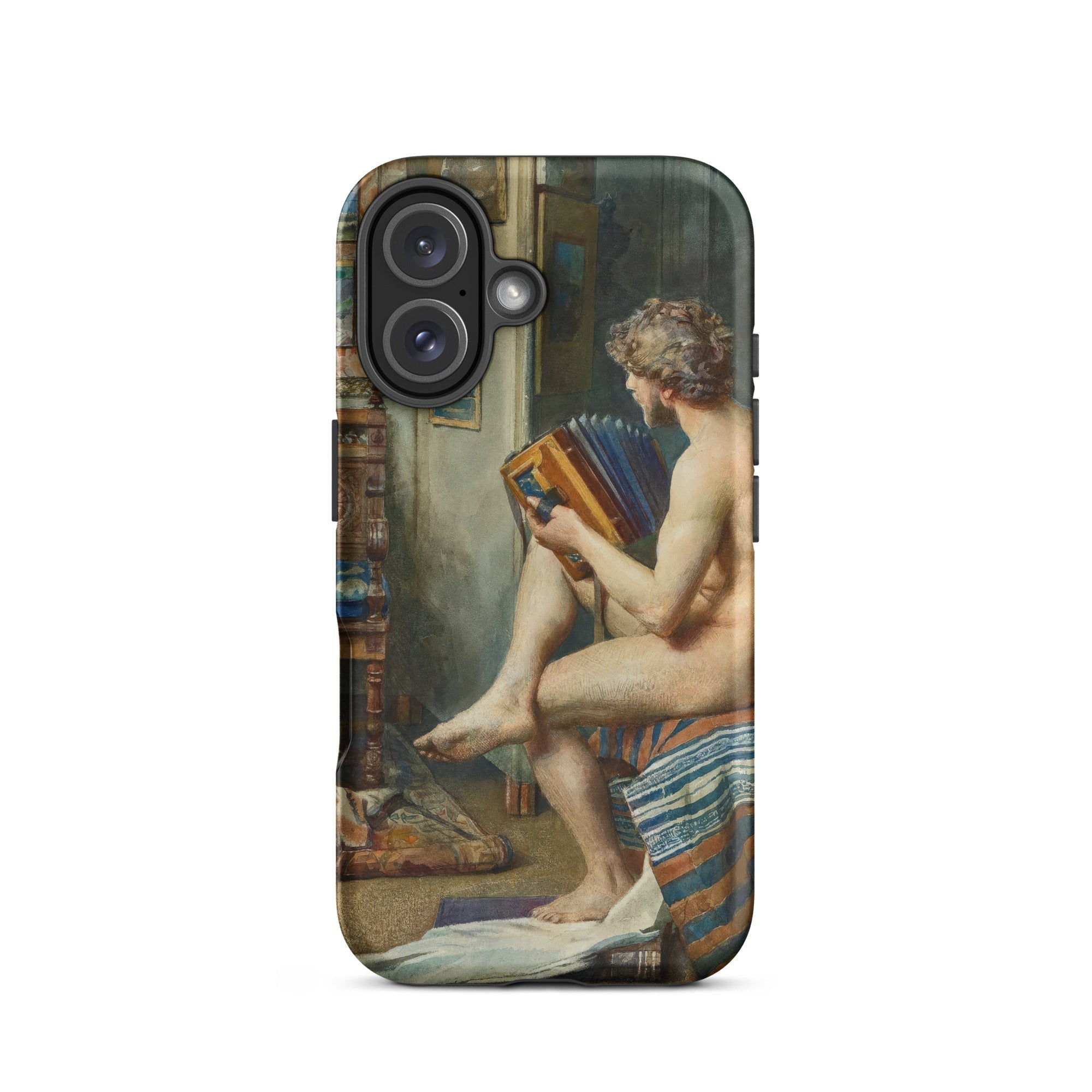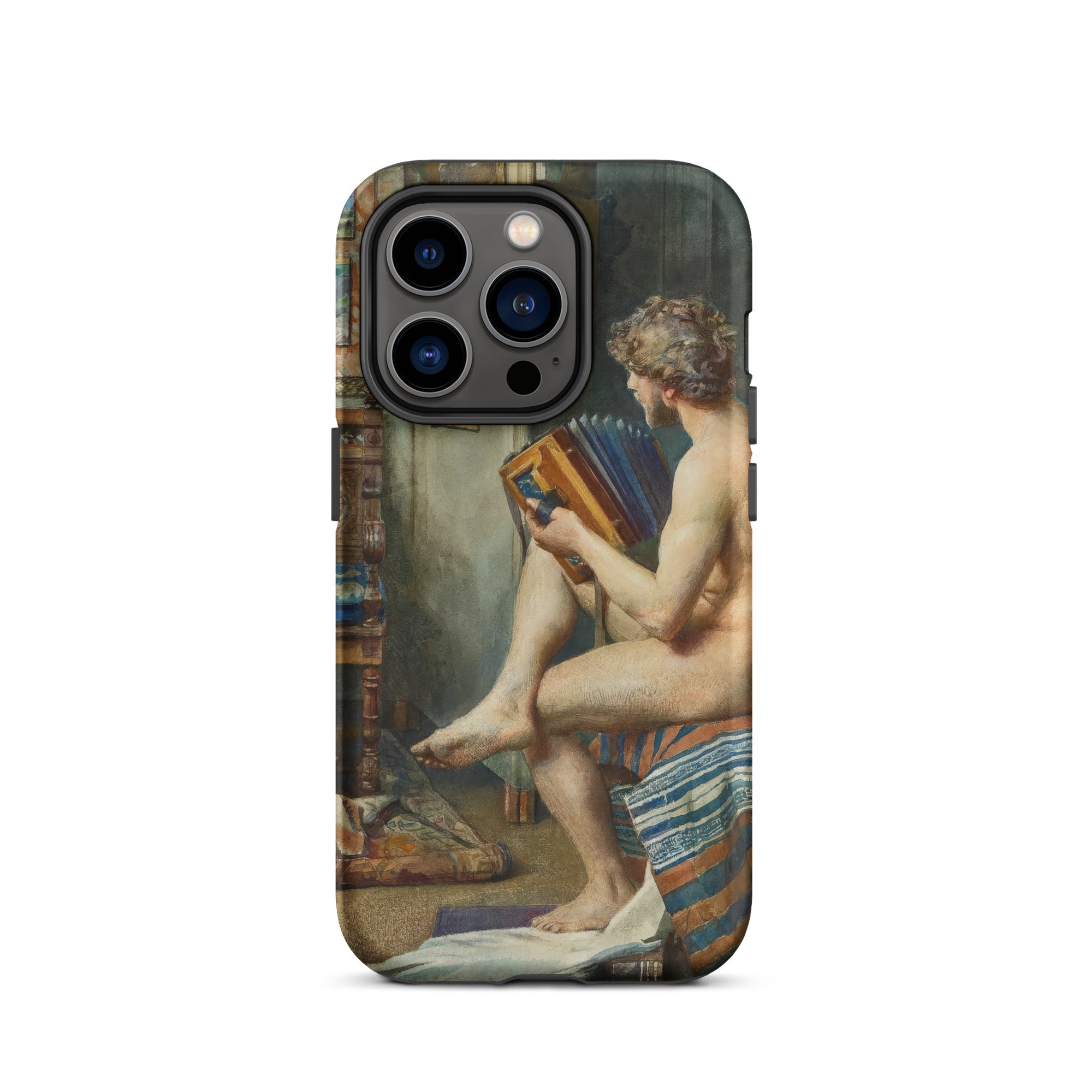 L'accordéon respire, ses soufflets plissés reflétant les courbes souples du corps. L'esthétisme et le naturalisme s'entrelacent dans ce portrait de solitude créative, où les textiles—lin provençal rayé, coton drapé, et tapisserie éparpillée—encadrent la composition avec un air de nonchalance étudiée. Ce n'est pas juste une coque d'iPhone d'histoire de l'art; c'est un dialogue entre la peinture de salon française, les sous-entendus homoérotiques dans l'art du XIXe siècle, et la rébellion silencieuse de la beauté masculine. Portez un chef-d'œuvre, bercez un moment—laissez l'histoire glisser entre vos mains.