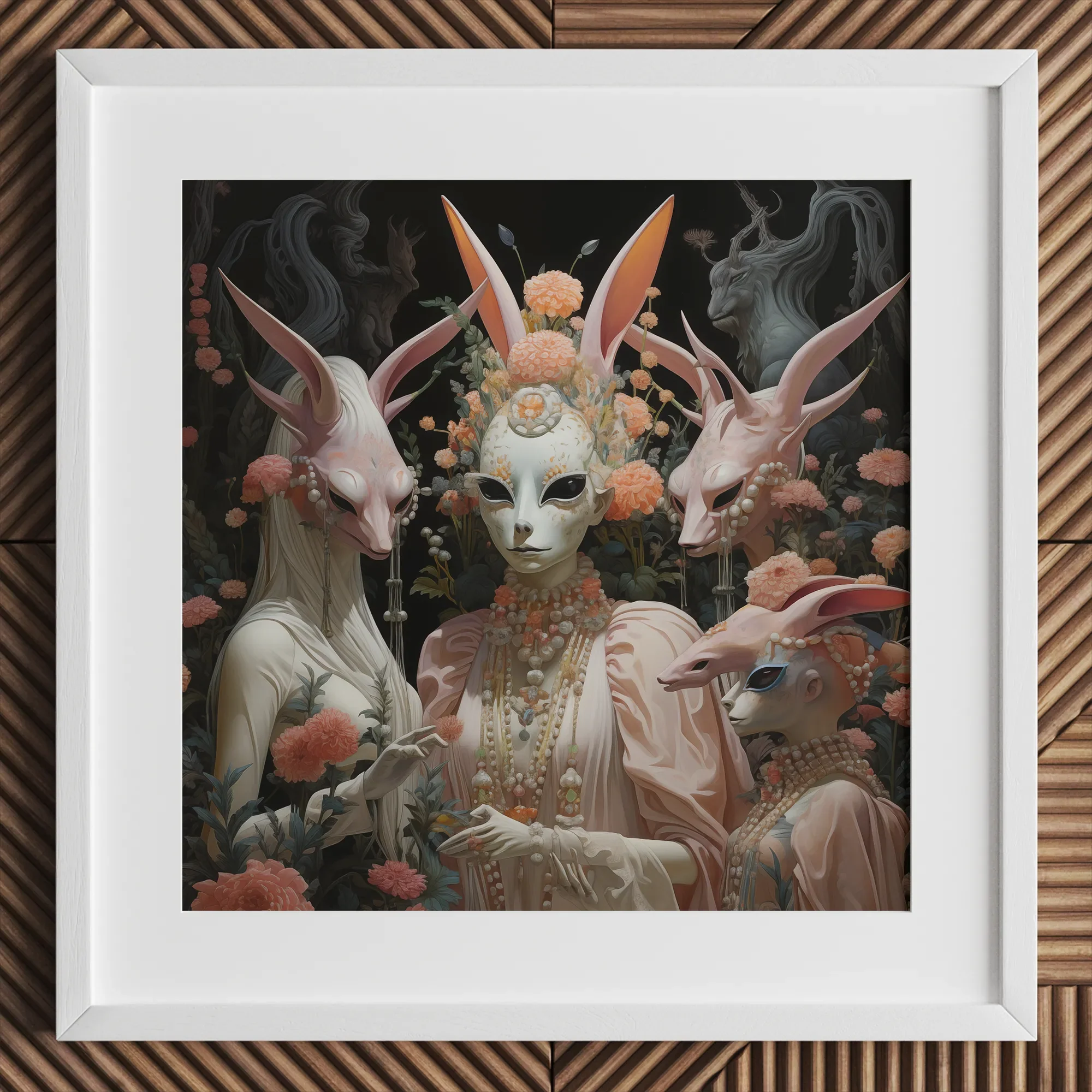 Dans le crépuscule étrange d'une Renaissance extraterrestre, où la flore fleurit en harmonie surréaliste avec les figures extraterrestres d'un autre monde se dresse enrobé de soies douces et de pêches. Leurs oreilles allongées, austère sur le fond sombre, évoquent une allure troublante mais étrangement royale. Chacun orné de couches de perles, des perles complexes drapant leurs formes comme des secrets chuchotés d'une autre dimension. Leurs yeux creux et creux regardent une intensité qui se sent à la fois ancienne et futuriste - des porteurs de sagesse intemporelle au-delà de notre compréhension.