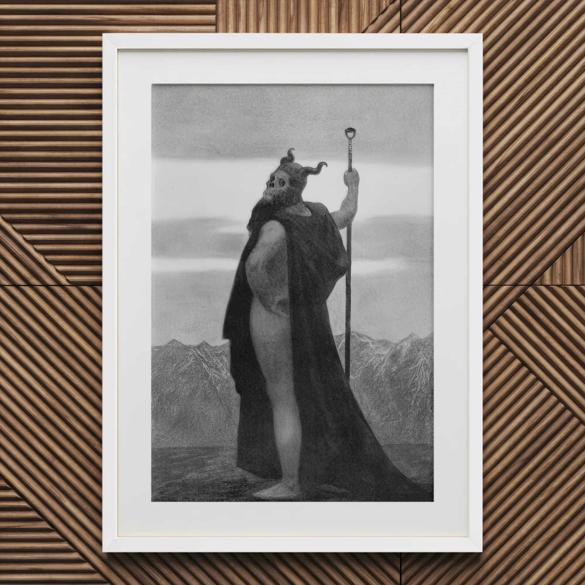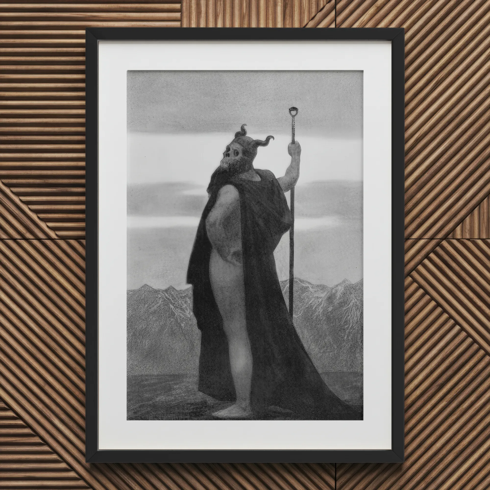 Dans Death (1904), Sascha Schneider façonne la mortalité en muscle et en pierre. Le nu colossal, drapé dans un linceul noir qui absorbe la lumière, incarne le mysticisme fin-de-siècle et la défiance nietzschéenne. Son casque en forme de crâne fixe l'horizon, où des sommets vaporeux se dissolvent dans une pâle radiance. Chaque tendon, chaque contour ciselé brille comme du marbre réchauffé par la prophétie.