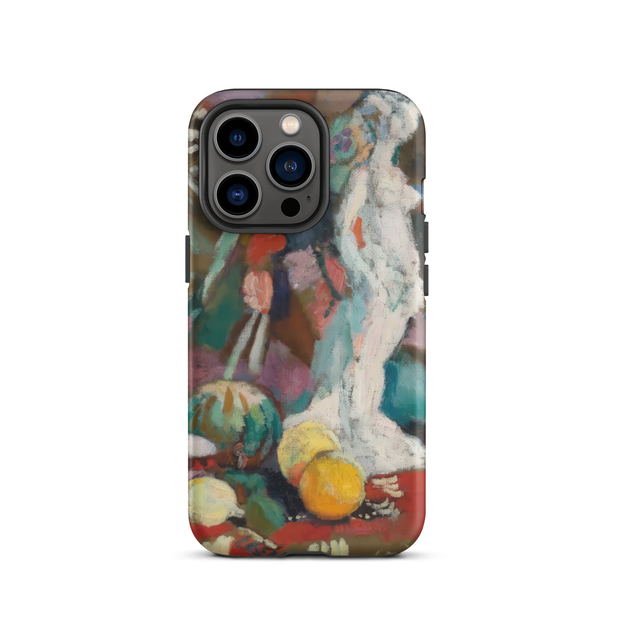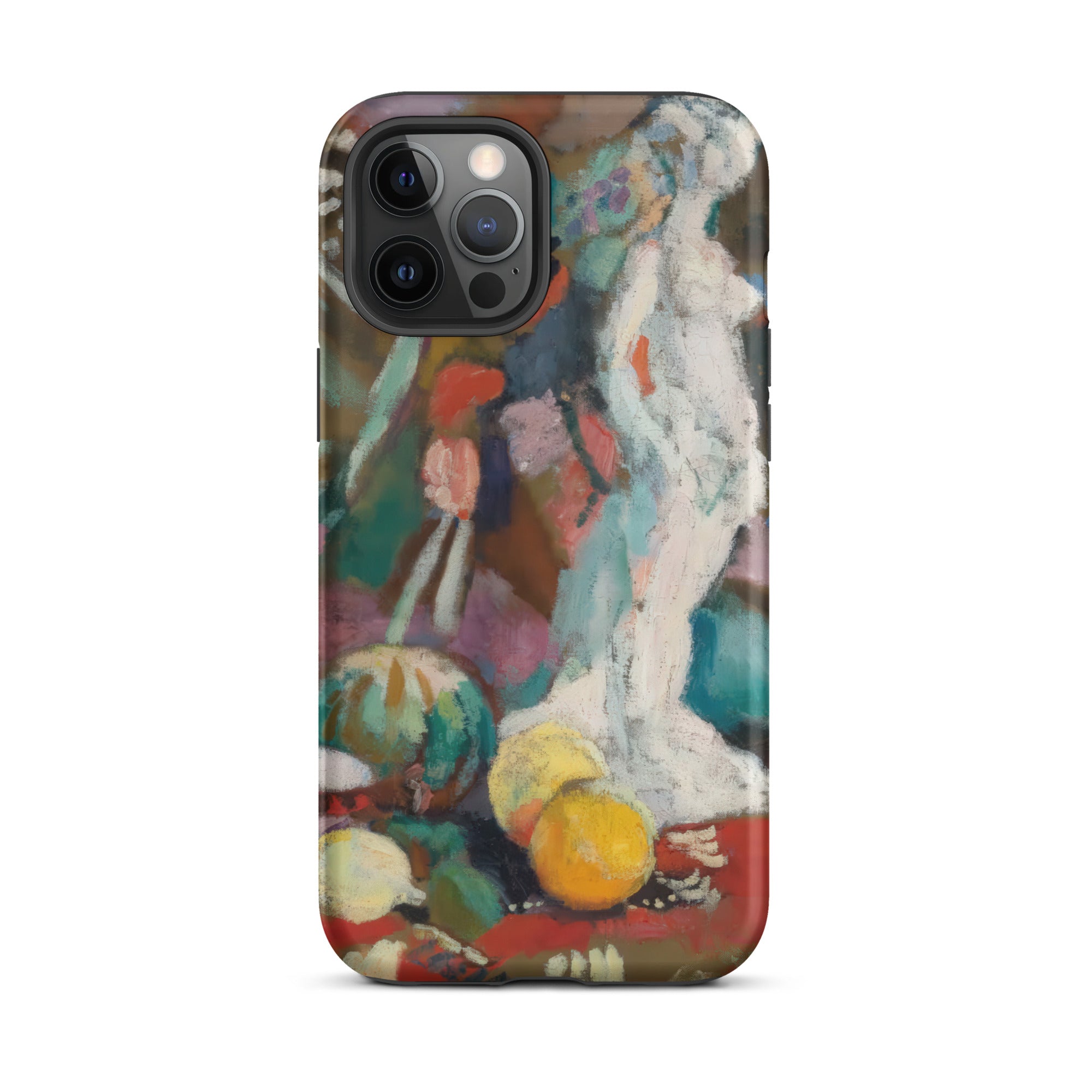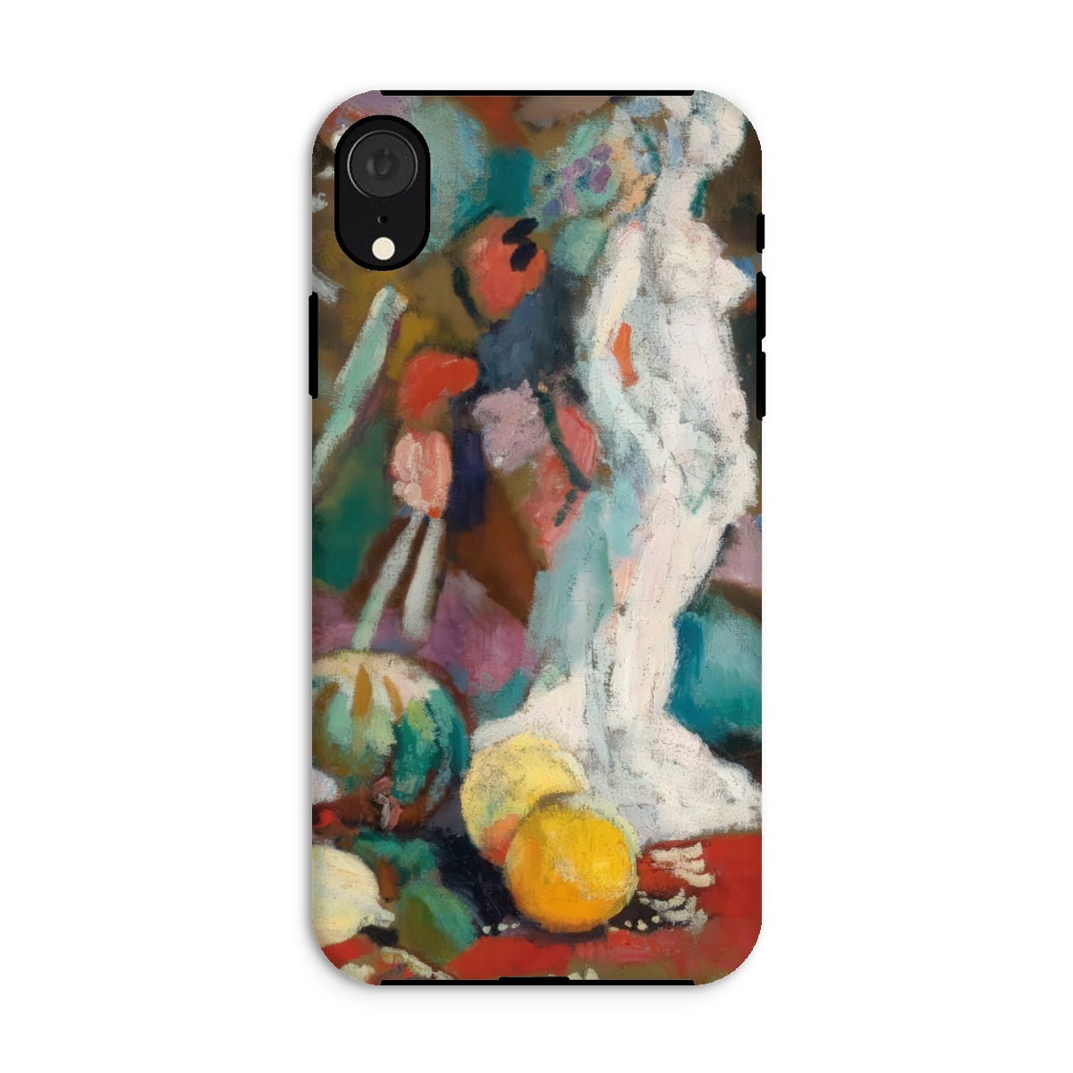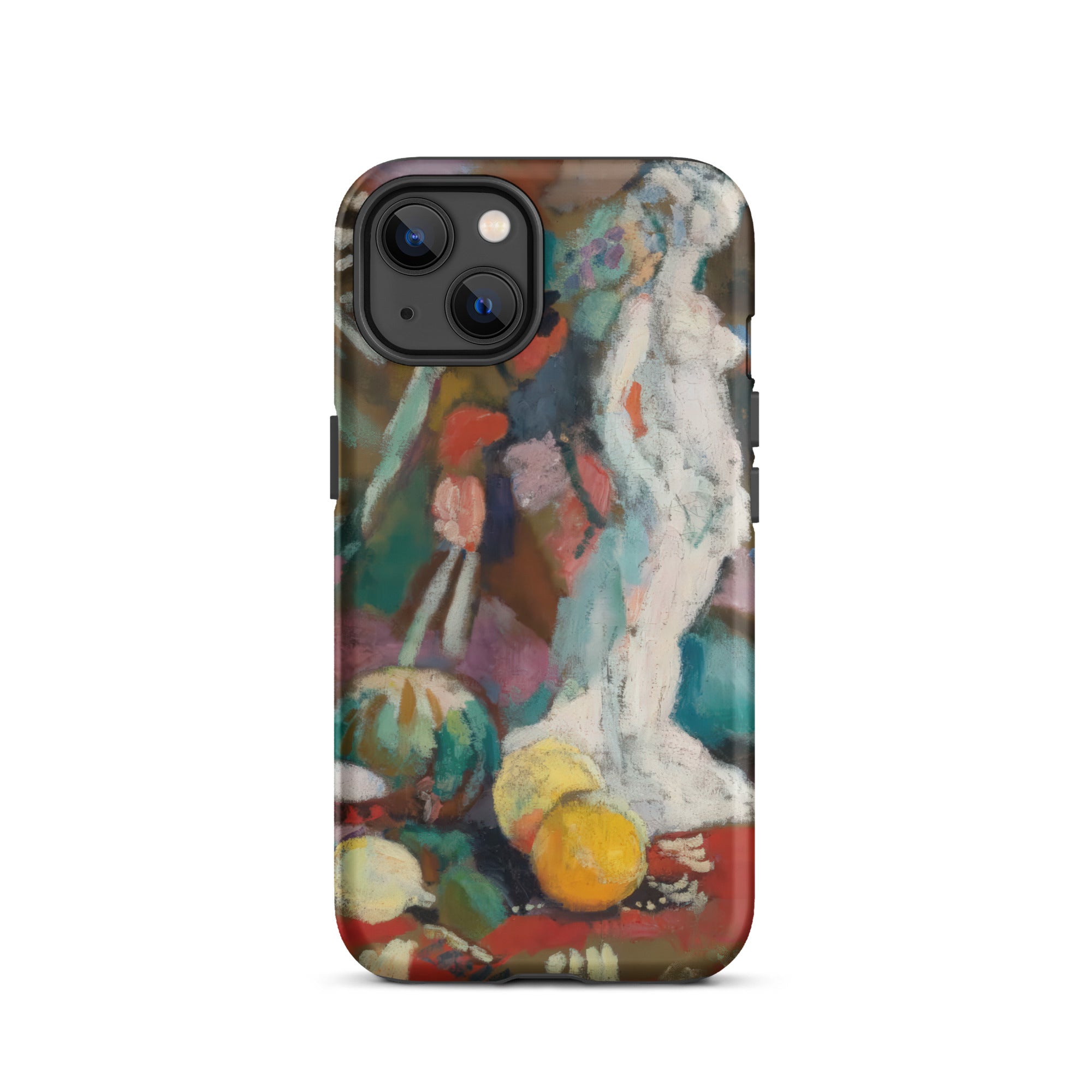 Imprégné de l'intensité fiévreuse du fauvisme, cette coque iPhone de Henri Matisse transforme votre appareil en un portail de rébellion moderniste. Nature morte avec figure en plâtre palpite avec une couleur brute et déchaînée—le turquoise et le vermillon s'affrontent, dissolvant la forme en sensation. La sculpture blanche, un écho de la tradition gréco-romaine, se dresse spectrale au milieu d'une nature morte onirique, où la perspective aplatie et le coup de pinceau sauvage défient la rigidité du réalisme classique.