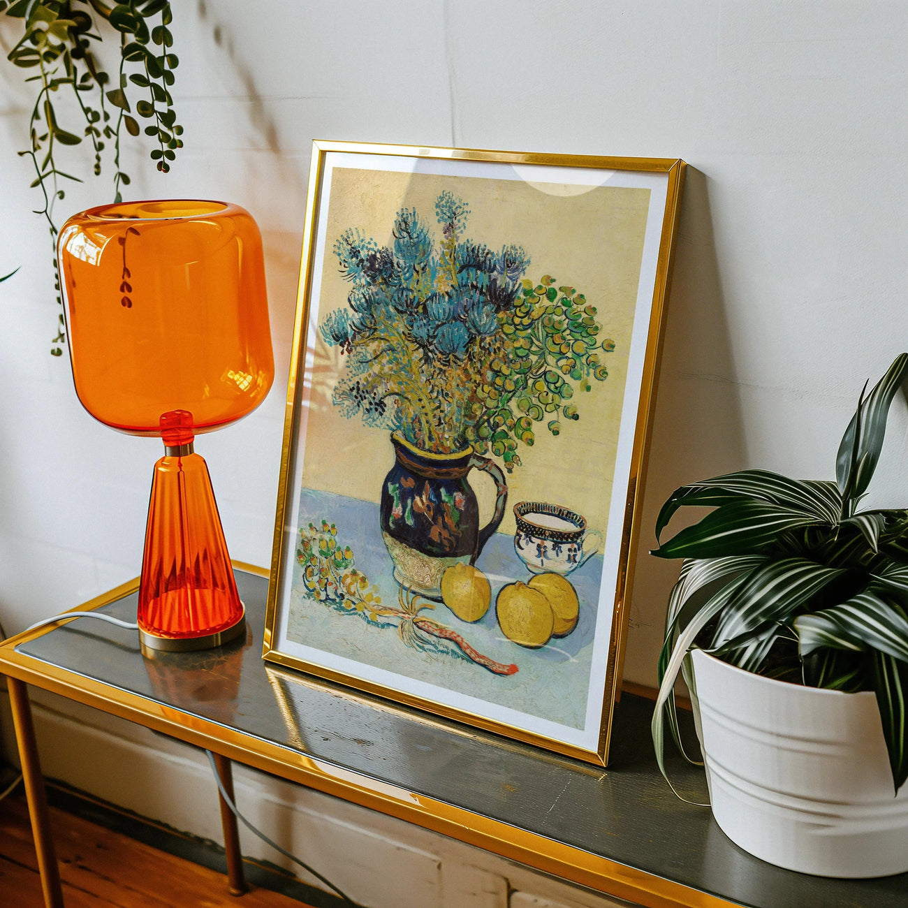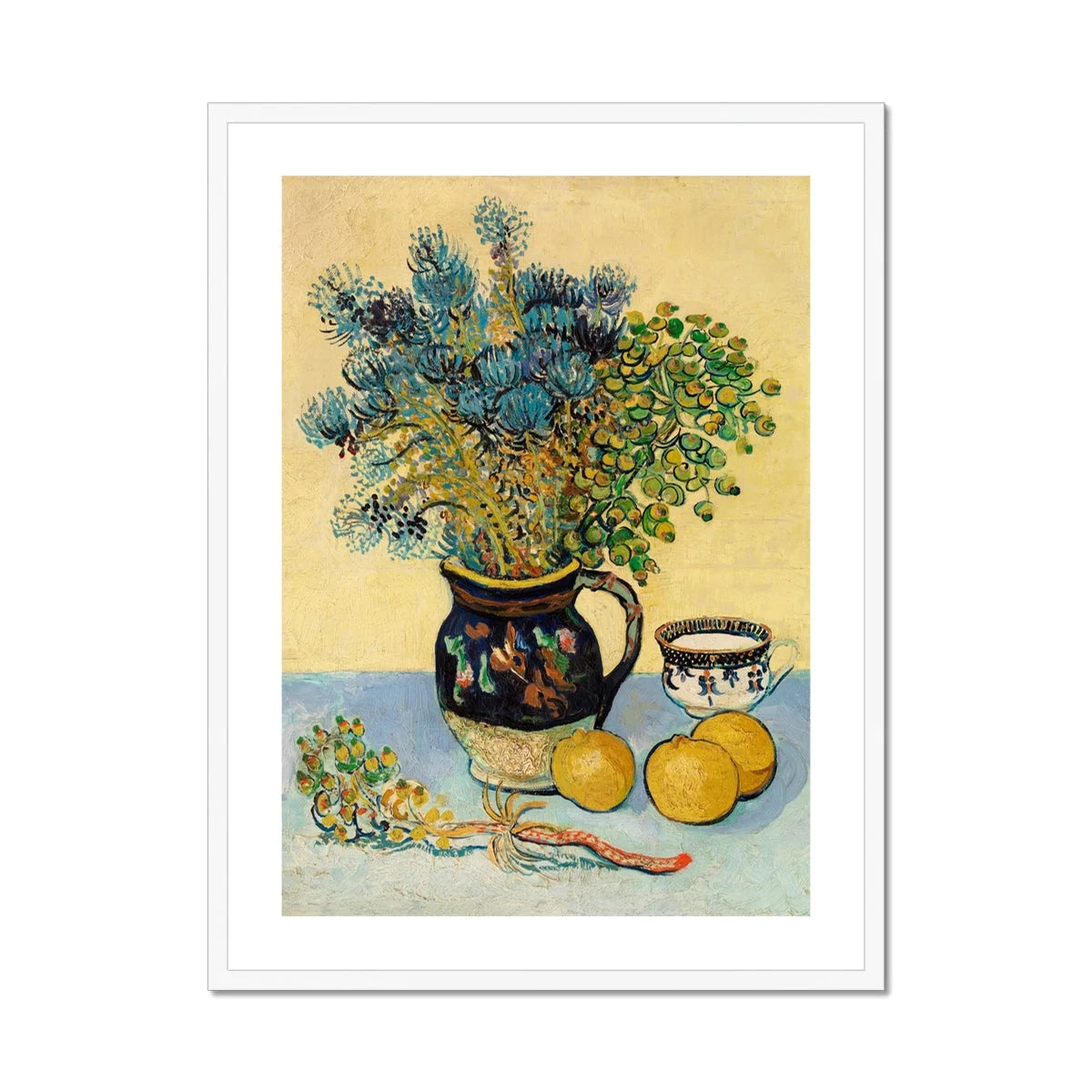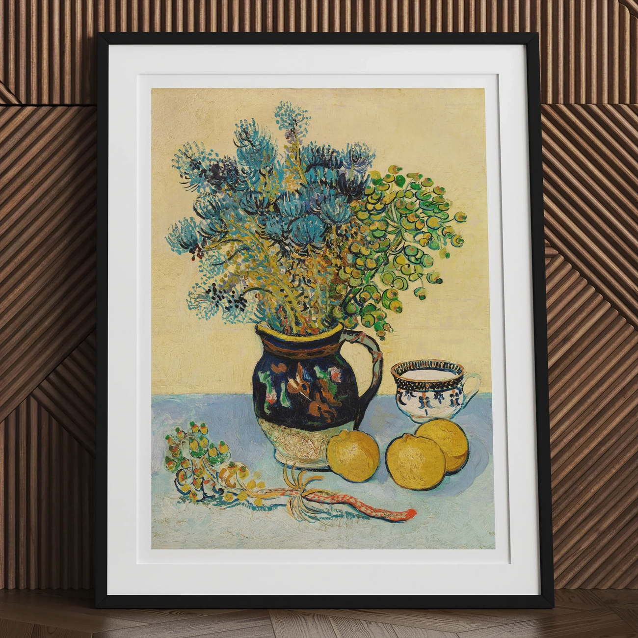 Le génie de Van Gogh pour la couleur transparaît dans chaque détail. Le fond ocre offre un contraste chaleureux avec les fleurs bleues fraîches, tandis que des citrons jaunes vifs ajoutent une touche de peps. Une délicate tasse de thé et sa soucoupe complètent le charmant tableau, vous invitant à faire une pause et à savourer les plaisirs simples de la vie.