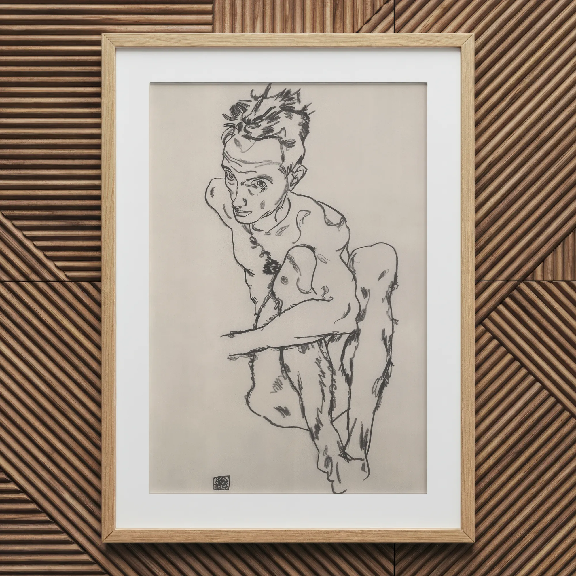 Le moi de Schiele est à la fois sanctuaire et rictus, vaniteux et primal, tenant une posture qui ne séduit pas — elle invoque. Pas juste un corps. Un miroir fait de ligne, de honte et de chair.