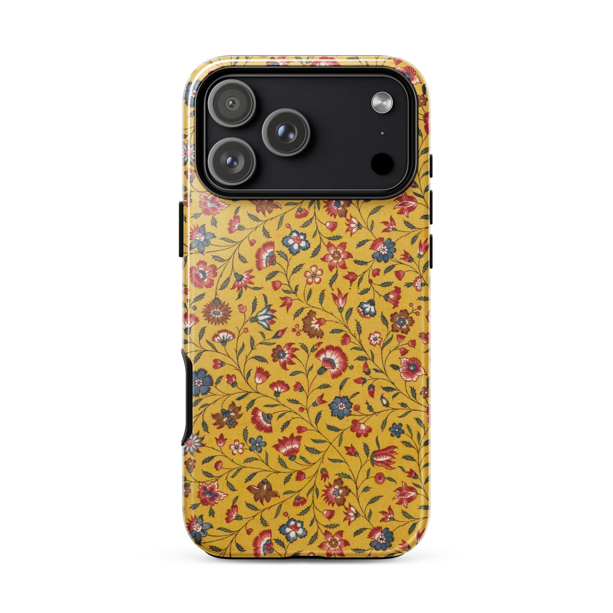 Le sol teinté de safran sature l'œil avant que les fleurs ne prennent racine. Cet étui pour iPhone en tissu à motif de fleurs d'œillets porte la grammaire visuelle des traditions du chintz indo-européen—des textiles de commerce du seizième siècle qui ont voyagé à travers les navires portugais et les entrepôts néerlandais avant de s'installer dans les salons anglais.