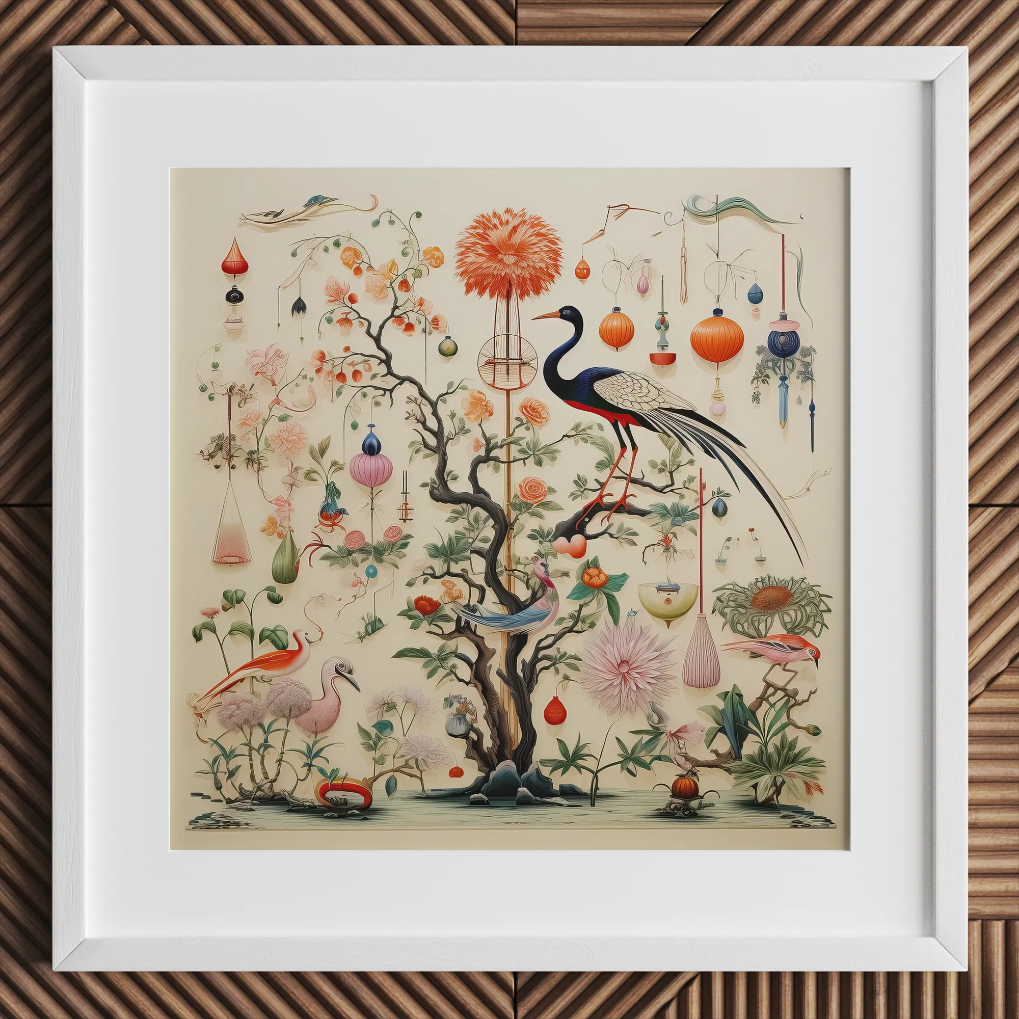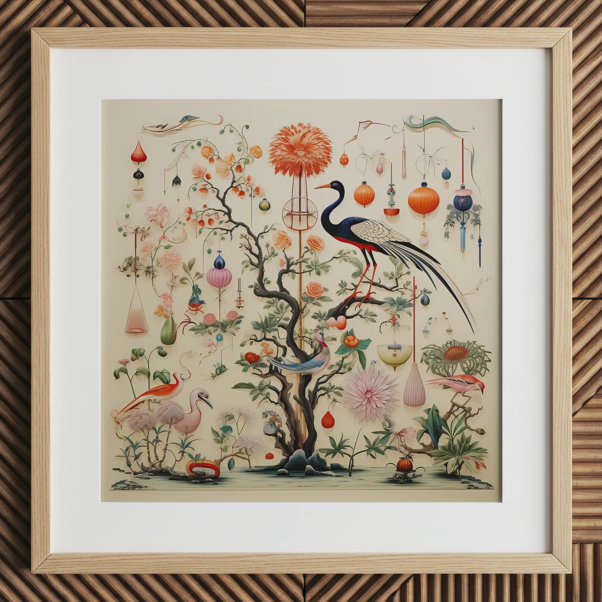 Cette pièce mélange magistralement des éléments de l'art traditionnel chinois, Art Nouveau L'esthétique et le surréalisme contemporain, résultant en une exploration visuellement riche de la taxonomie imaginaire. Les détails complexes et l'imagerie symbolique invitent les téléspectateurs à s'immerger dans ce domaine fantastique, où la nature et l'artifice s'entrelacent dans une célébration de la diversité et de l'imagination.