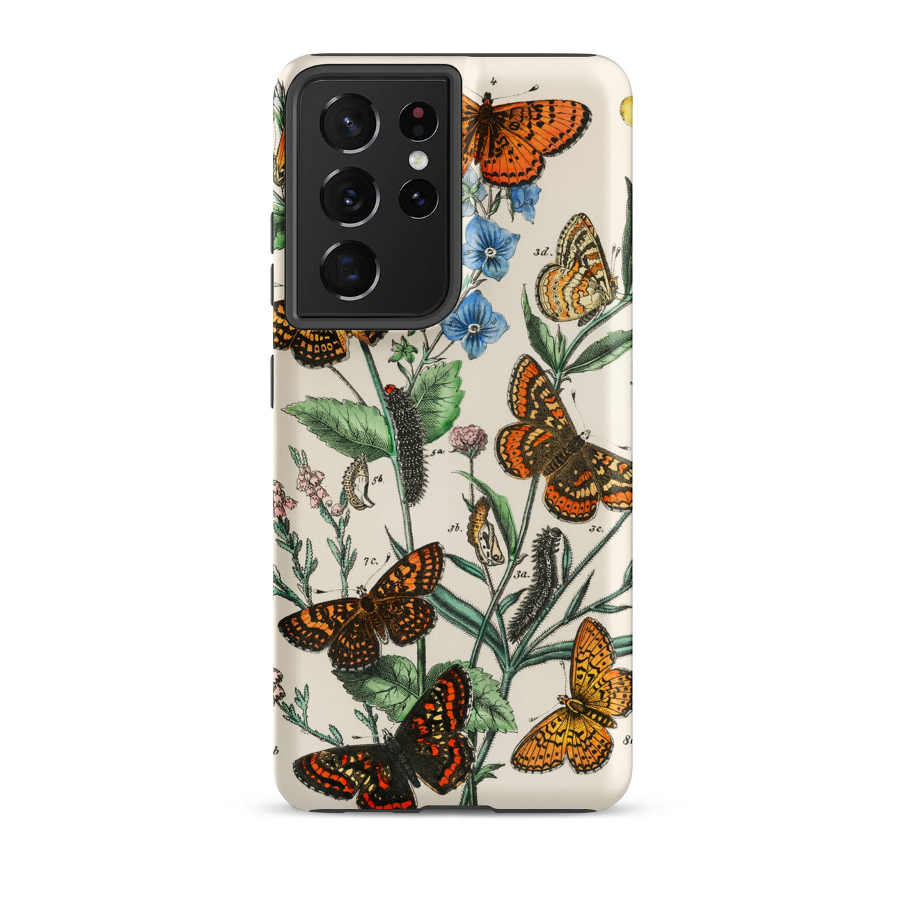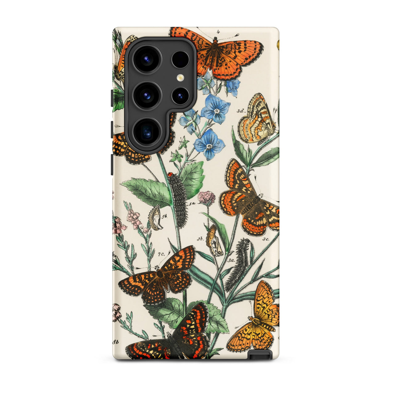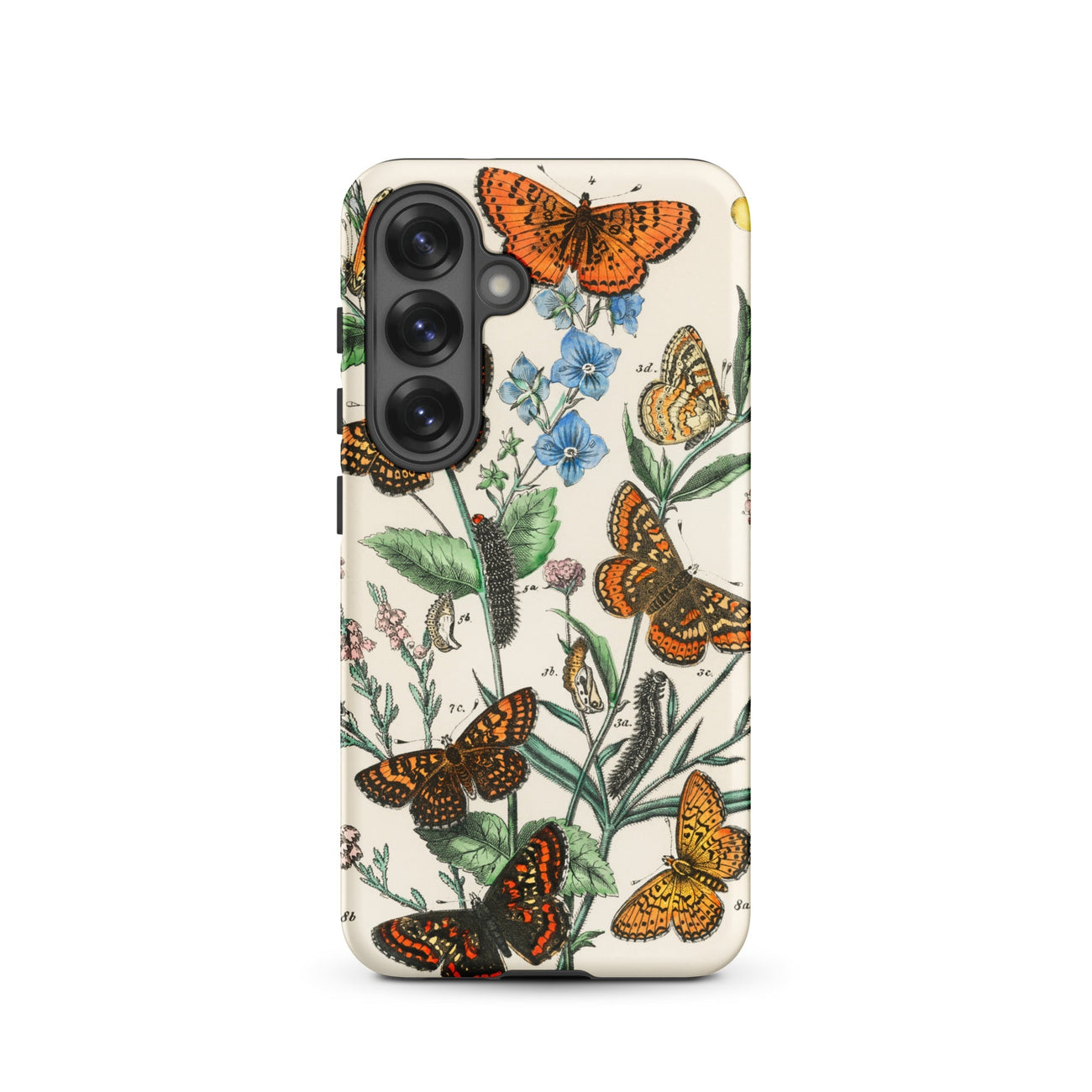 Cette coque Samsung devient un cabinet de curiosités miniature, où l'histoire naturelle victorienne croise le design portable. Chaque chrysalide, chaque veine tracée en lignes de cuivre, évoque la science du dix-neuvième siècle, la précision lithographique et le romantisme des carnets de croquis de terrain.
