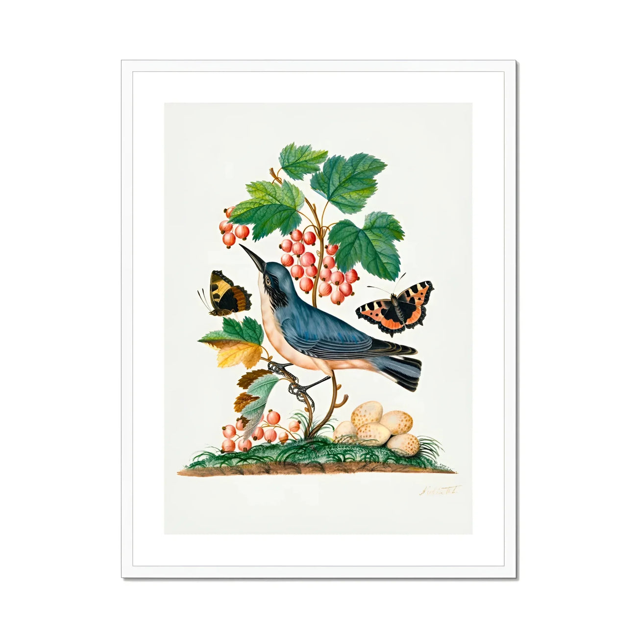 Cette impression de beaux-arts met en valeur la capacité étrange du naturaliste du Yorkshire à capturer les moments éphémères de la vie. Une Paruline subspine se perchage au milieu du feuillage luxuriant de la fraise, son plumage gris bleu un contraste frappant avec les fruits rubis. À proximité, un amiral rouge papillon Dépose ses ailes, tandis qu'un cocoon de guêpe et des fourmis industrieuses complètent ce drame microcosmique.