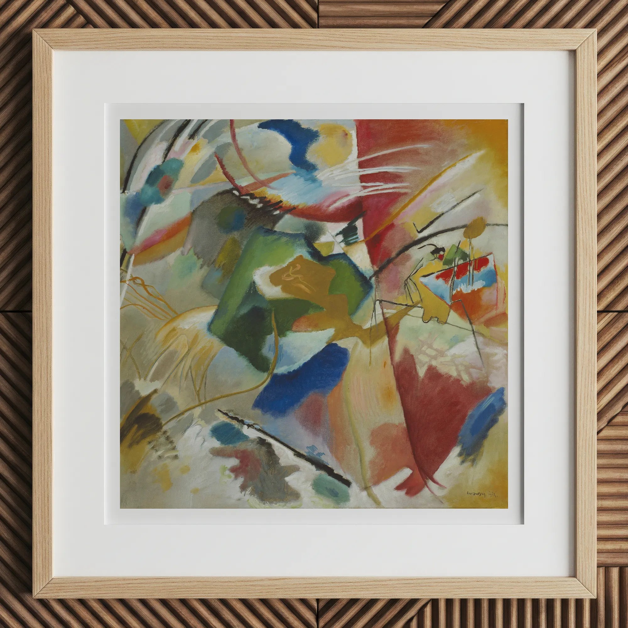 Vous posséderez une tranche de rébellion Der Blaue Reiter, où les points focaux de l'émeraude mènent un orchestre de teintes sauvages. Kandinsky's Strokes Pirouette à travers la toile, chacun fait un manifeste contre la tyrannie de la représentation.