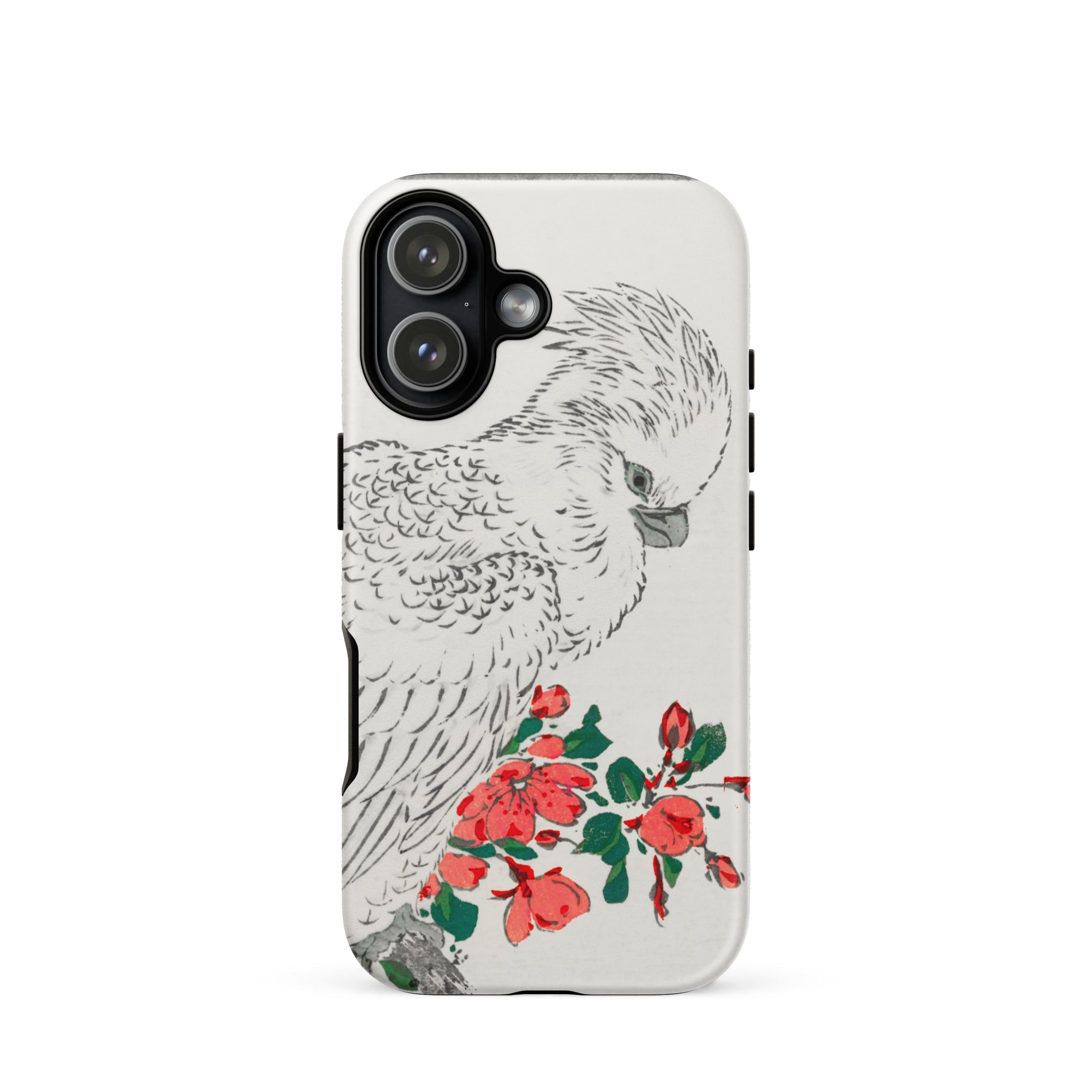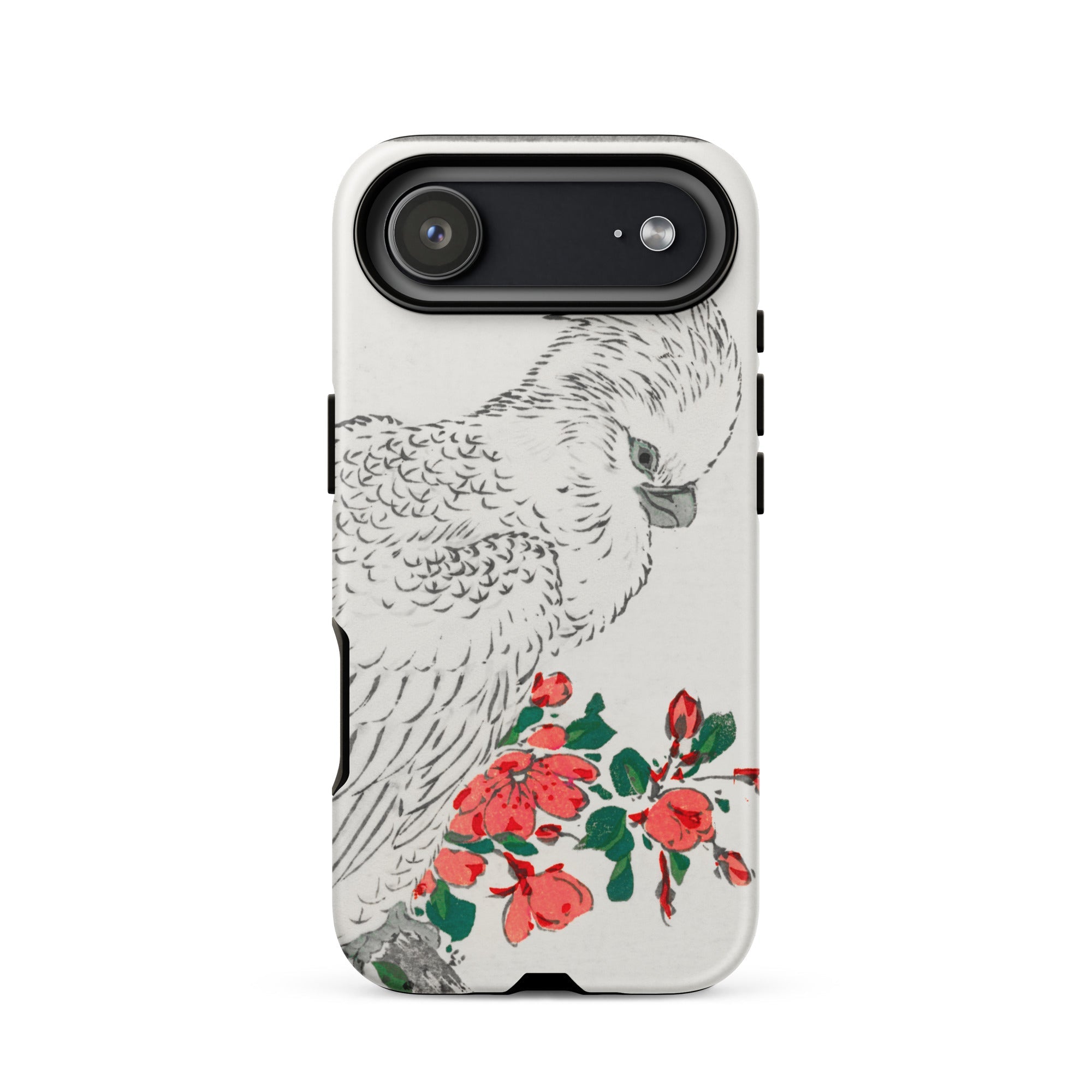Le funk à plumes rencontre la finesse florale dans cette armure iPhone. L'art aviaire de Numata Kashu défile sur votre technologie, une mixtape de l'ère Meiji des merveilles de la nature. Regardez ce perroquet, perché fièrement, scrutant les fleurs cramoisies avec une inquisition royale. Les pétales rouges éclatent, un riff de jazz visuel contre une toile blanche éclatante.